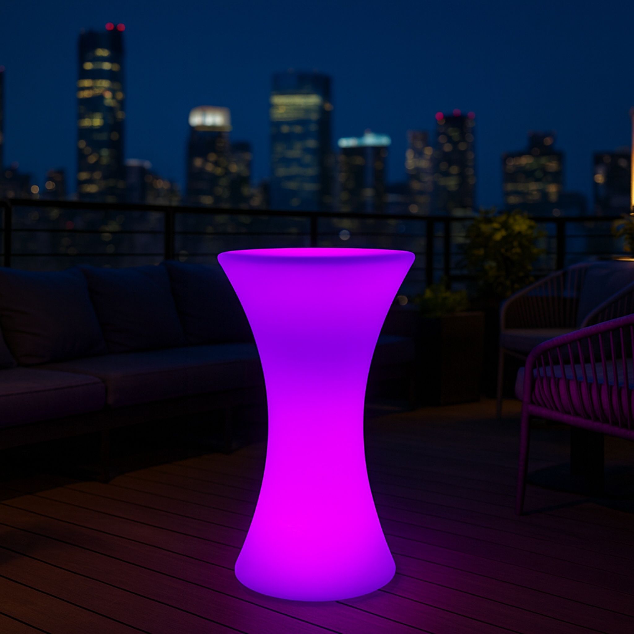 Tavolino alto luminoso da esterno dal design moderno, ideale per terrazze, giardini e locali. Adatto all’uso outdoor, permette di scegliere tra oltre trenta colorazioni di luce per personalizzare ogni atmosfera con stile ed eleganza.