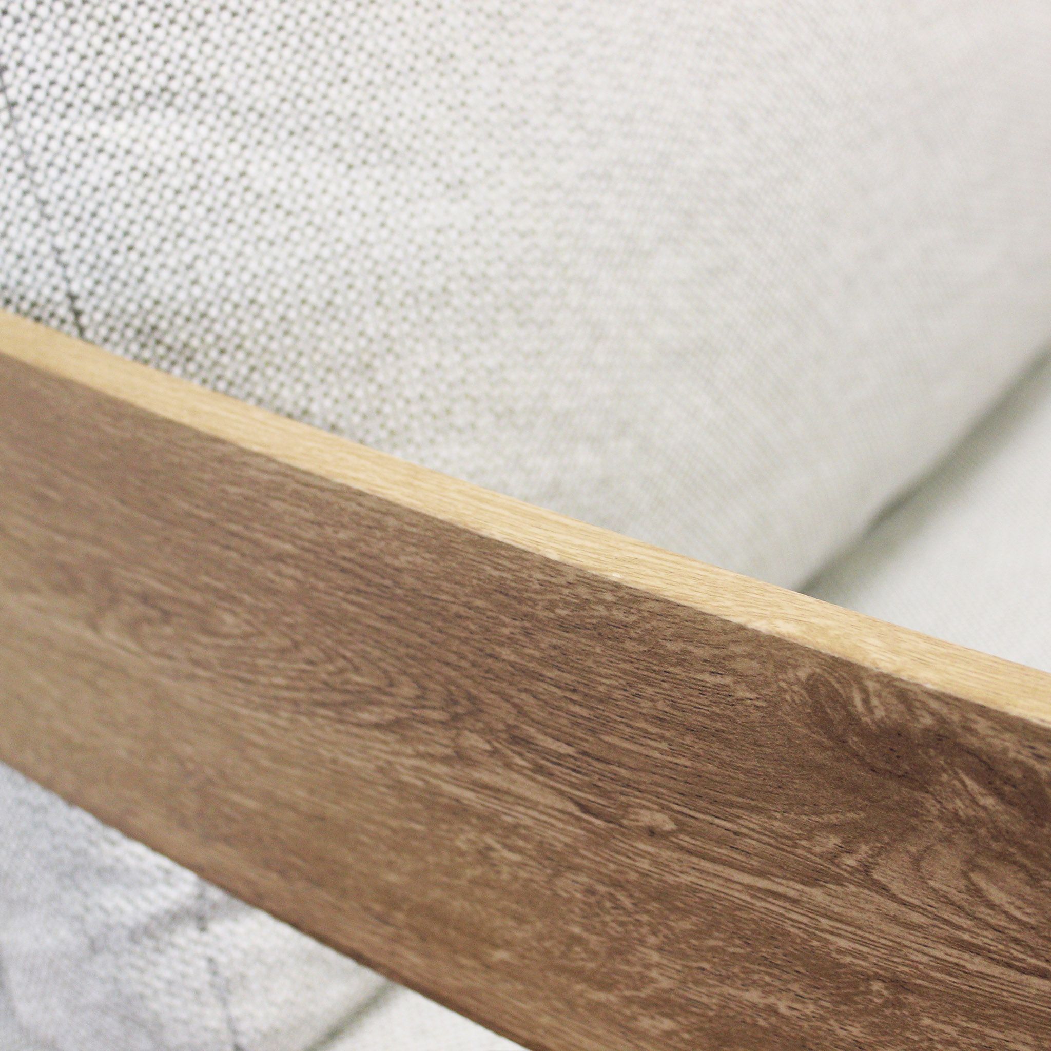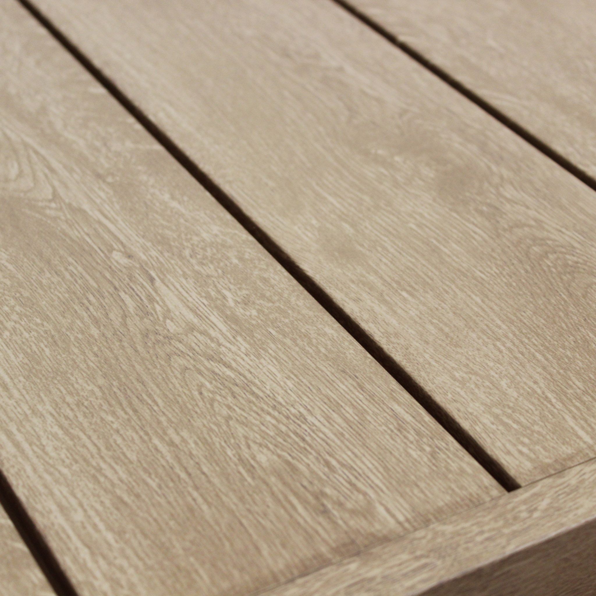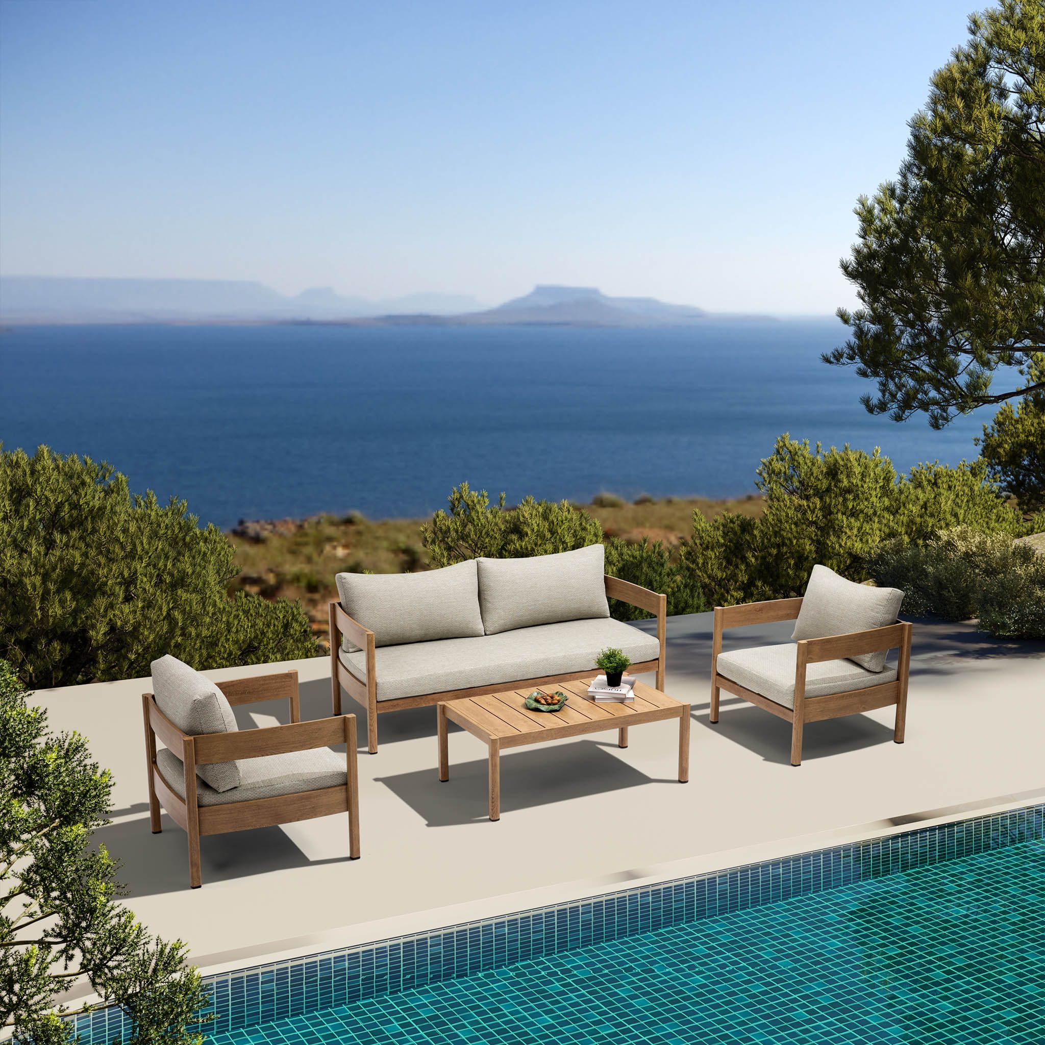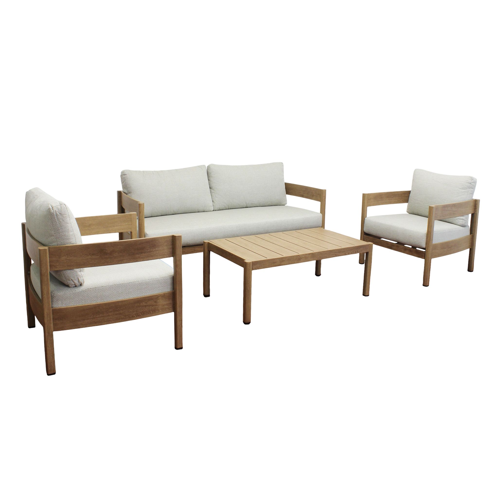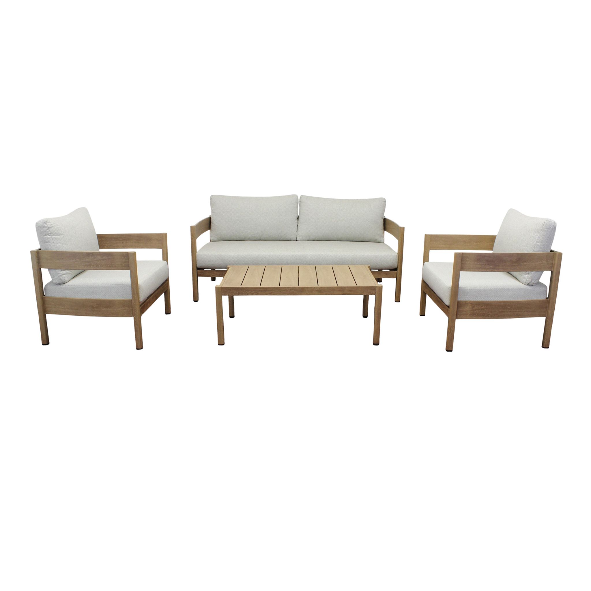 Salotto da esterno elegante e funzionale con struttura in alluminio effetto legno e cuscini in tessuto idrorepellente. Composto da divano a due posti, due poltrone e tavolino, è ideale per giardini, terrazzi e ambienti contract.