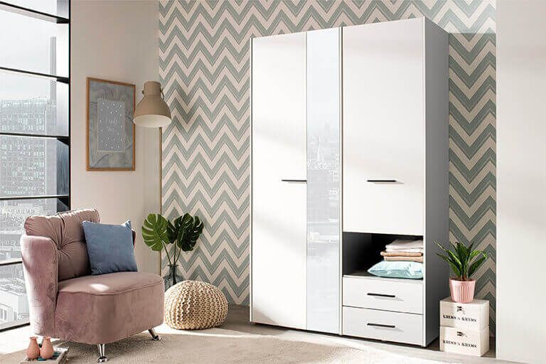 L'armadio con specchio ESSENZA è disponibile in 2 colori: bianco e rovere chiaro. E' disponibile anche una terza variante in rovere chiaro a 4 ante.
