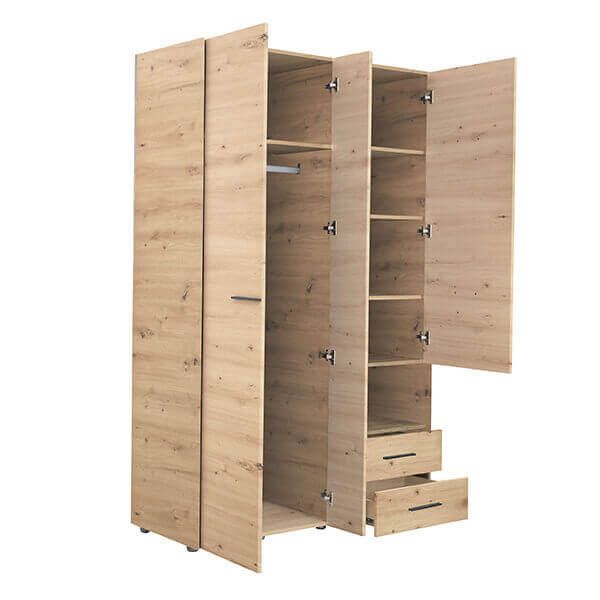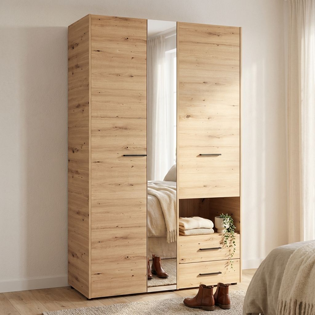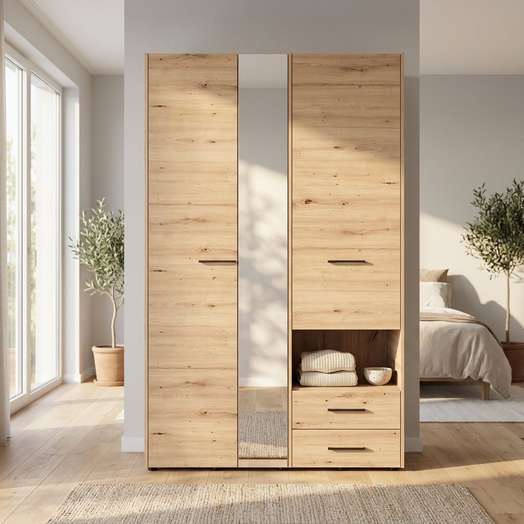L'armadio con specchio ESSENZA è disponibile in 2 colori: bianco e rovere chiaro. E' disponibile anche una terza variante in rovere chiaro a 4 ante.