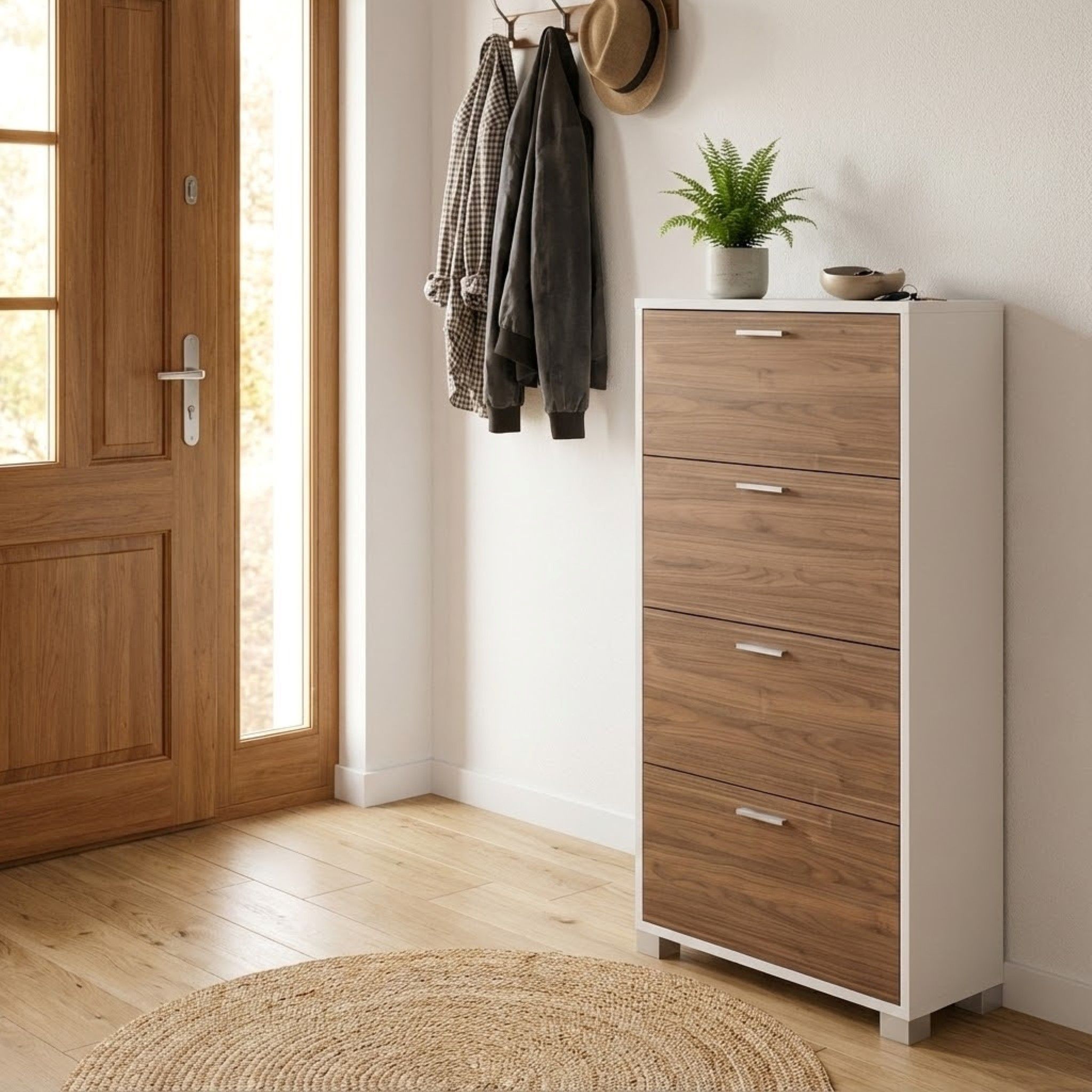 ESSENZA, con le sue 4 ante, rappresenta l'equilibrio perfetto tra forma e funzione. Una scarpiera che offre eleganza e capacità organizzativa, adattandosi con grazia e discrezione a ogni ambiente domestico. Disponibile in bianco/noce chiaro, noce chiaro/bianco, noce/nero e bianco ossido/grigio.