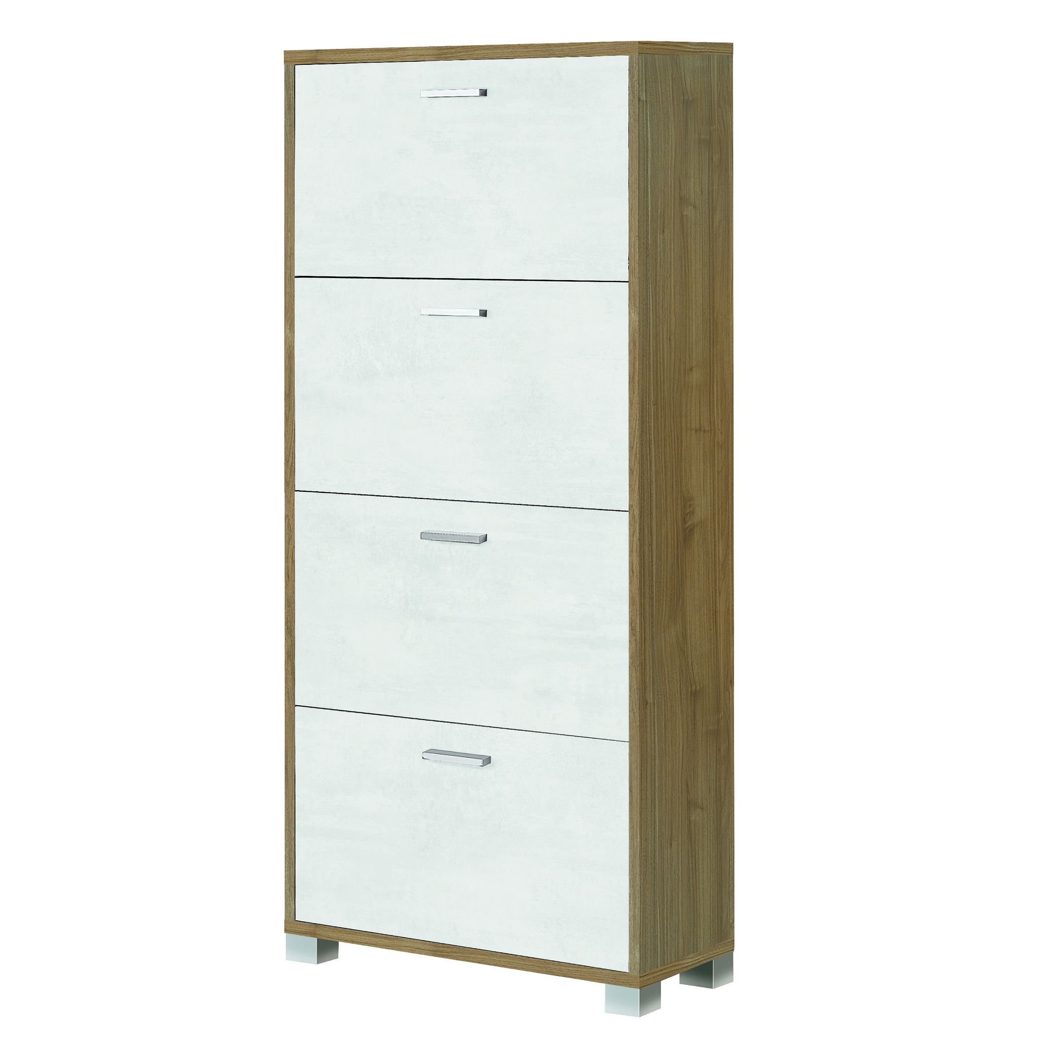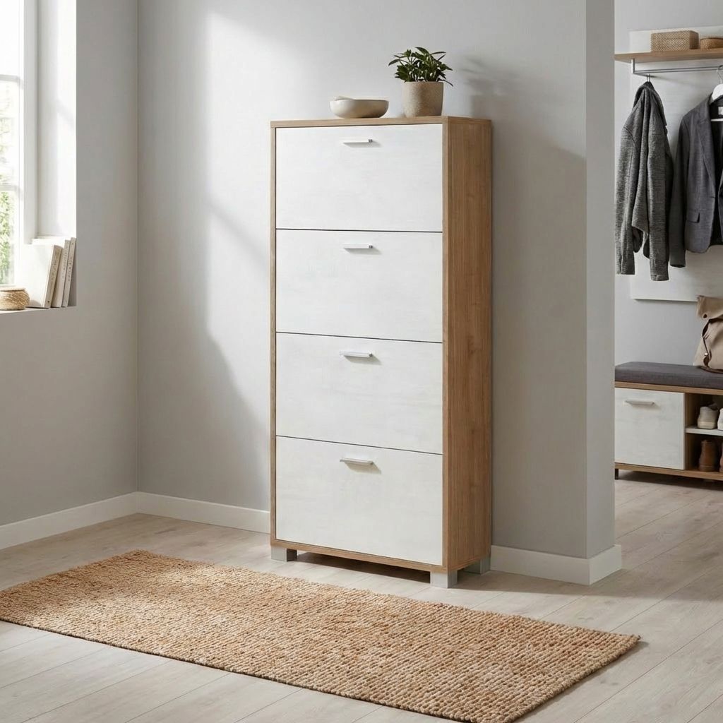ESSENZA, con le sue 4 ante, rappresenta l'equilibrio perfetto tra forma e funzione. Una scarpiera che offre eleganza e capacità organizzativa, adattandosi con grazia e discrezione a ogni ambiente domestico. Disponibile in bianco/noce chiaro, noce chiaro/bianco, noce/nero e bianco ossido/grigio.