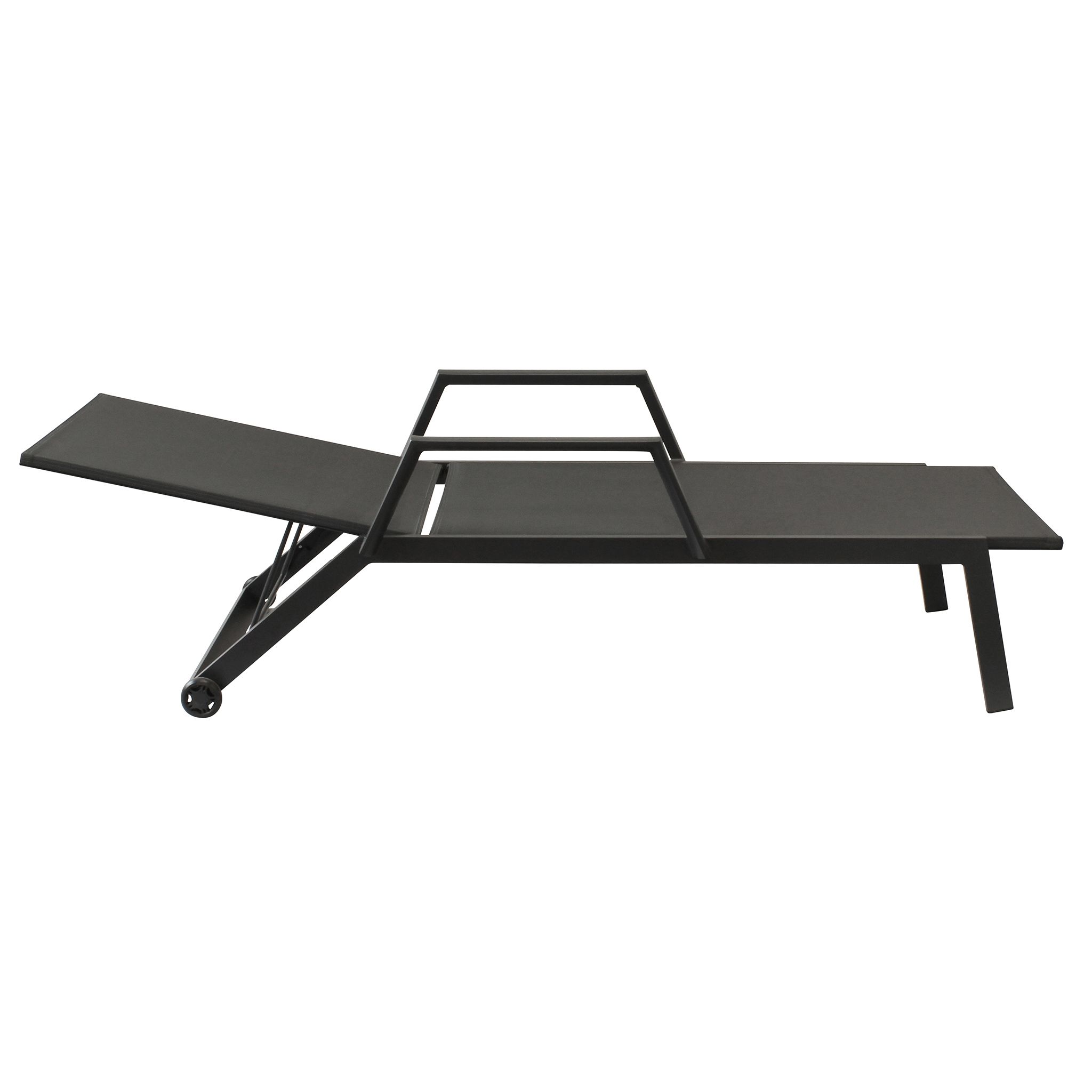 Lettino prendisole con struttura in alluminio saldato e textilene. I braccioli integrati e le ruote posteriori lo rendono pratico da spostare. Impilabile, perfetto per spazi ridotti. Disponibile in bianco e antracite, ideale per giardini, piscine e terrazze.