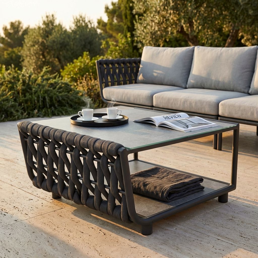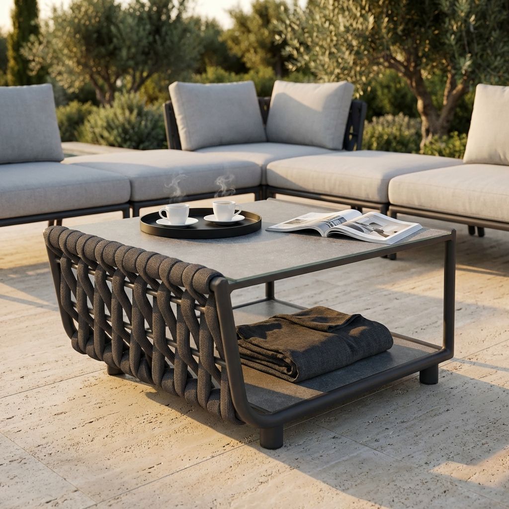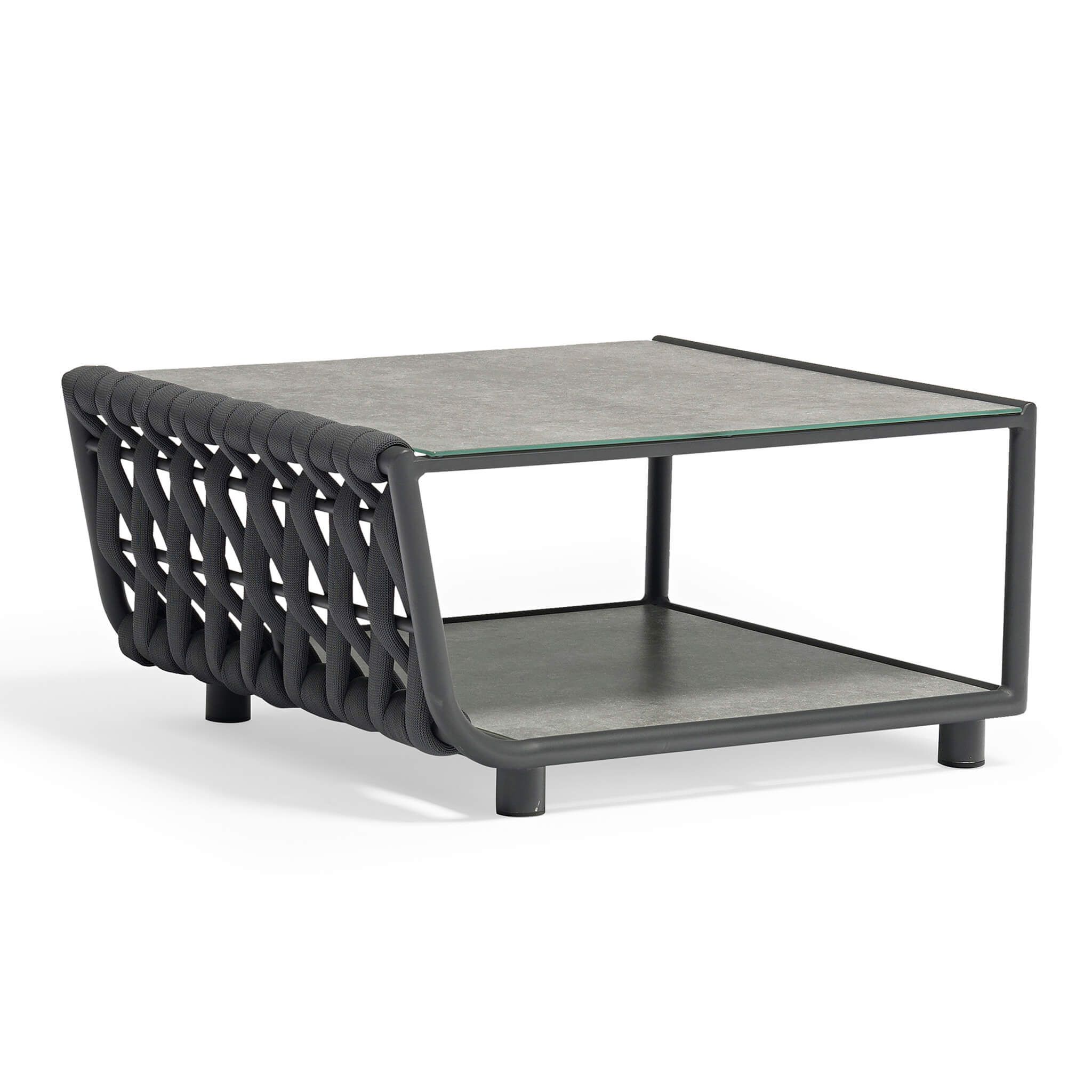 FLORES tavolino è un tassello dello straordinario mosaico che potrai creare per il salotto componibile di altissima qualità ideale per esterno in elegante colore antracite. Struttura in alluminio e tessuto intrecciato in poliestere.