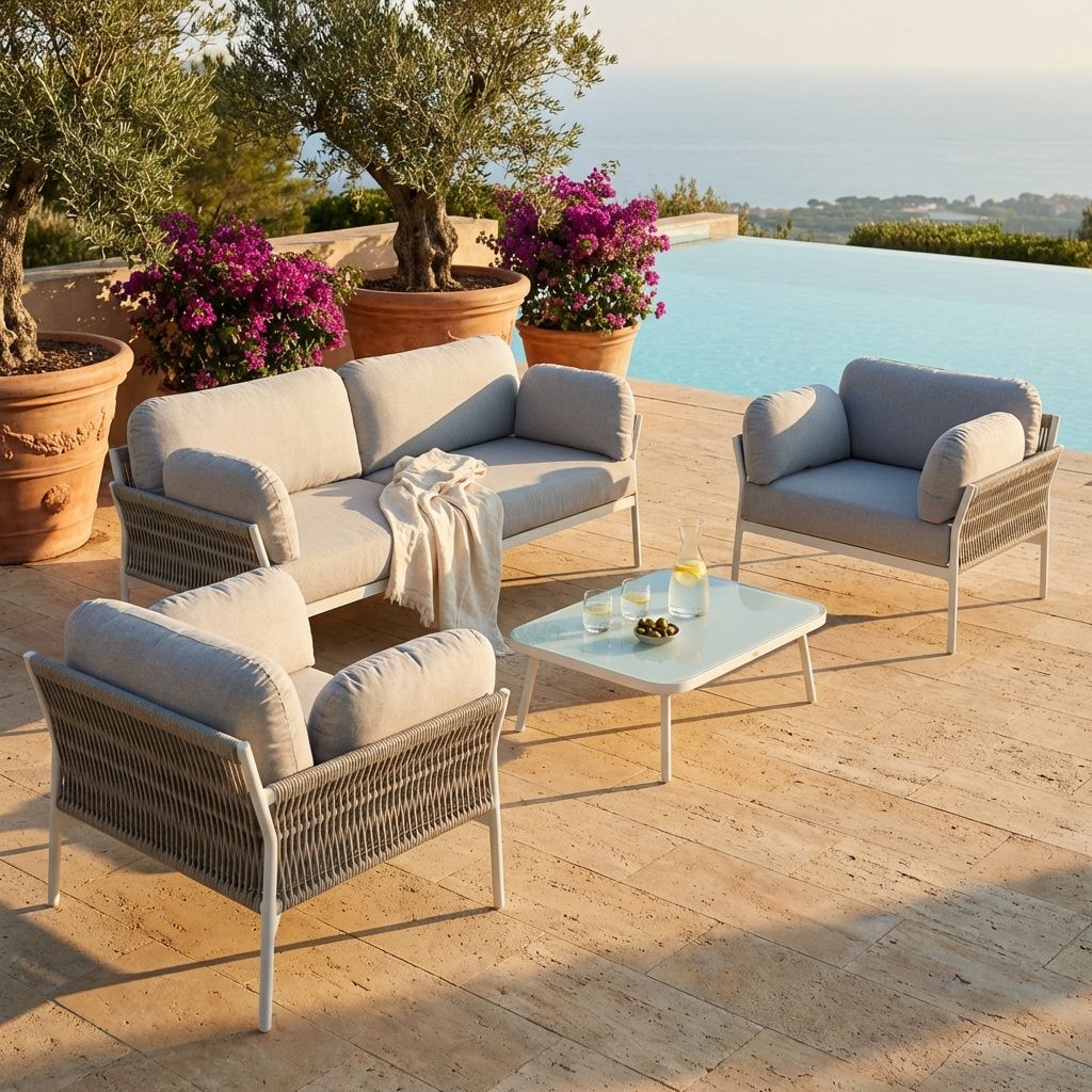 Salotto outdoor composto da divano a tre posti, due poltrone e un tavolino con piano in vetro satinato. Con cuscini imbottiti su sedute, schienali e braccioli, sfoderabili e lavabili per una facile manutenzione. . Schienale in corda di PVC. Disponibile nei colori bianco, rosso e antracite, perfetto per terrazze, giardini e verande.
