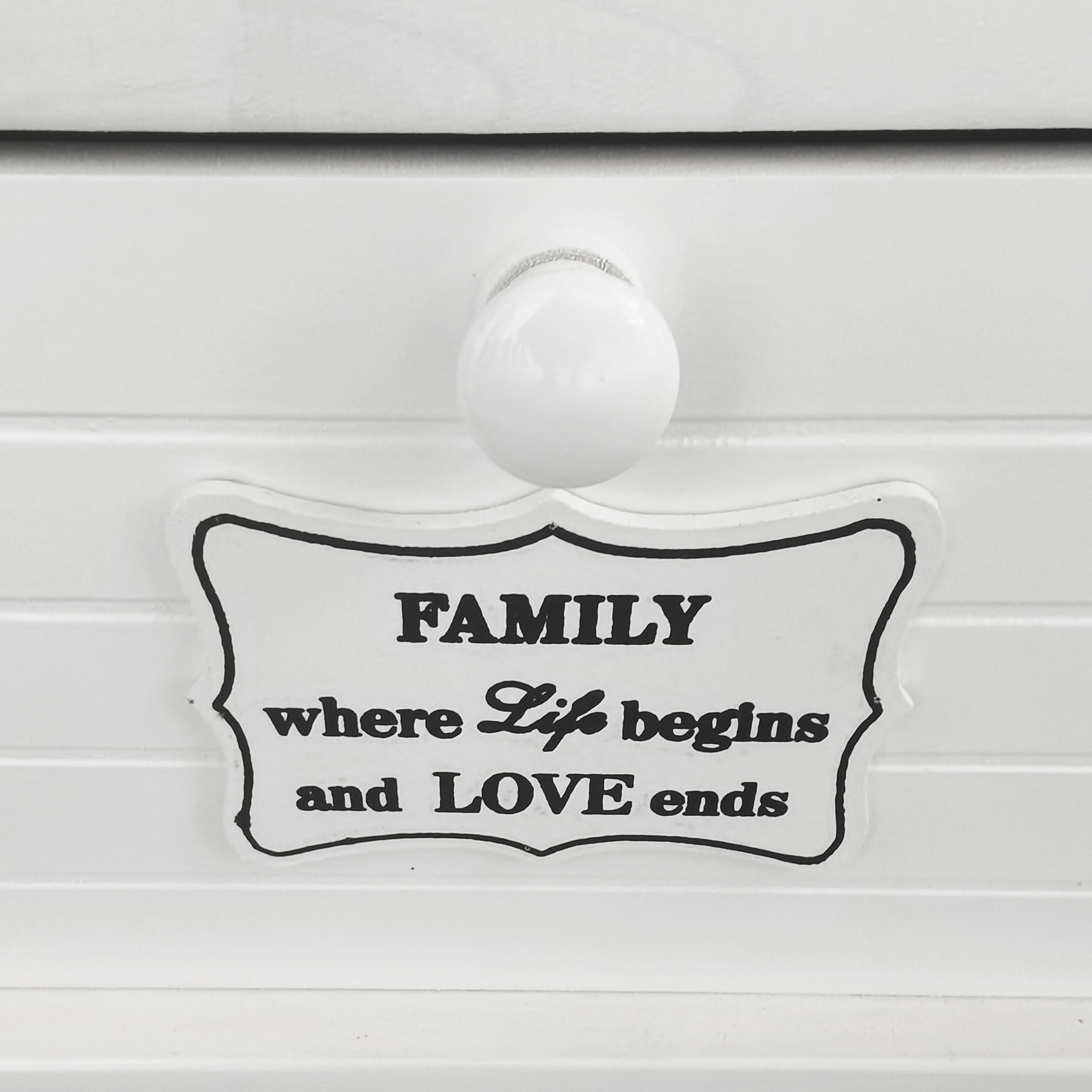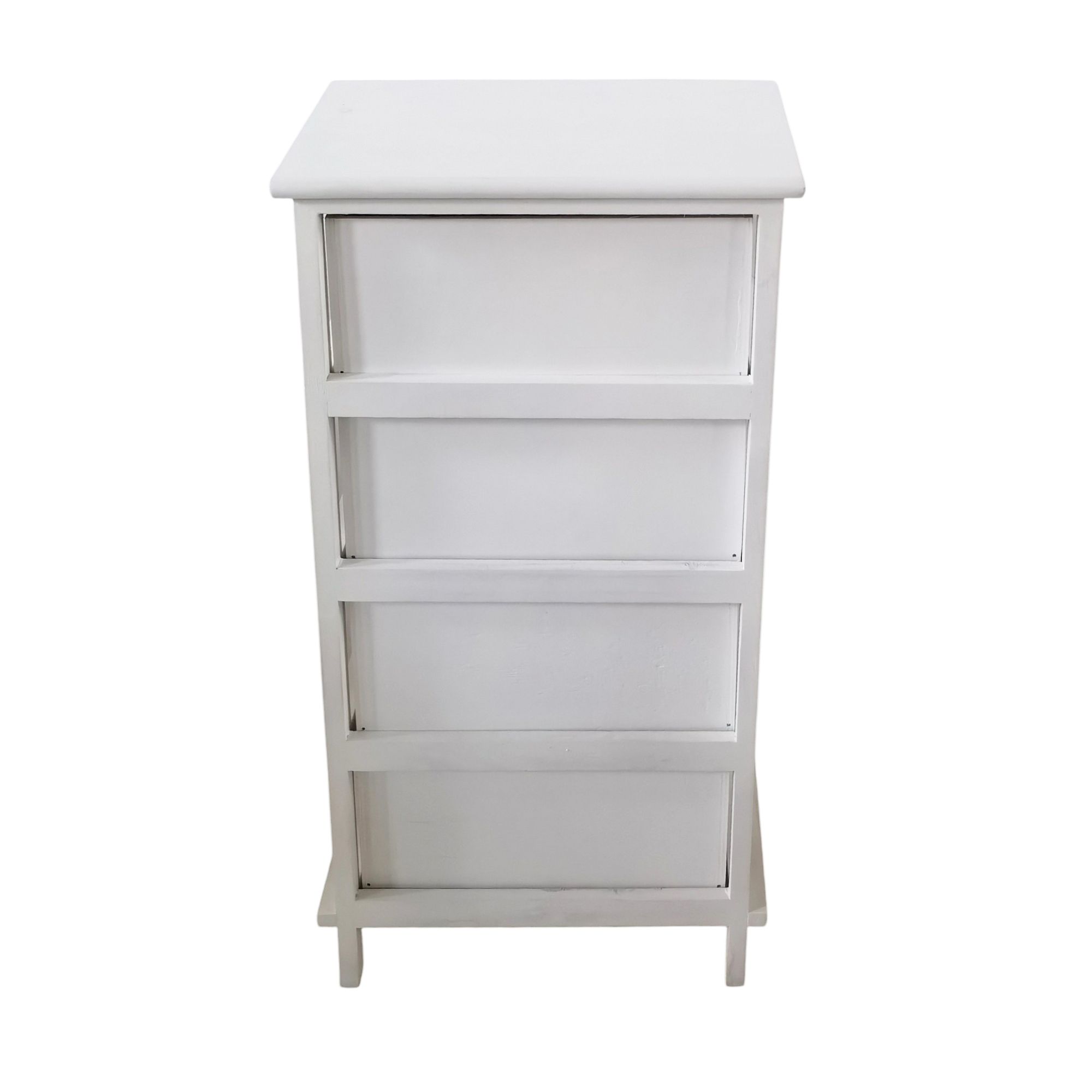 Mobiletto in legno bianco con quattro cassetti decorati, perfetto per un tocco shabby chic o classico. Dotato di ampia capacità contenitiva, dettagli dogati e pomelli vintage. Ideale per camere da letto, ingressi e soggiorni, combinando estetica e funzionalità.