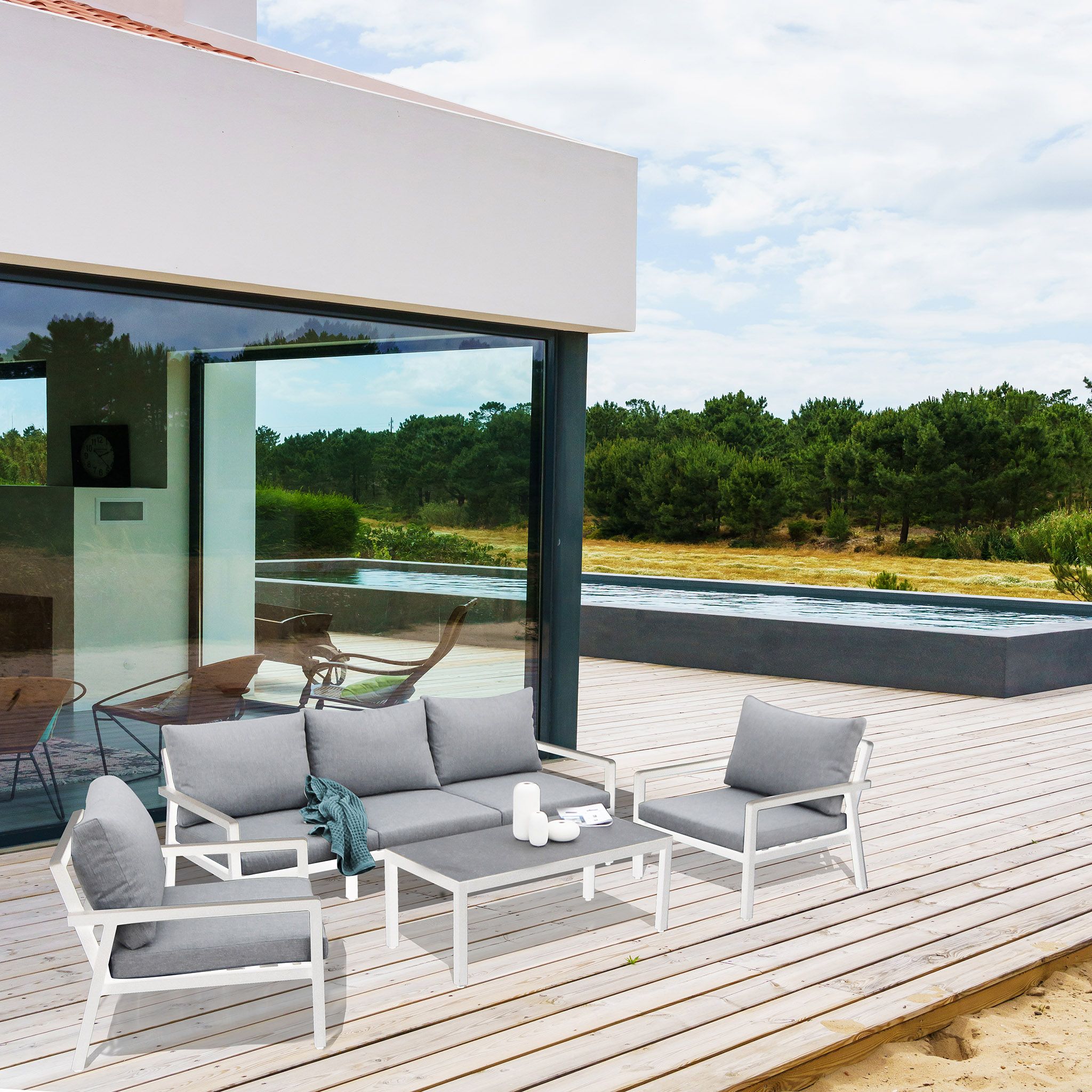 HAGE è un salotto da giardino comodo e affascinante con 5 comodi posti e il tavolino con piano in vetro effetto pietra realizzato in 2 colori antracite o bianco