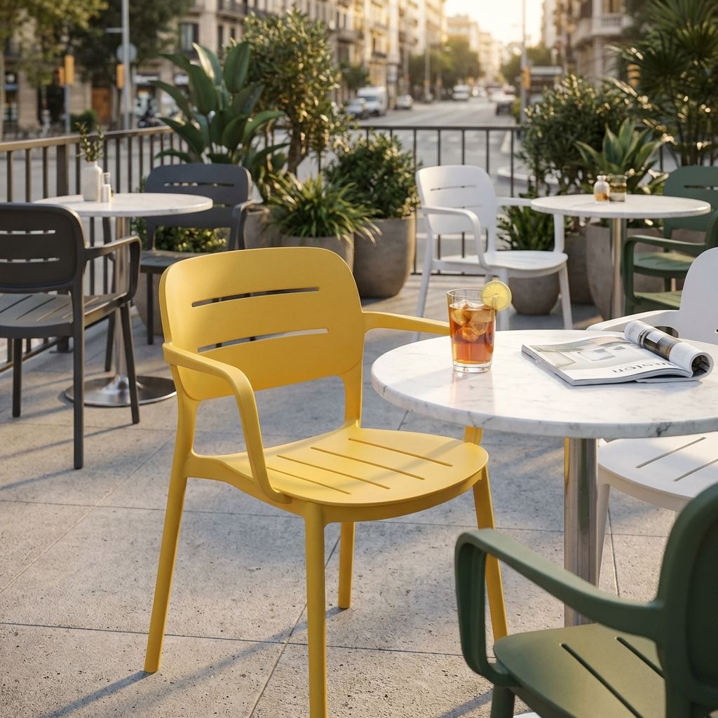 Poltrona impilabile in polipropilene dal design moderno ed ergonomico. Perfetta per interni ed esterni, è resistente agli agenti atmosferici, leggera e facile da pulire e ideale per ogni ambiente. Braccioli per un comfort ottimale. Disponibile in cinque eleganti colori: antracite, bianco, giallo, verde scuro e verde petrolio.