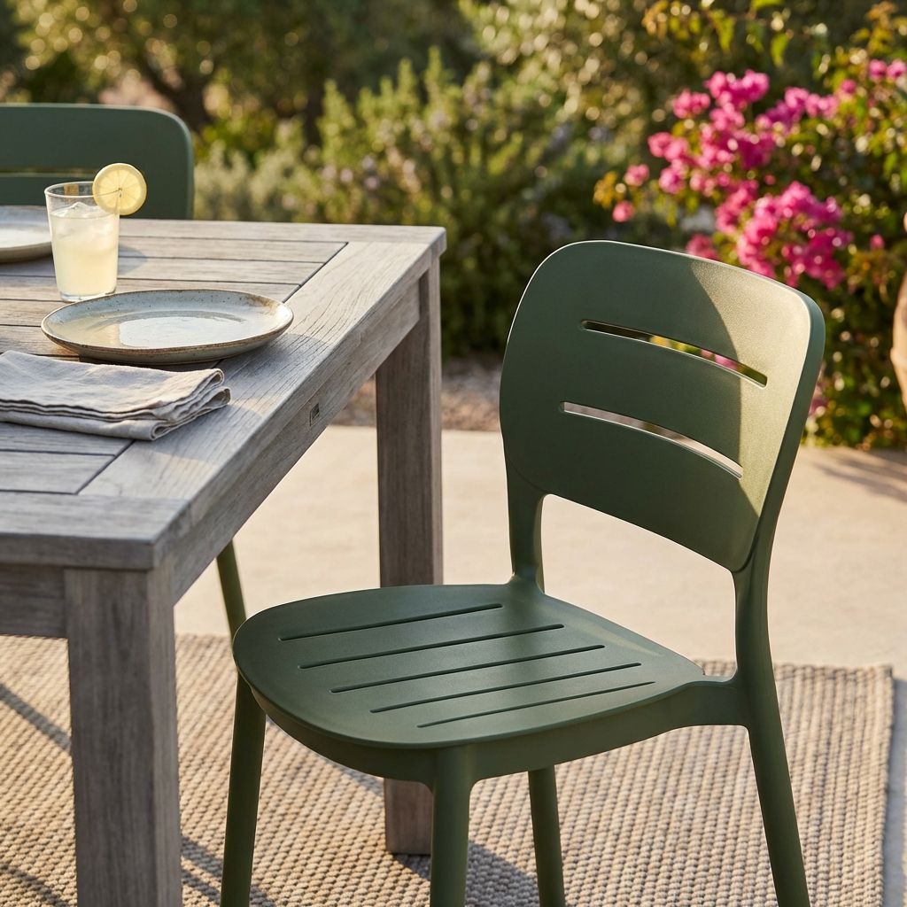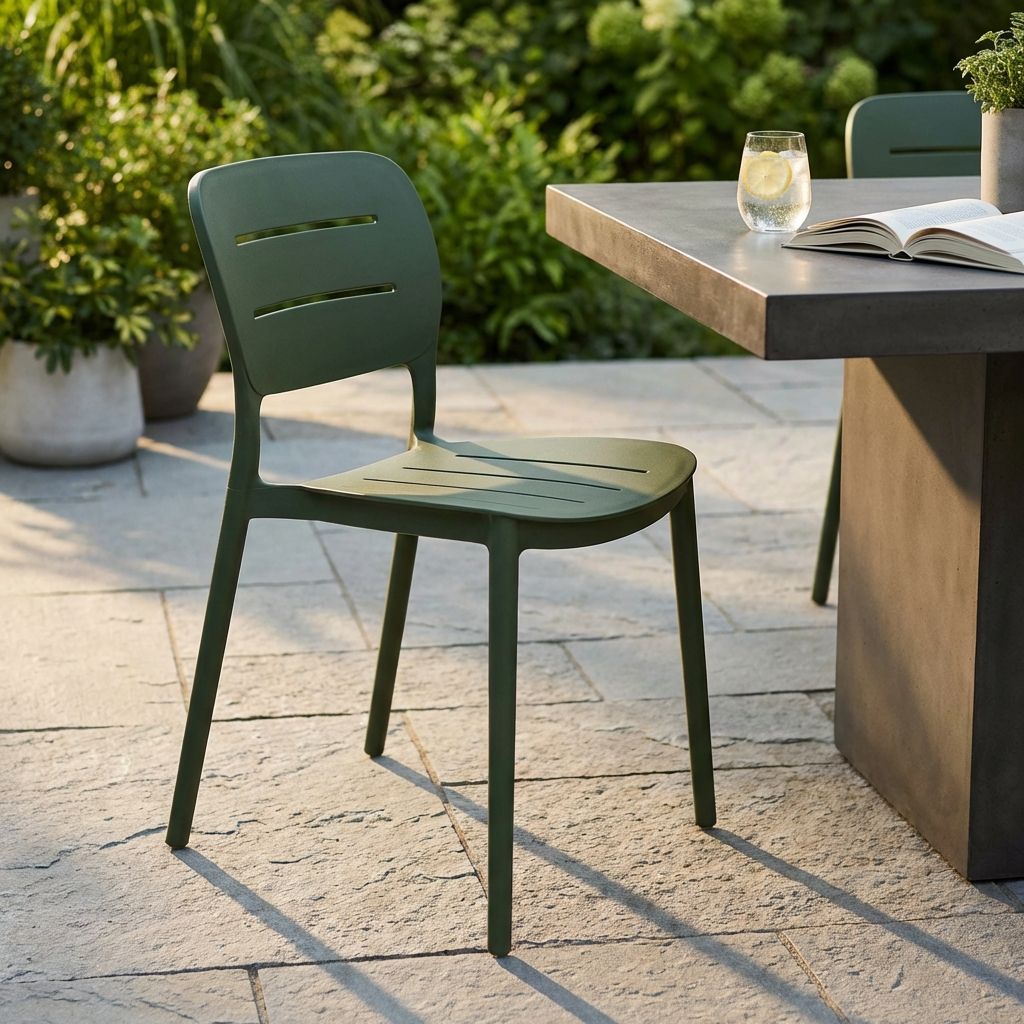 Sedia impilabile in polipropilene resistente, perfetta per ambienti interni ed esterni. Leggera, ergonomica e dotata di scanalature per maggiore ventilazione, offre comfort e durabilità. Disponibile in antracite, bianco, giallo, verde scuro e verde petrolio, è ideale per casa, giardini e attività commerciali.