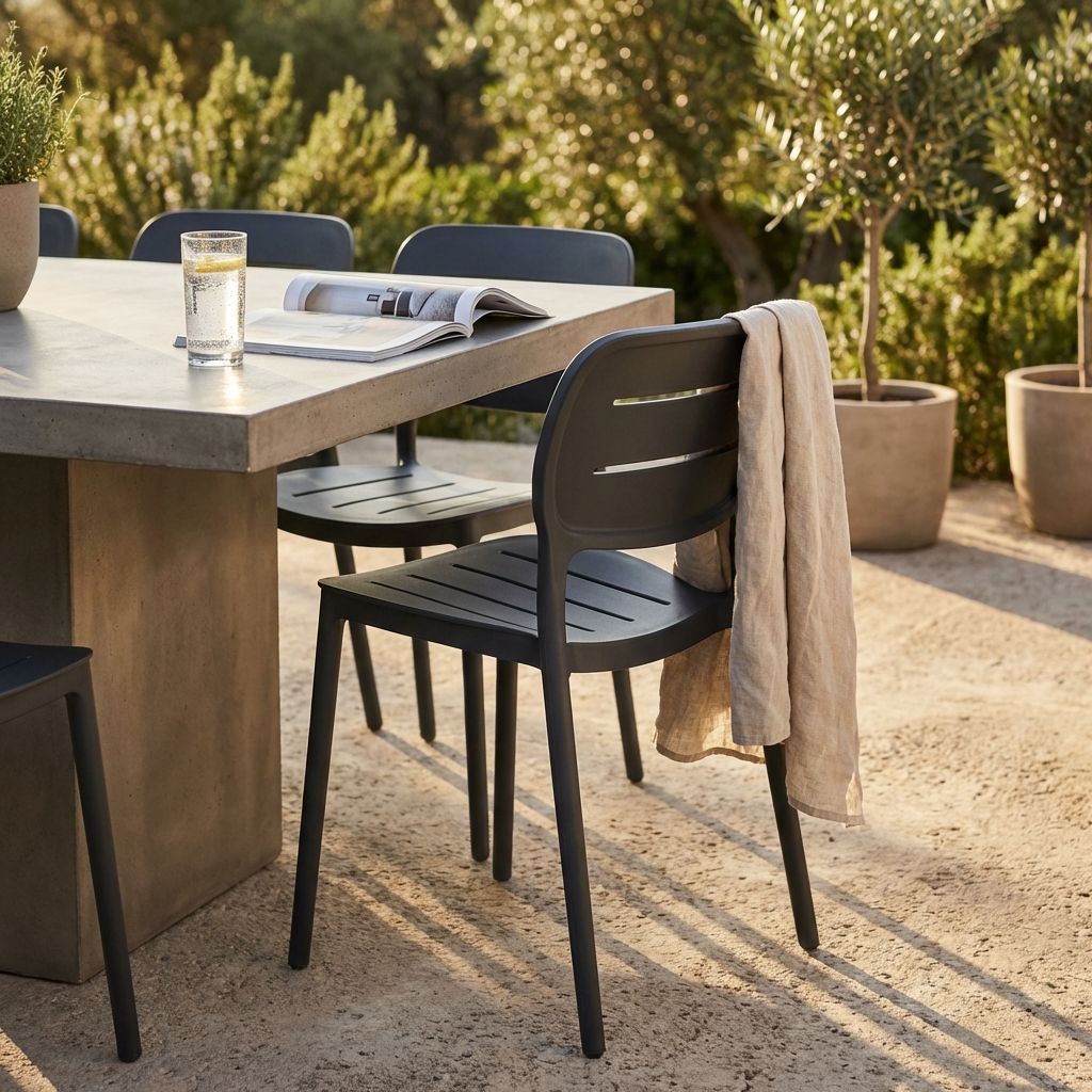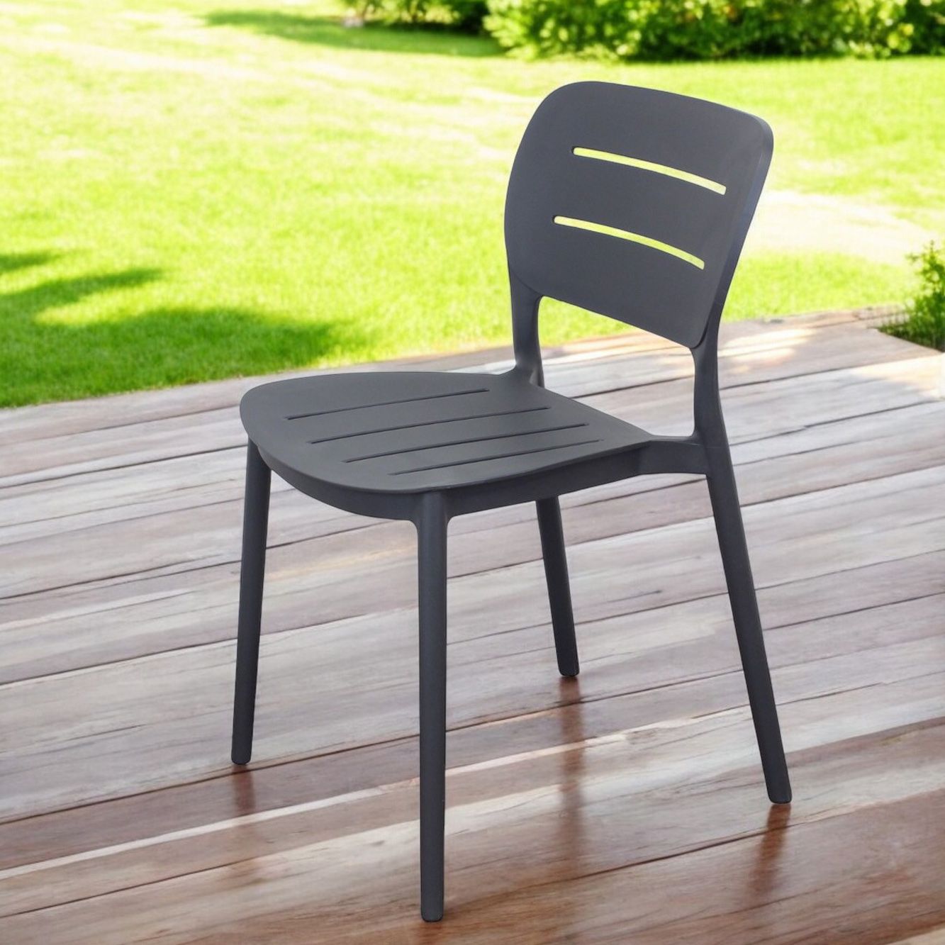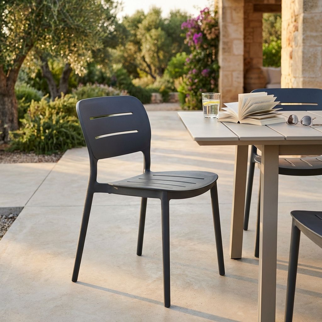 Sedia impilabile in polipropilene resistente, perfetta per ambienti interni ed esterni. Leggera, ergonomica e dotata di scanalature per maggiore ventilazione, offre comfort e durabilità. Disponibile in antracite, bianco, giallo, verde scuro e verde petrolio, è ideale per casa, giardini e attività commerciali.