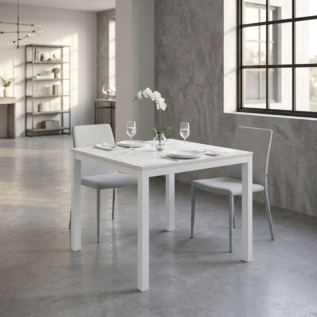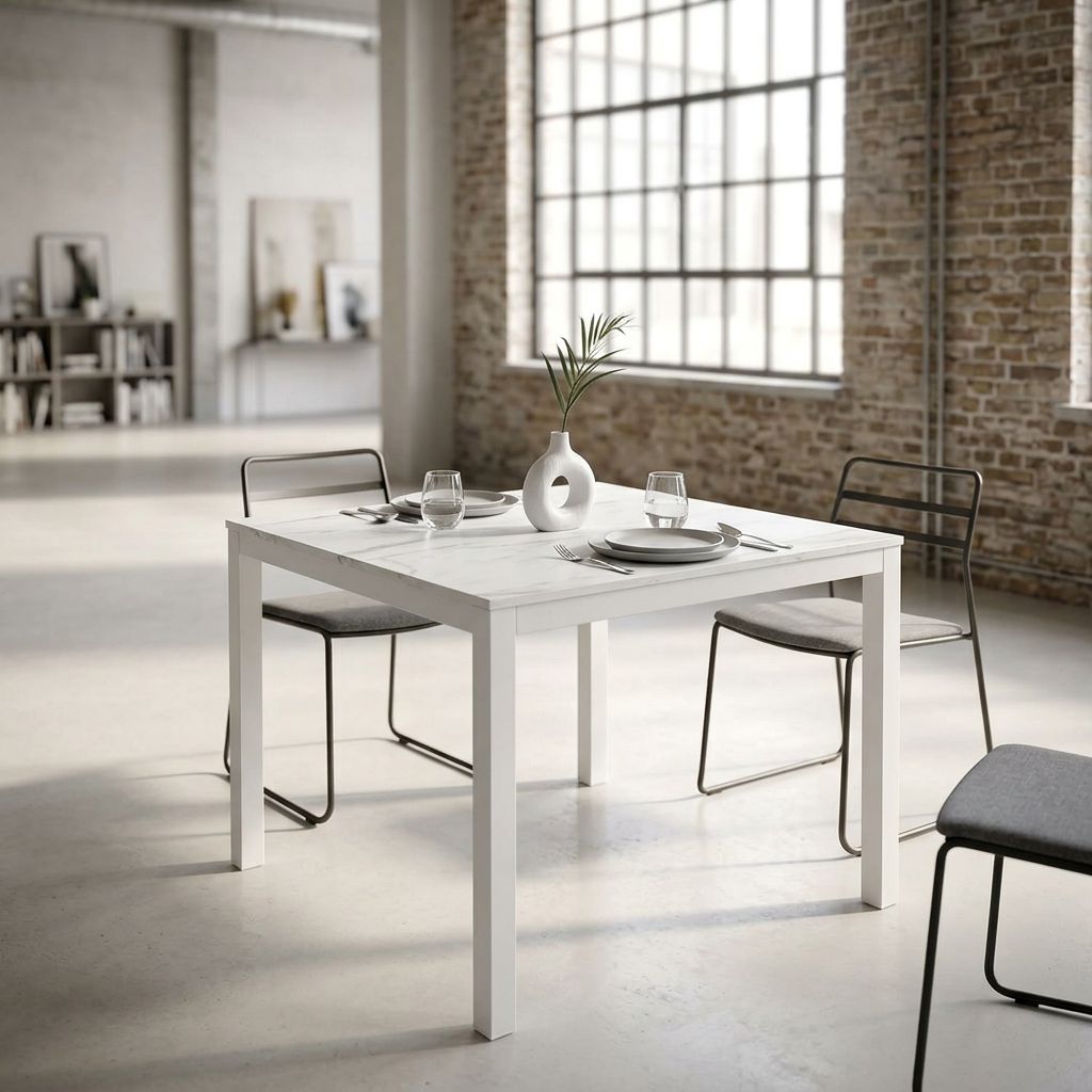 Il tavolo da pranzo moderno HERA è disponibile in 4 colori e in 5 dimensioni diverse: antracite, quercia chiaro, effetto marmo e bianco, da 110x70 cm, 120x80 cm, 140x80 cm, 160x90 cm e 90x90 cm.