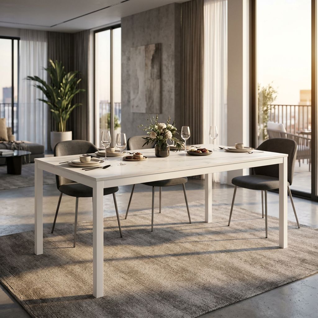 Il tavolo da pranzo moderno HERA è disponibile in 4 colori e in 5 dimensioni diverse: antracite, quercia chiaro, effetto marmo e bianco, da 110x70 cm, 120x80 cm, 140x80 cm, 160x90 cm e 90x90 cm.