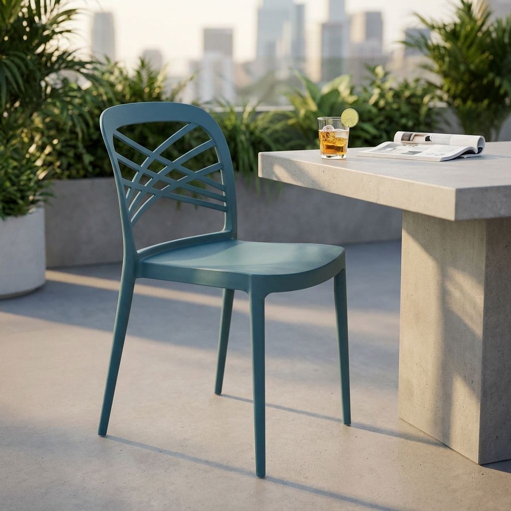Questa sedia impilabile in polipropilene è la soluzione ideale per arredare con eleganza e funzionalità. Lo schienale con intreccio geometrico dona un tocco distintivo ela struttura leggera ma resistente la rende perfetta per uso interno ed esterno. Disponibile in vari colori