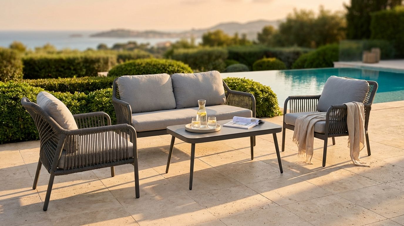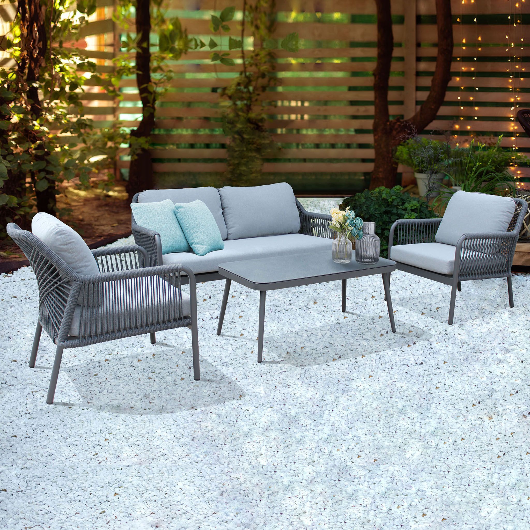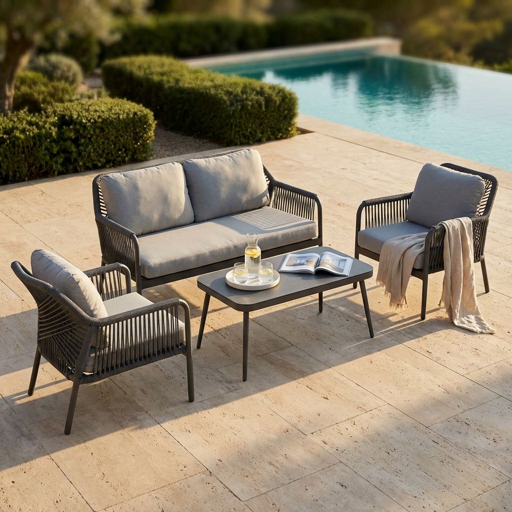 JAY è l'arredamento da giardino di lusso che stavamo cercando! Con un design moderno ed elegante, comprende un divano, poltrone e un tavolino, tutto il necessario per ospitare fino a 4 persone. Realizzato con alluminio di alta qualità, è resistente alle intemperie e semplice da pulire. Rilassarsi in giardino non è mai stato così comodo grazie ai cuscini imbottiti inclusi. E il tavolino è perfetto per i drink e gli spuntini durante le cene all'aperto con gli amici. Con JAY, avrai il massimo comfort e stile per anni a venire!