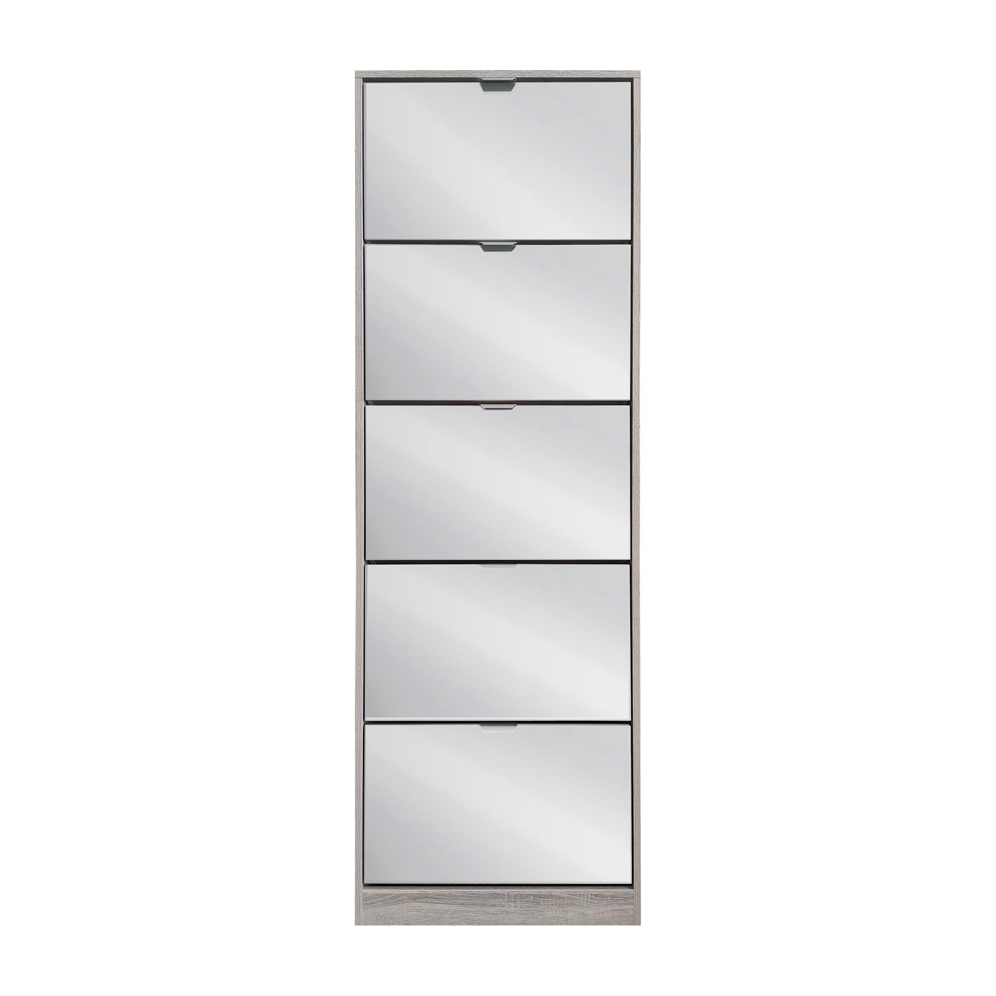 Questa scarpiera a 5 ante con specchi trasforma ogni ambiente in un'oasi di ordine e raffinatezza. Il suo design elegante e moderno, abbinato alla praticità delle ante a ribalta, ti permette di organizzare le tue scarpe senza rinunciare allo stile. Grazie agli specchi frontali, aggiunge luminosità e profondità al tuo spazio, rendendolo ideale per ambienti di dimensioni ridotte. È una soluzione perfetta per chi desidera ottimizzare lo spazio mantenendo un look contemporaneo e ricercato. Ogni dettaglio è curato con materiali di qualità che garantiscono resistenza nel tempo, mentre le finiture riflettono uno stile sobrio e versatile, adattabile a diversi contesti abitativi. La struttura permette un utilizzo funzionale e ordinato, offrendo tutto lo spazio necessario per le tue calzature, mantenendo l'ambiente pulito e organizzato.