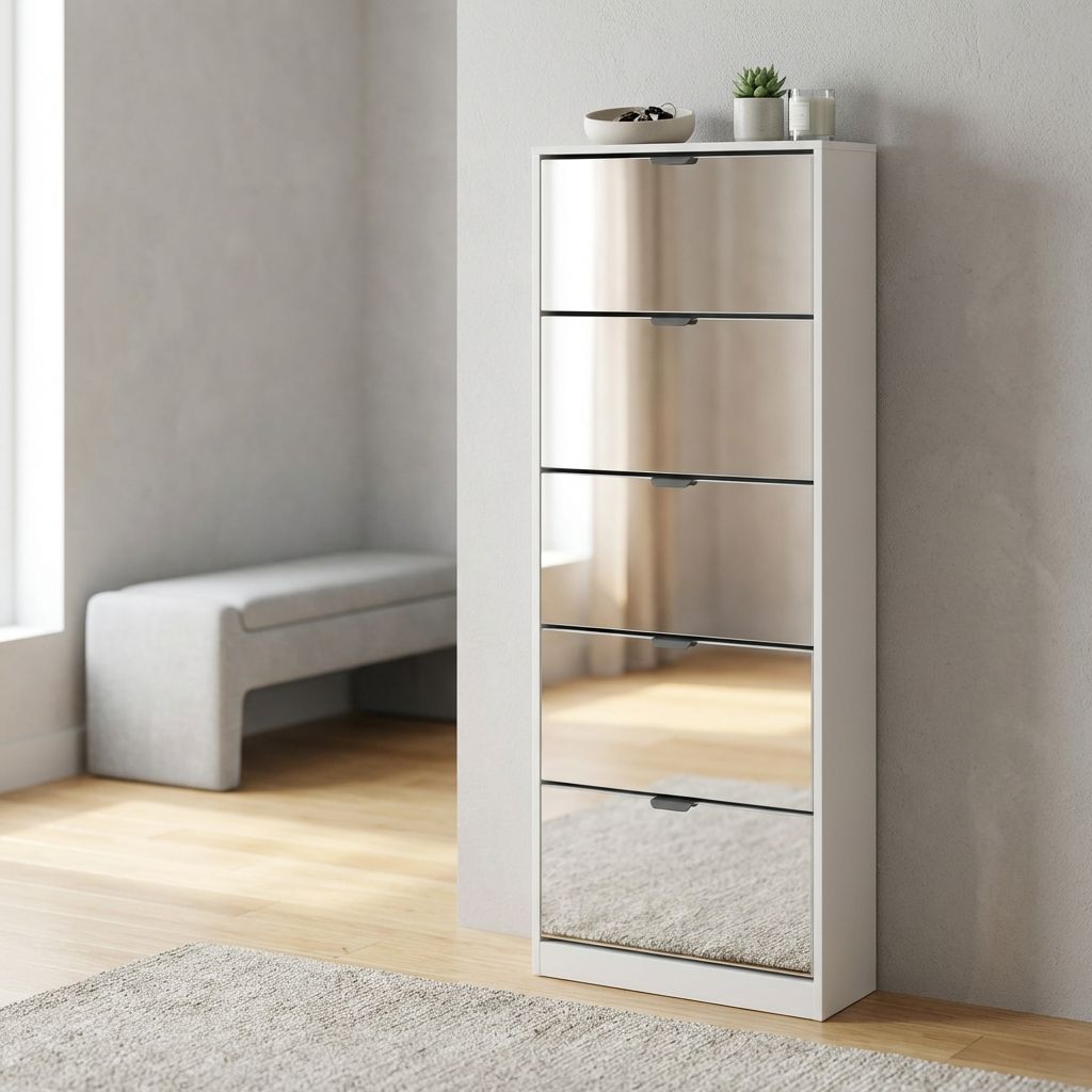 Questa scarpiera a 5 ante con specchi è disponibile in tre varianti di colore: grigio chiaro, grigio scuro e bianco. Perfetta per chi cerca praticità e design in un solo complemento d’arredo.