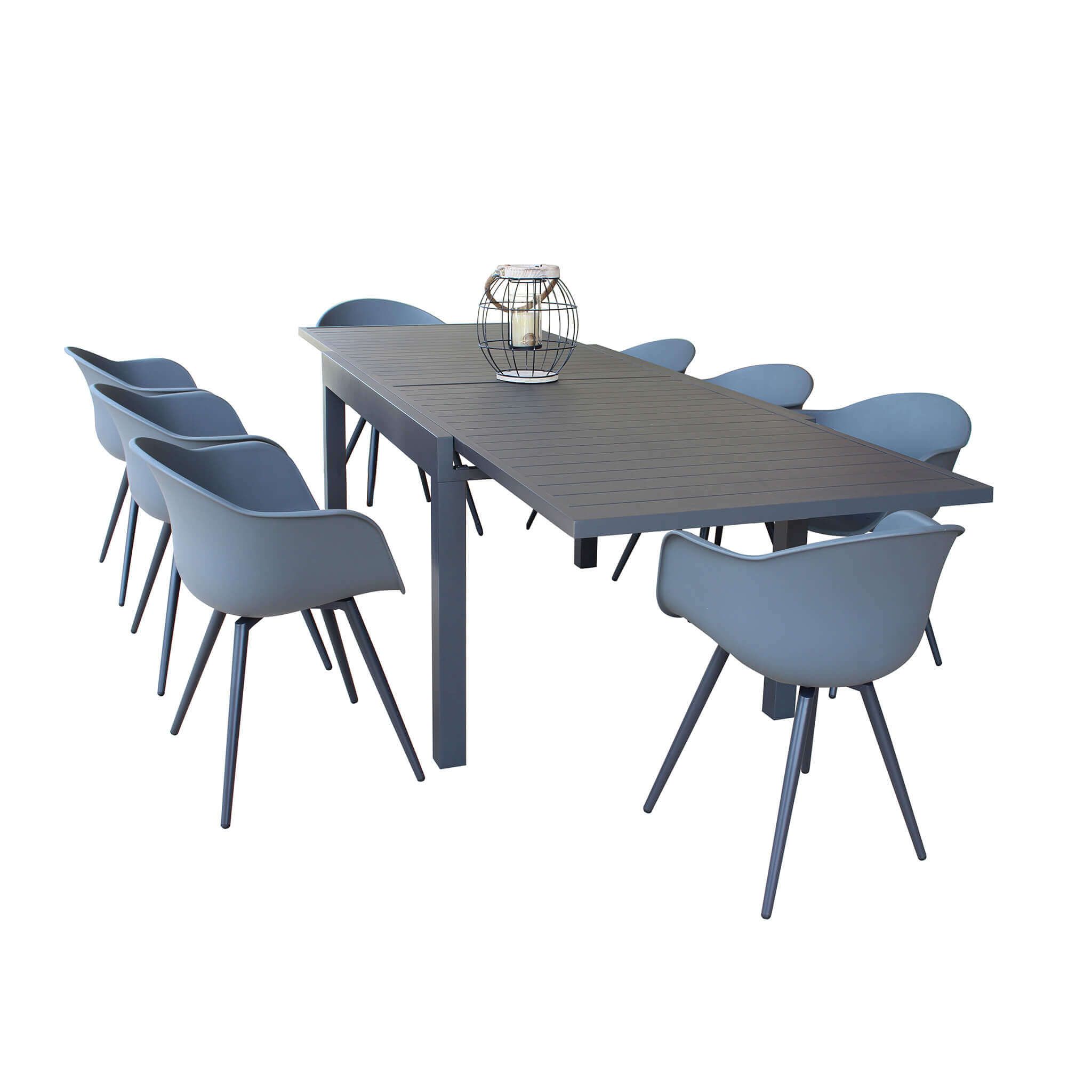Il set da giardino JERRI è disponibile in colore antracite, bianco, taupe e tortora, puoi scegliere se acquistarlo con 4, 6, o 8 sedute, esiste in dimensione da 90x90 cm allungabile fino 180 cm e in dimensione 135x90 cm allungabile fino a 270 cm