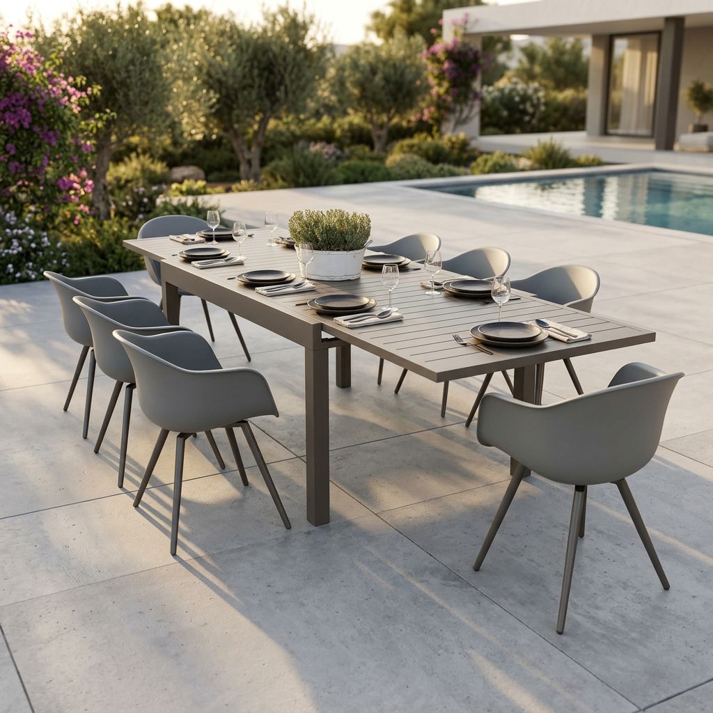 Il set da giardino JERRI è disponibile in colore antracite, bianco, taupe e tortora, puoi scegliere se acquistarlo con 4, 6, o 8 sedute, esiste in dimensione da 90x90 cm allungabile fino 180 cm e in dimensione 135x90 cm allungabile fino a 270 cm
