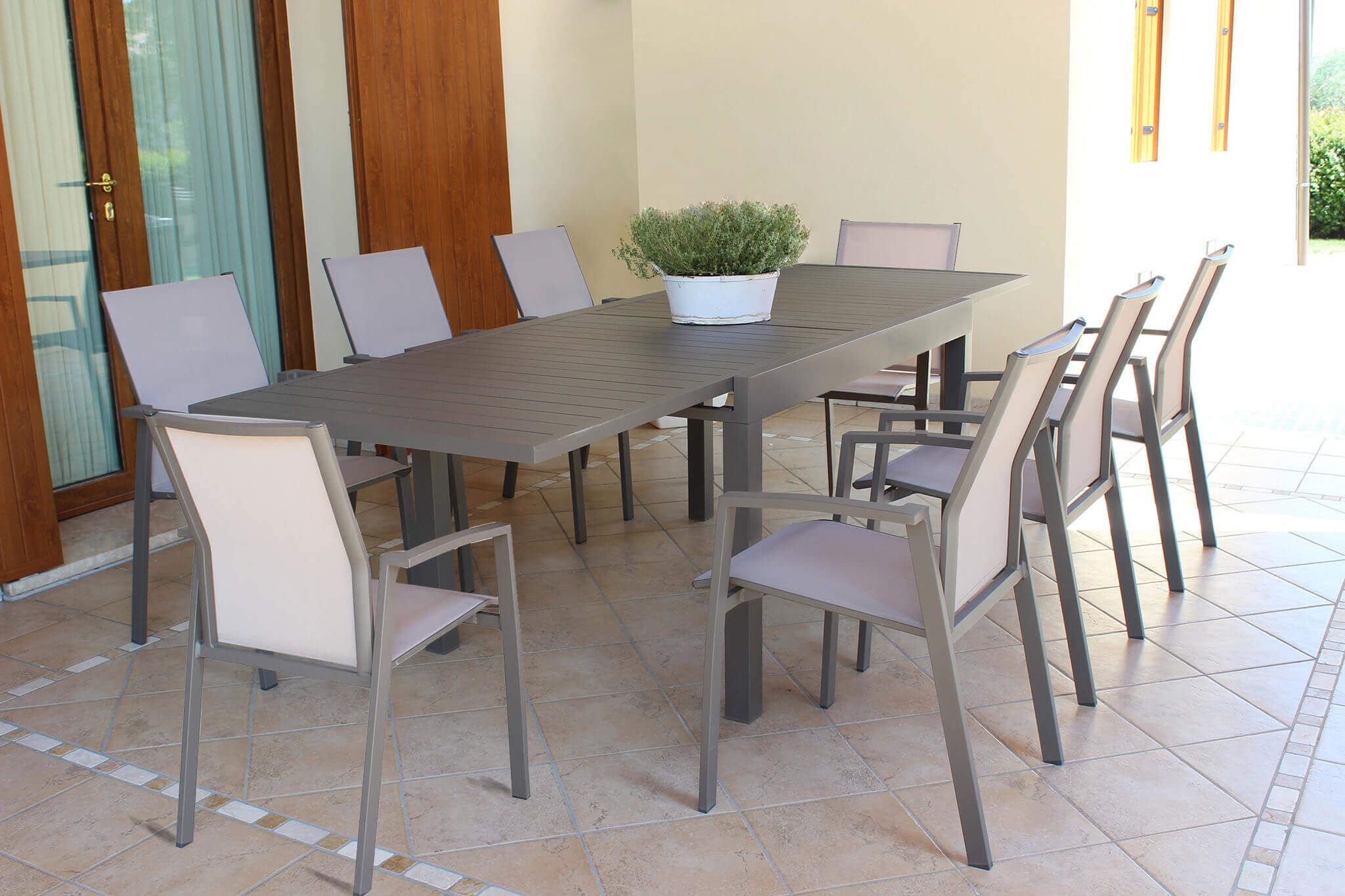 Il set da giardino JERRI è disponibile in colore antracite, bianco, taupe e tortora, puoi scegliere se acquistarlo con 4, 6, o 8 sedute, esiste in dimensione da 90x90 cm allungabile fino 180 cm e in dimensione 135x90 cm allungabile fino a 270 cm