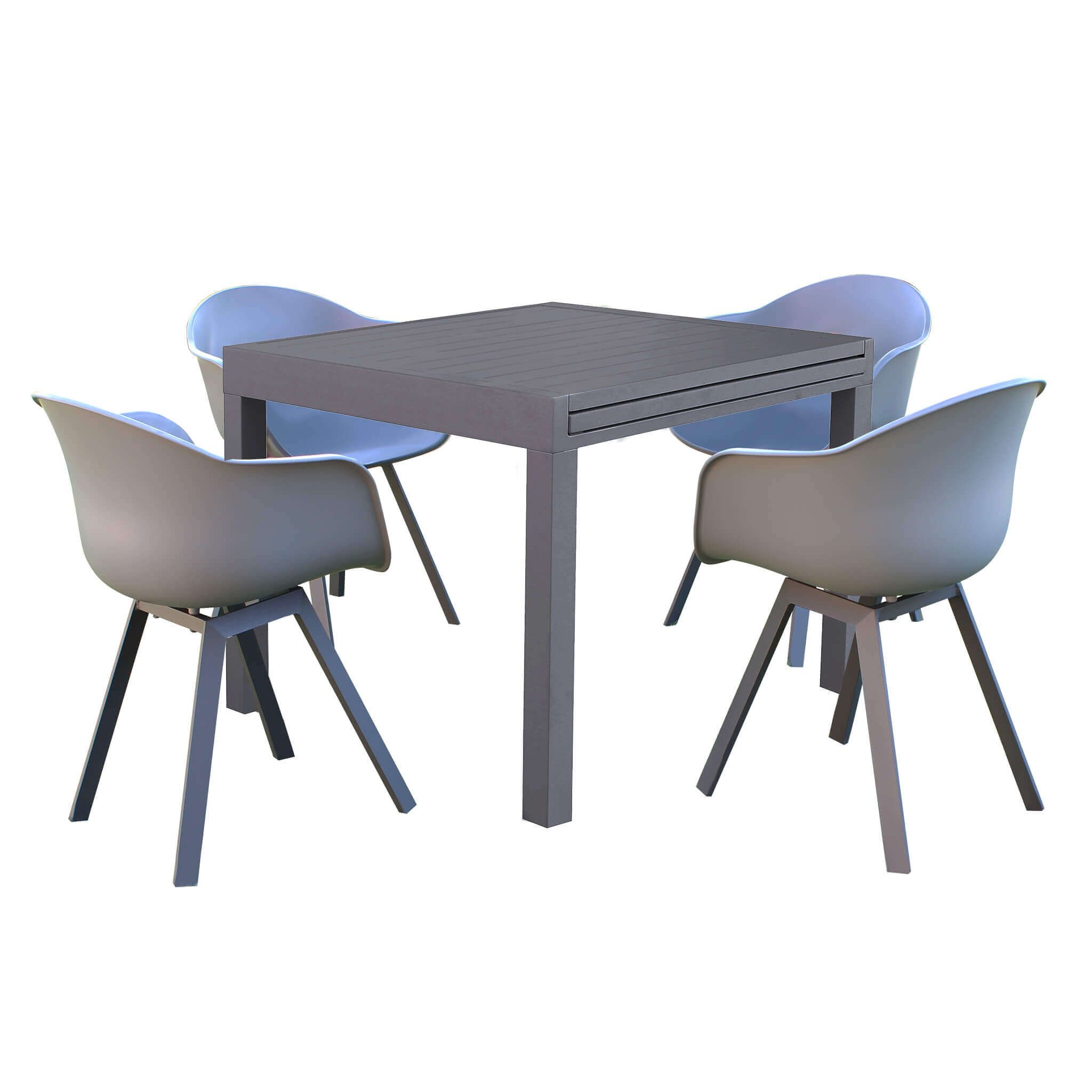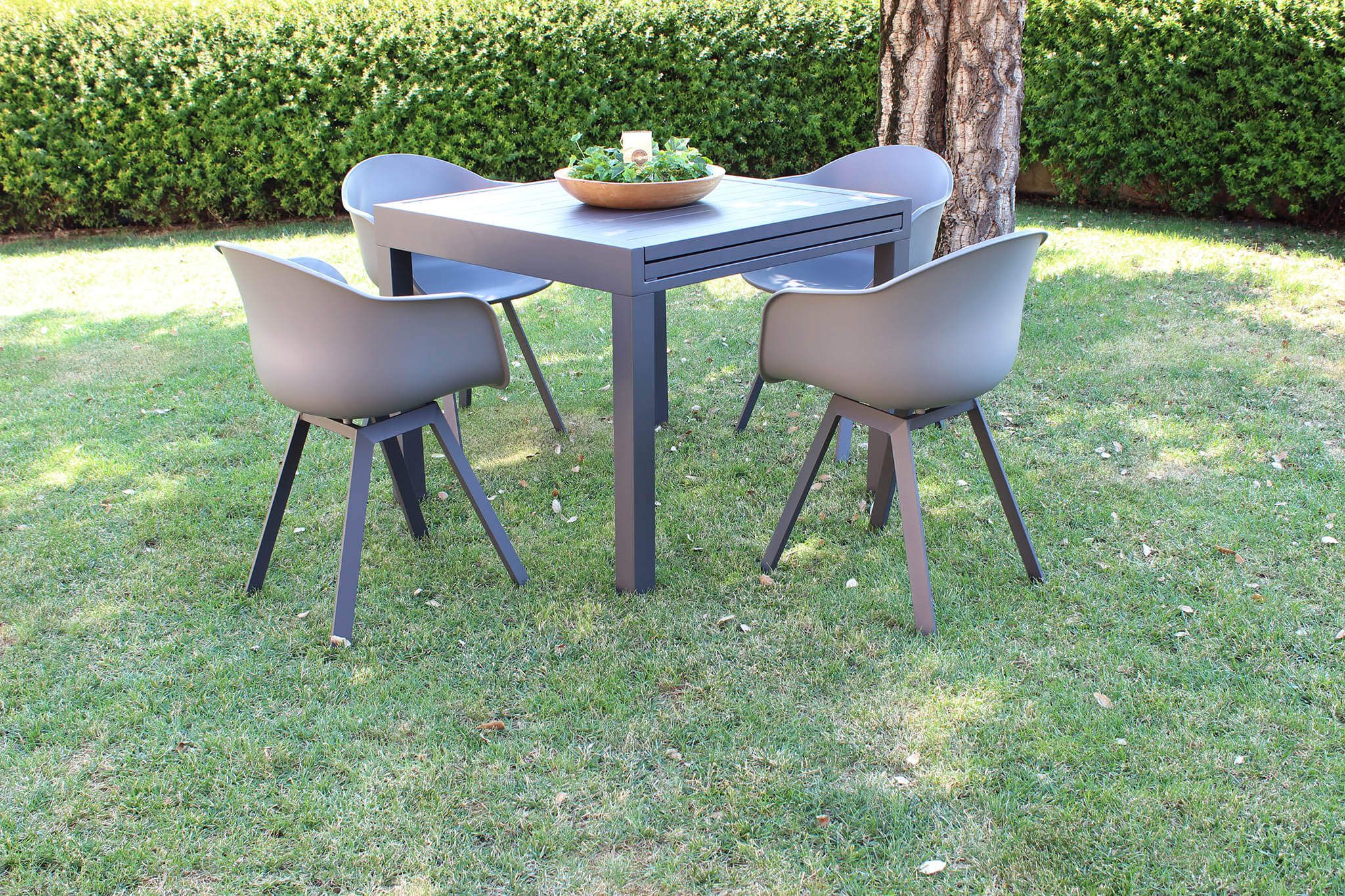 Il set da giardino JERRI è disponibile in colore antracite, bianco, taupe e tortora, puoi scegliere se acquistarlo con 4, 6, o 8 sedute, esiste in dimensione da 90x90 cm allungabile fino 180 cm e in dimensione 135x90 cm allungabile fino a 270 cm