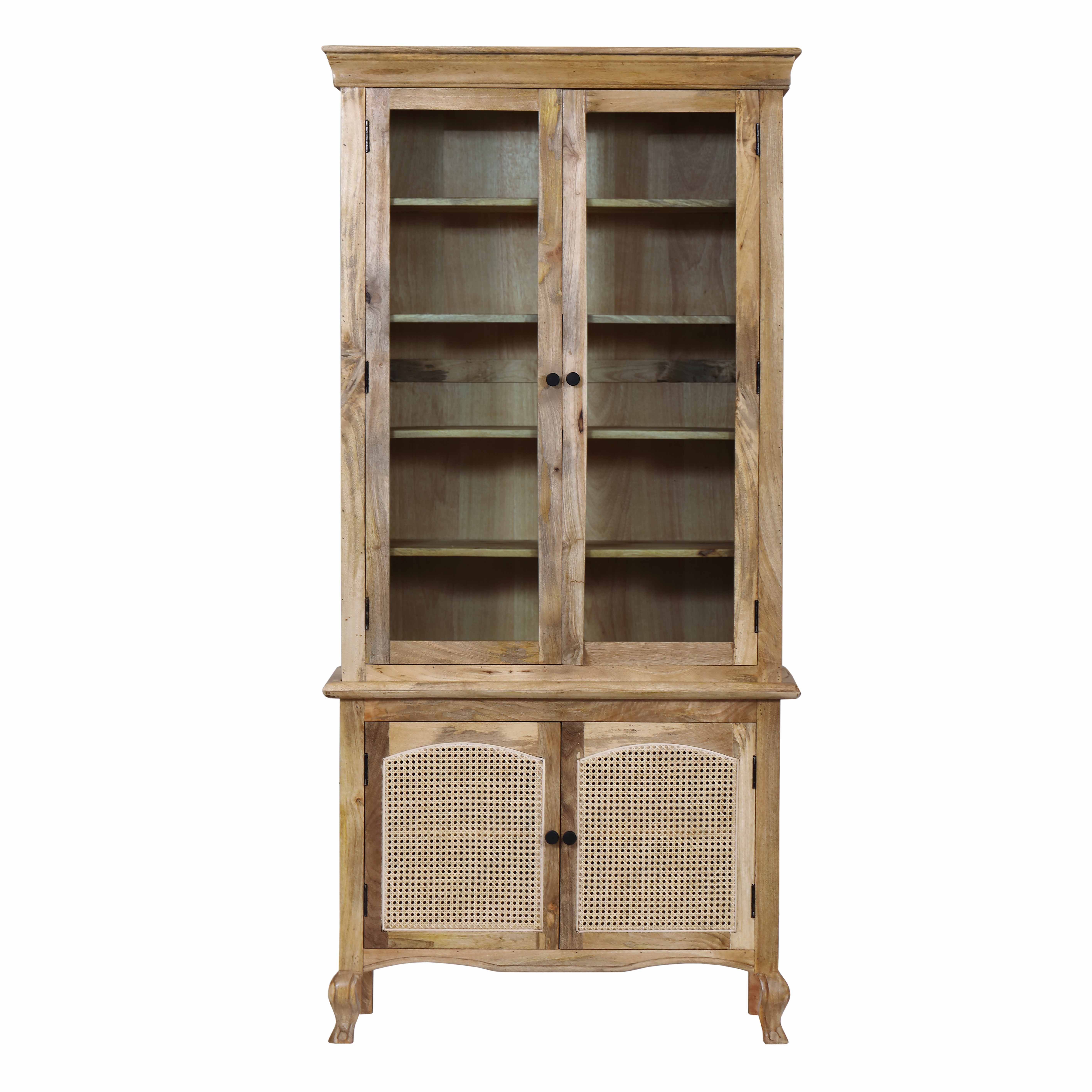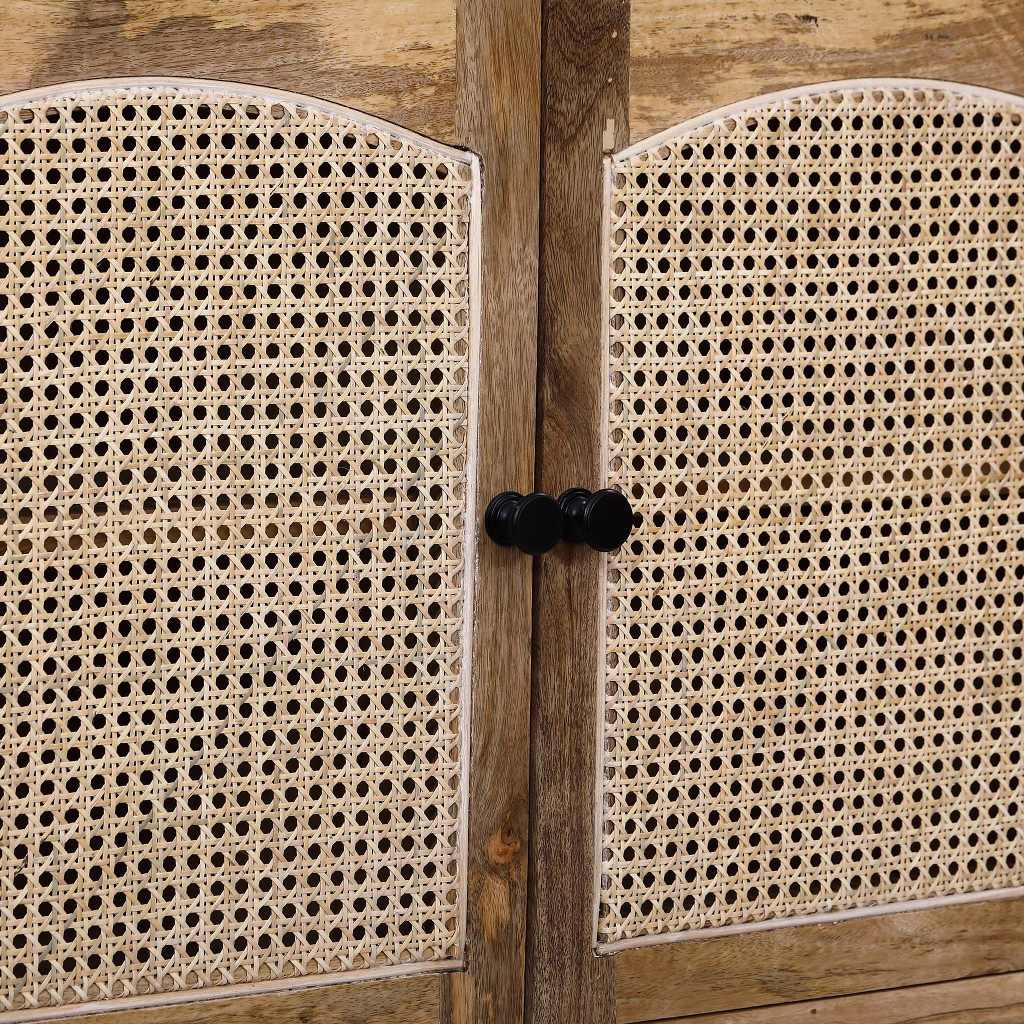 Questo mobile in legno di mango combina estetica e praticità con un design raffinato. Le ante superiori in vetro permettono di esporre oggetti decorativi, mentre quelle inferiori in rattan intrecciato offrono un tocco boho-chic e discrezione. Perfetto per soggiorni e sale da pranzo, aggiunge calore e funzionalità