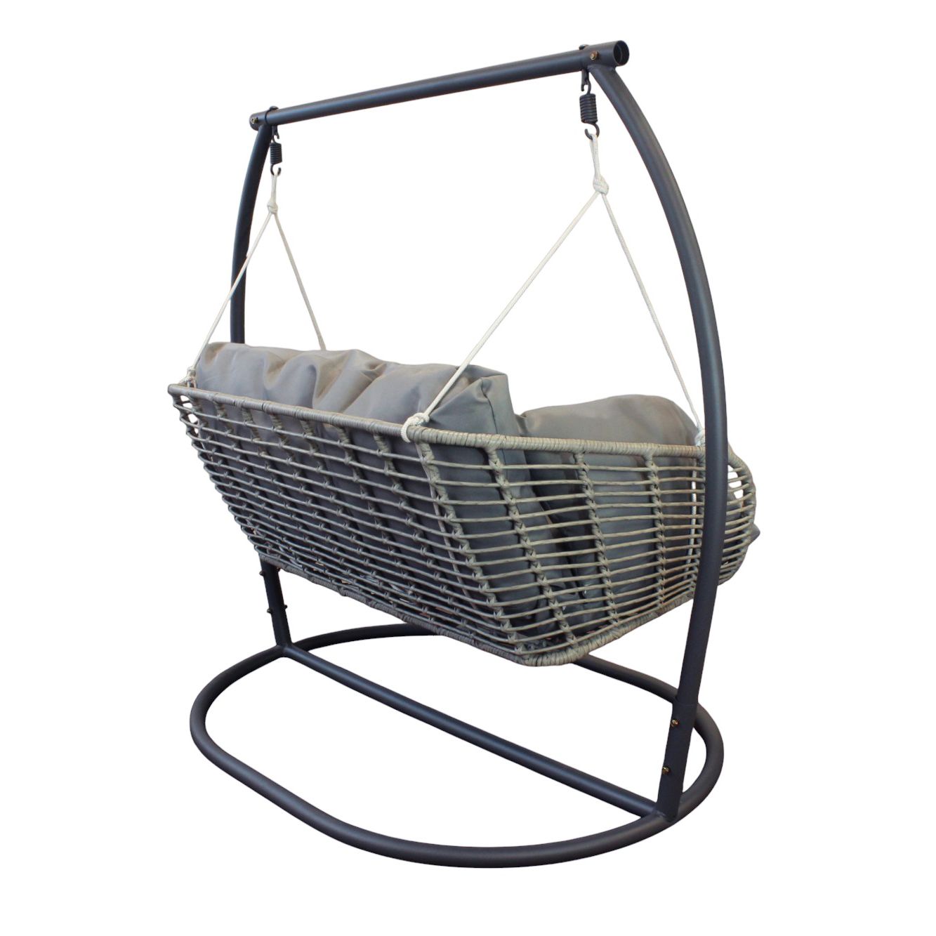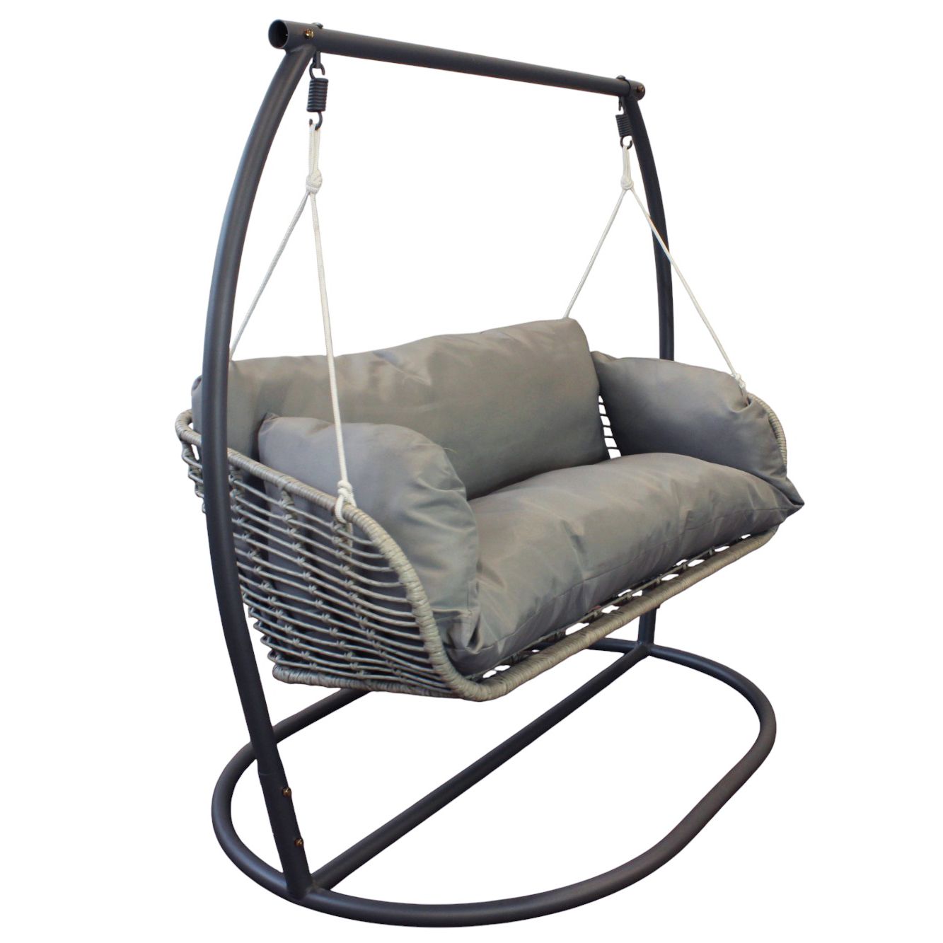 Leggero e confortevole, questo dondolo a due posti con struttura in metallo e wicker intrecciato è perfetto per giardini e terrazze. Disponibile in bianco, grigio o naturale, offre una seduta ampia con morbidi cuscini imbottiti sfoderabili. Ideale per godere di momenti di benessere in qualsiasi ambiente.
