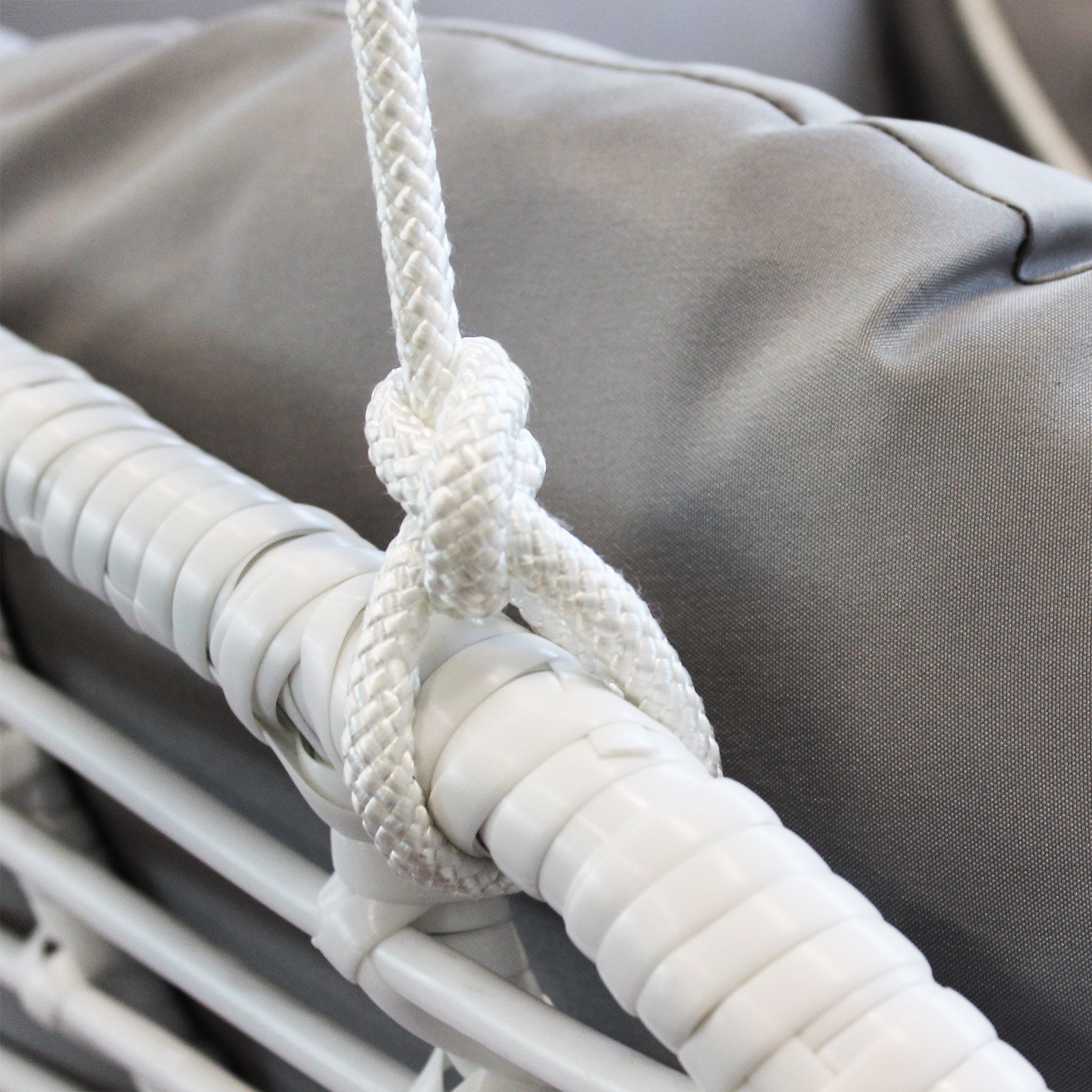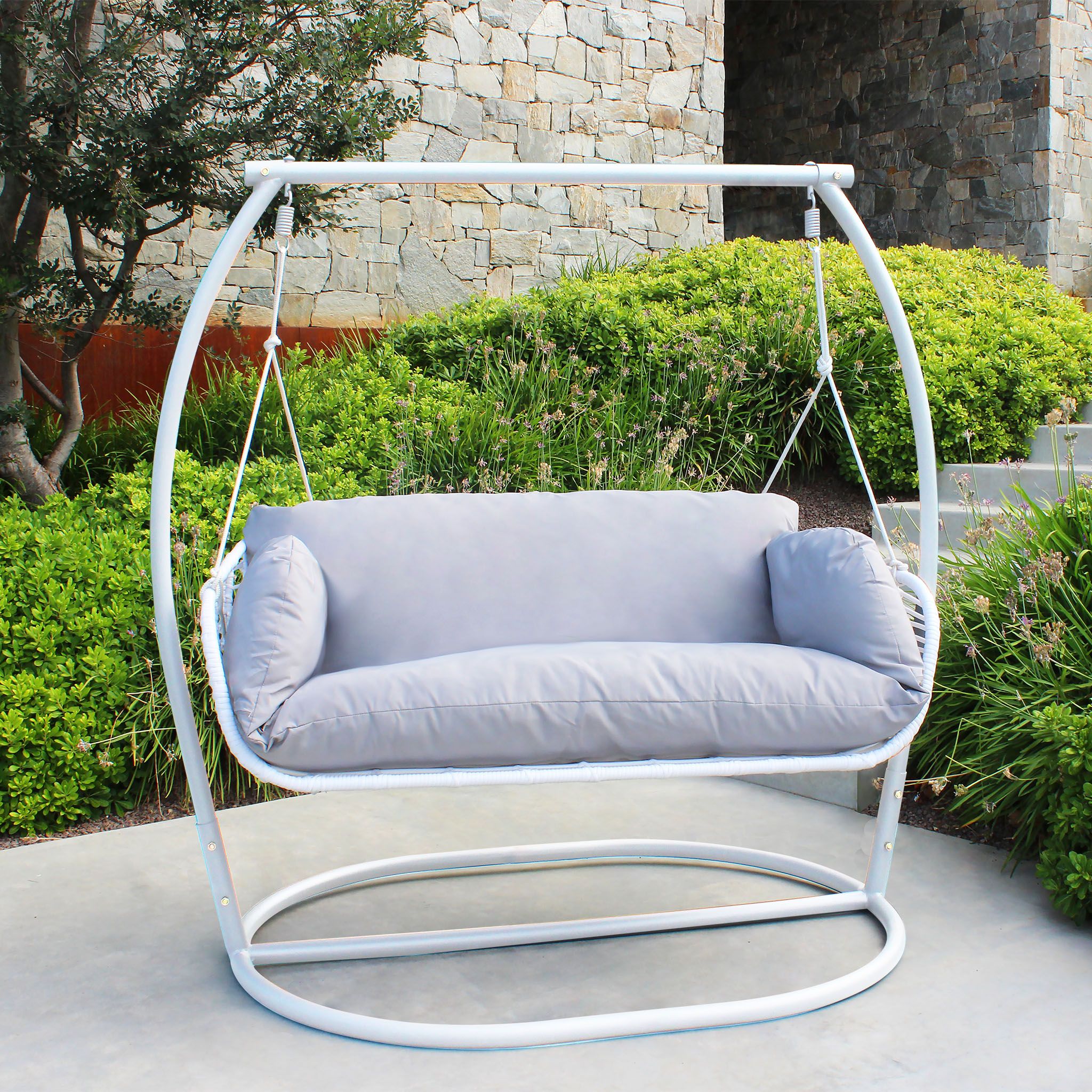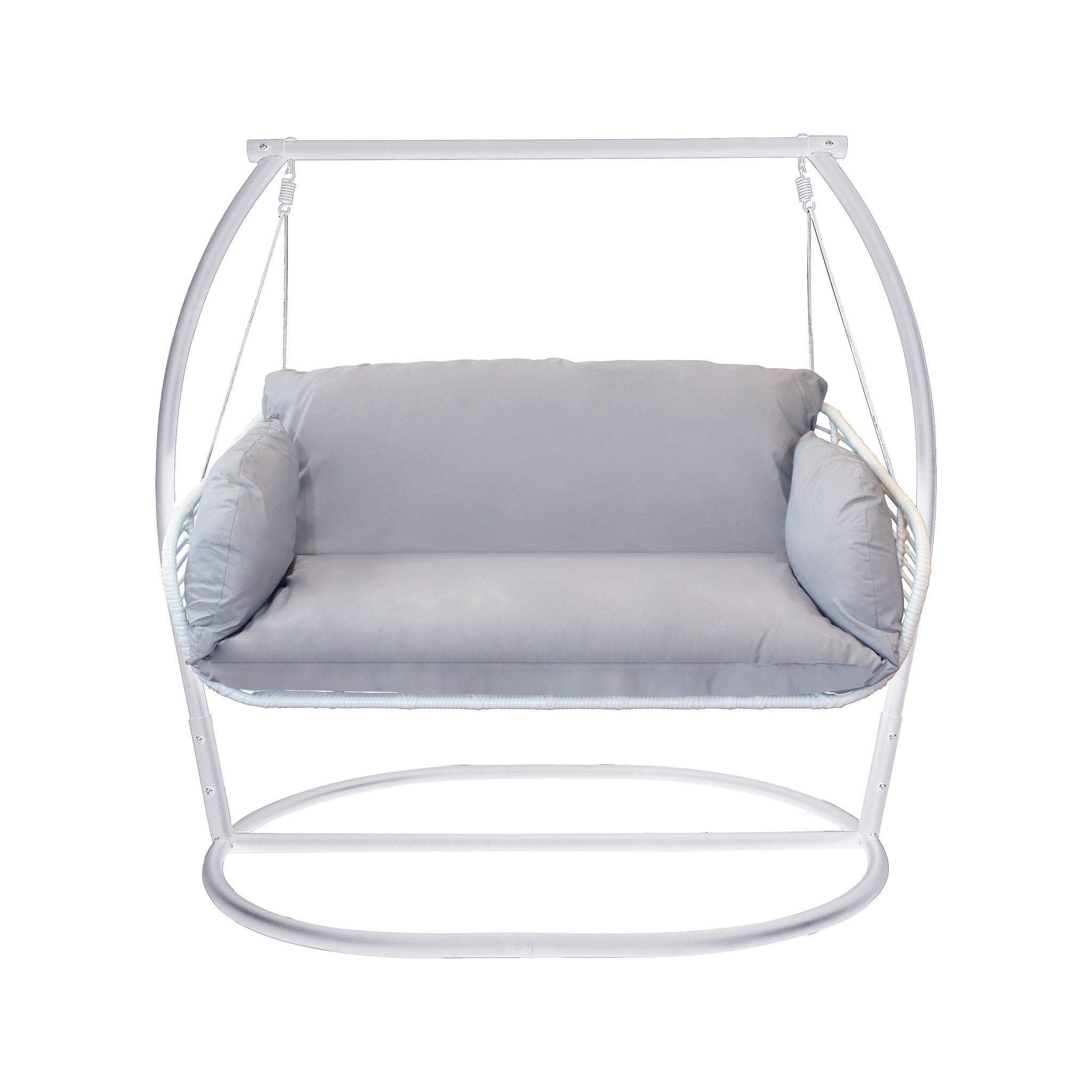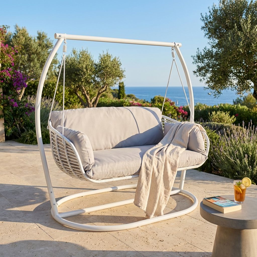 Leggero e confortevole, questo dondolo a due posti con struttura in metallo e wicker intrecciato è perfetto per giardini e terrazze. Disponibile in bianco, grigio o naturale, offre una seduta ampia con morbidi cuscini imbottiti sfoderabili. Ideale per godere di momenti di benessere in qualsiasi ambiente.test a