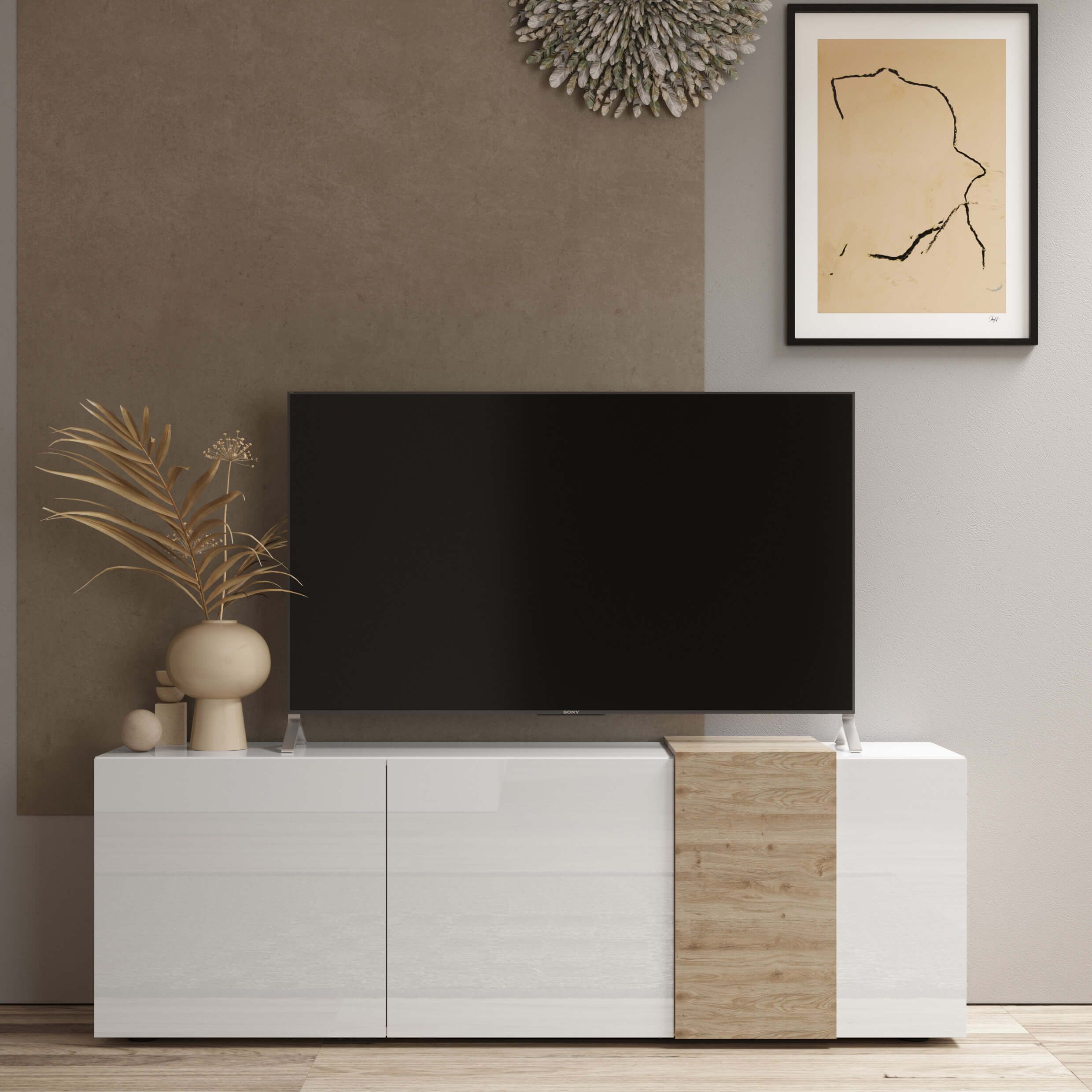 Il mobile porta TV KARMA, con le sue varianti bianco e titanio, è il complemento ideale per ogni salotto moderno. Offre un design minimalista che fonde eleganza e funzionalità, spaziando da ante lisce a settori in legno naturale. Ideale per sistemare dispositivi elettronici e organizzare spazi, supporta televisori di grandi dimensioni, assicurando ordine e stile nel cuore della zona living.