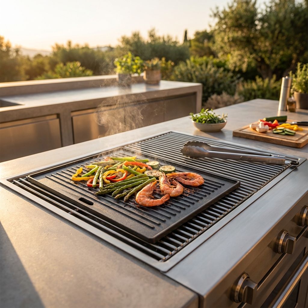 Piastra di cottura in ghisa per barbecue, ideale per alimenti delicati come verdure, pesce, uova e formaggi. La superficie liscia garantisce una cottura uniforme e controllata, valorizzando i sapori. Compatta, resistente e versatile, amplia le possibilità di utilizzo del tuo barbecue.