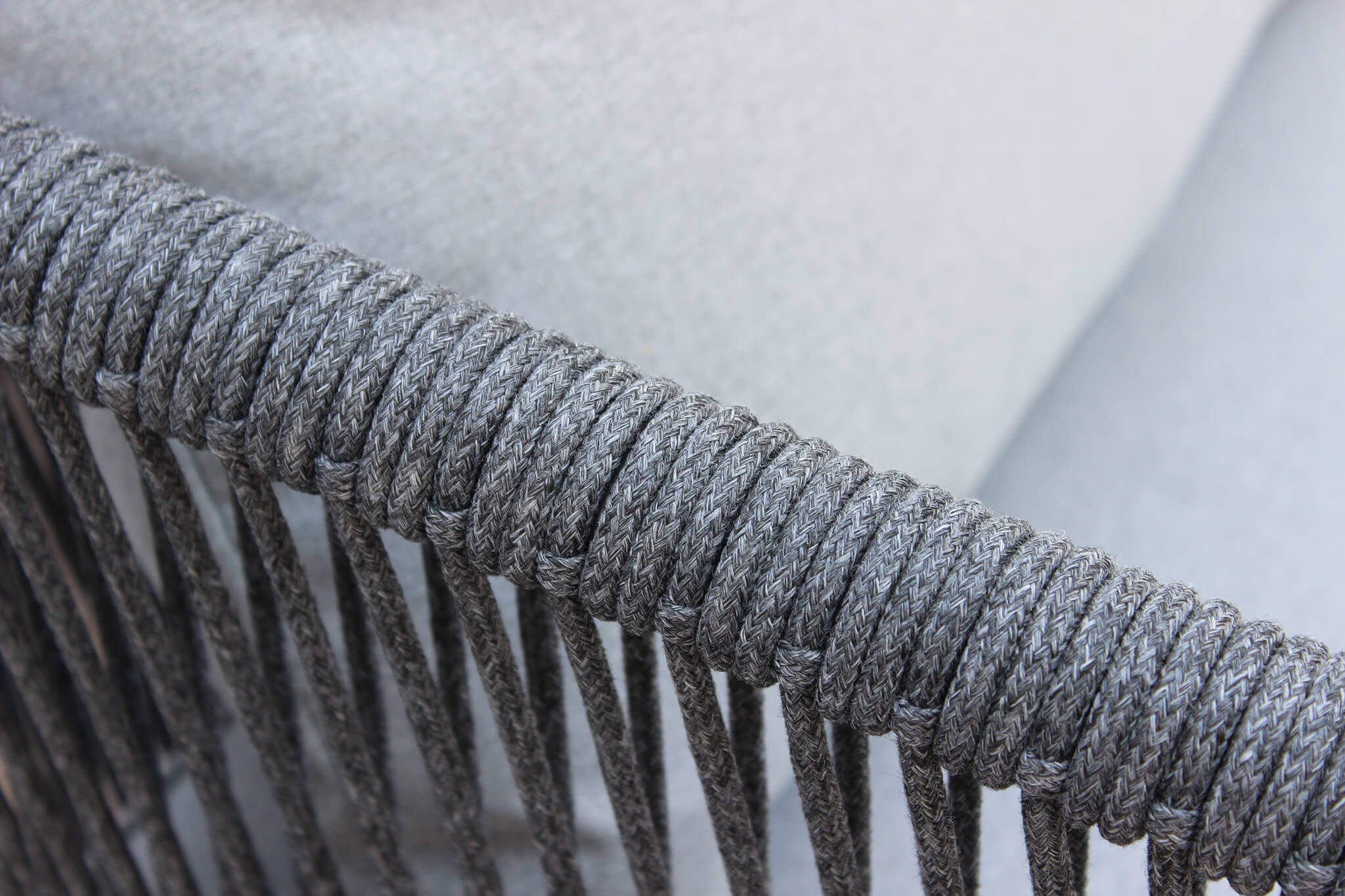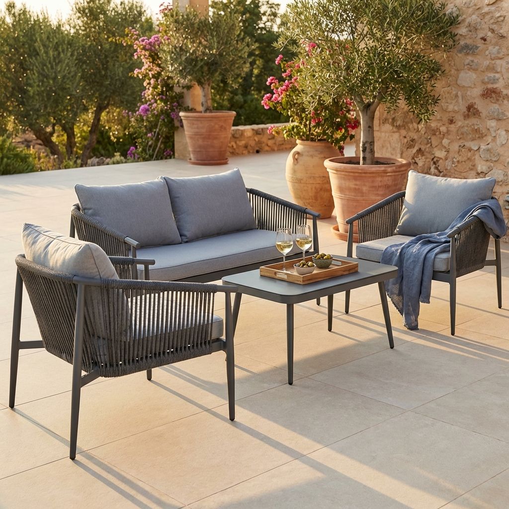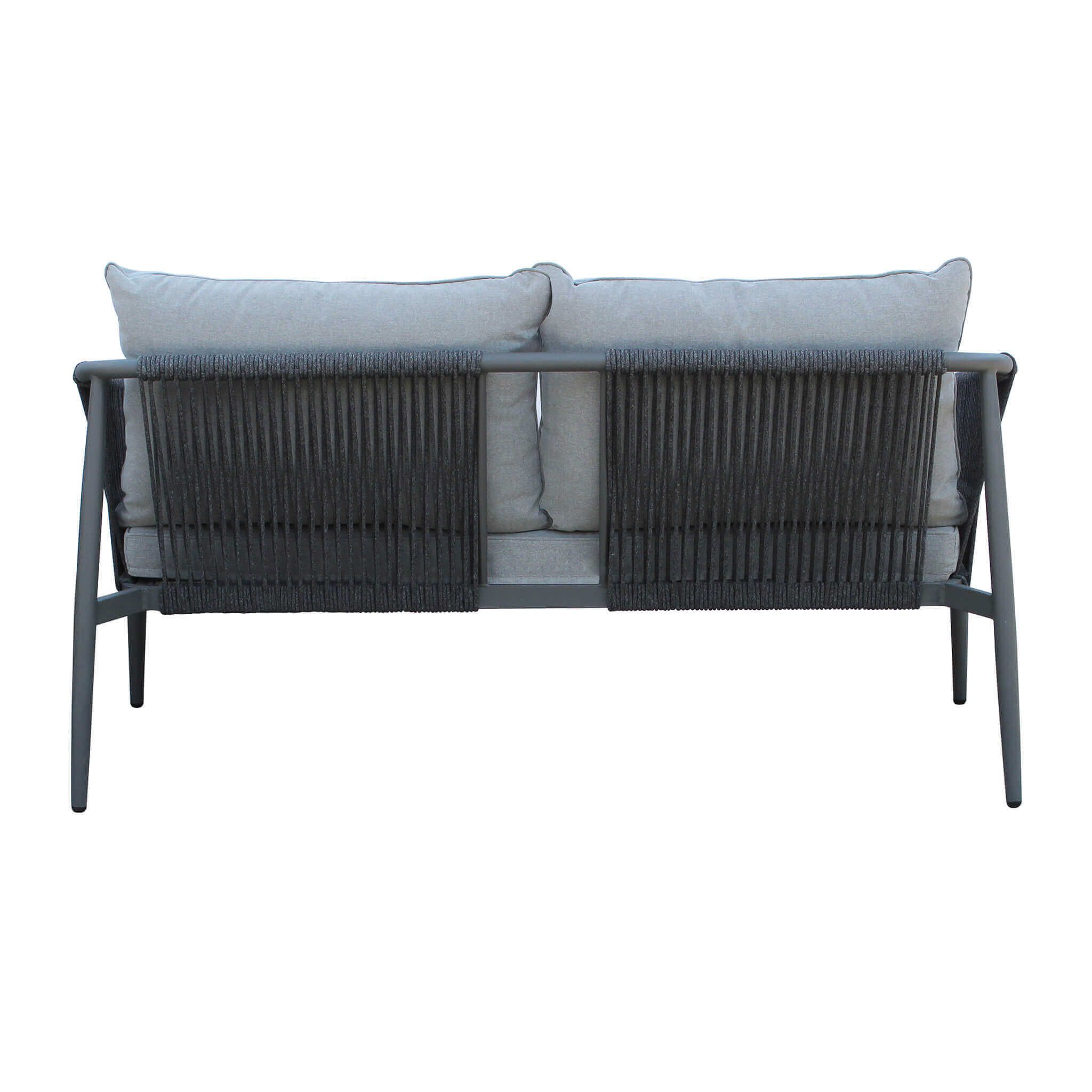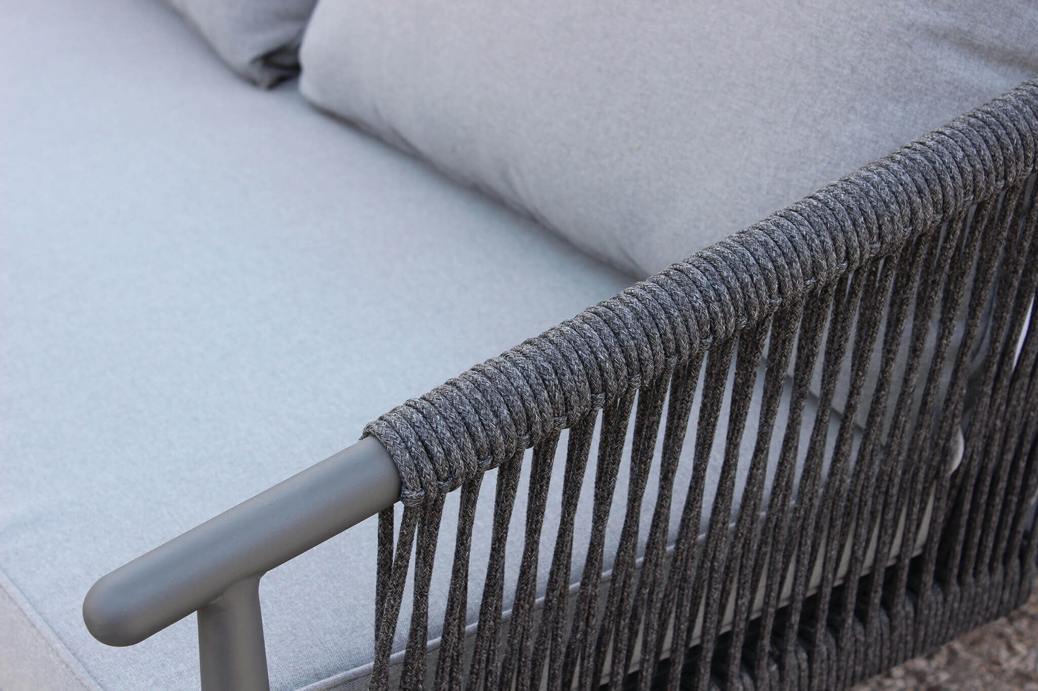 il salotto KISHORI 4 posti è un elegante salotto in alluminio impreziosito da un intreccio in corda nautica e il tavolino con piano in vetro effetto pietra disponibile in 2 varianti di grigio chiaro e scuro