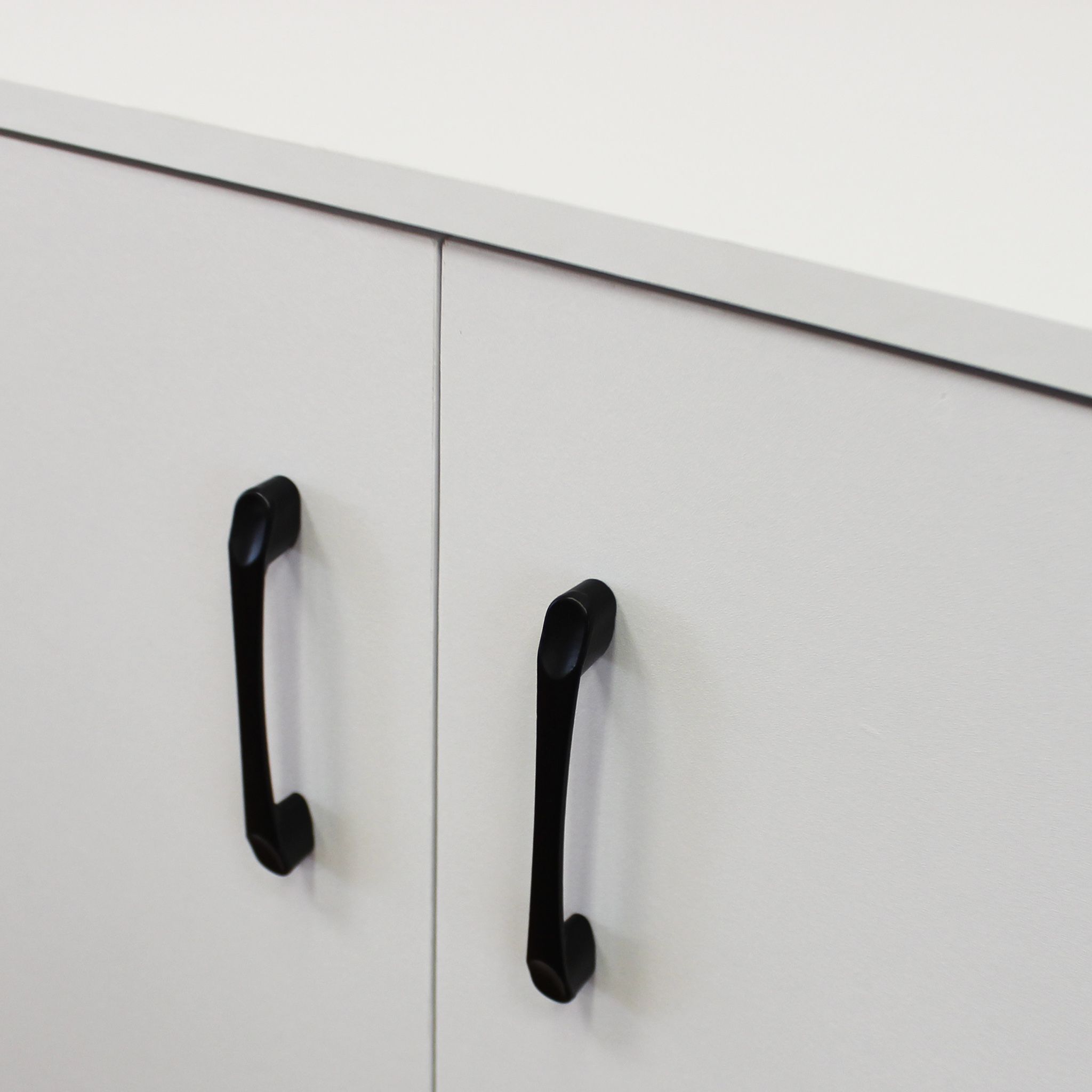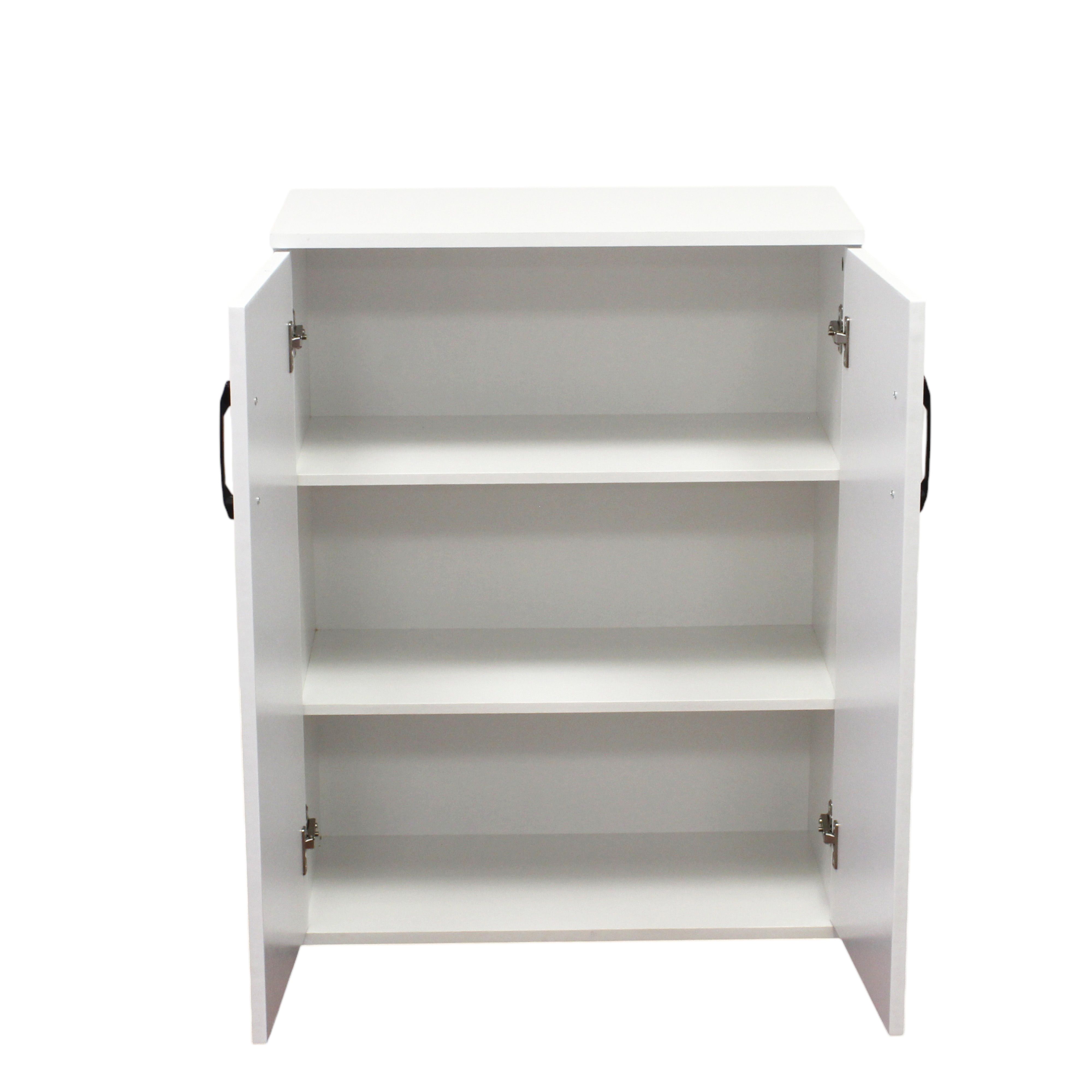 Mobile contenitore in pannello truciolare bianco con due ante e tre ripiani interni. Compatto e versatile, è ideale per organizzare accessori, libri, scarpe o giochi in qualsiasi ambiente della casa. Le maniglie nere donano un elegante contrasto, rendendolo perfetto per chi cerca ordine e stile in un unico arredo.