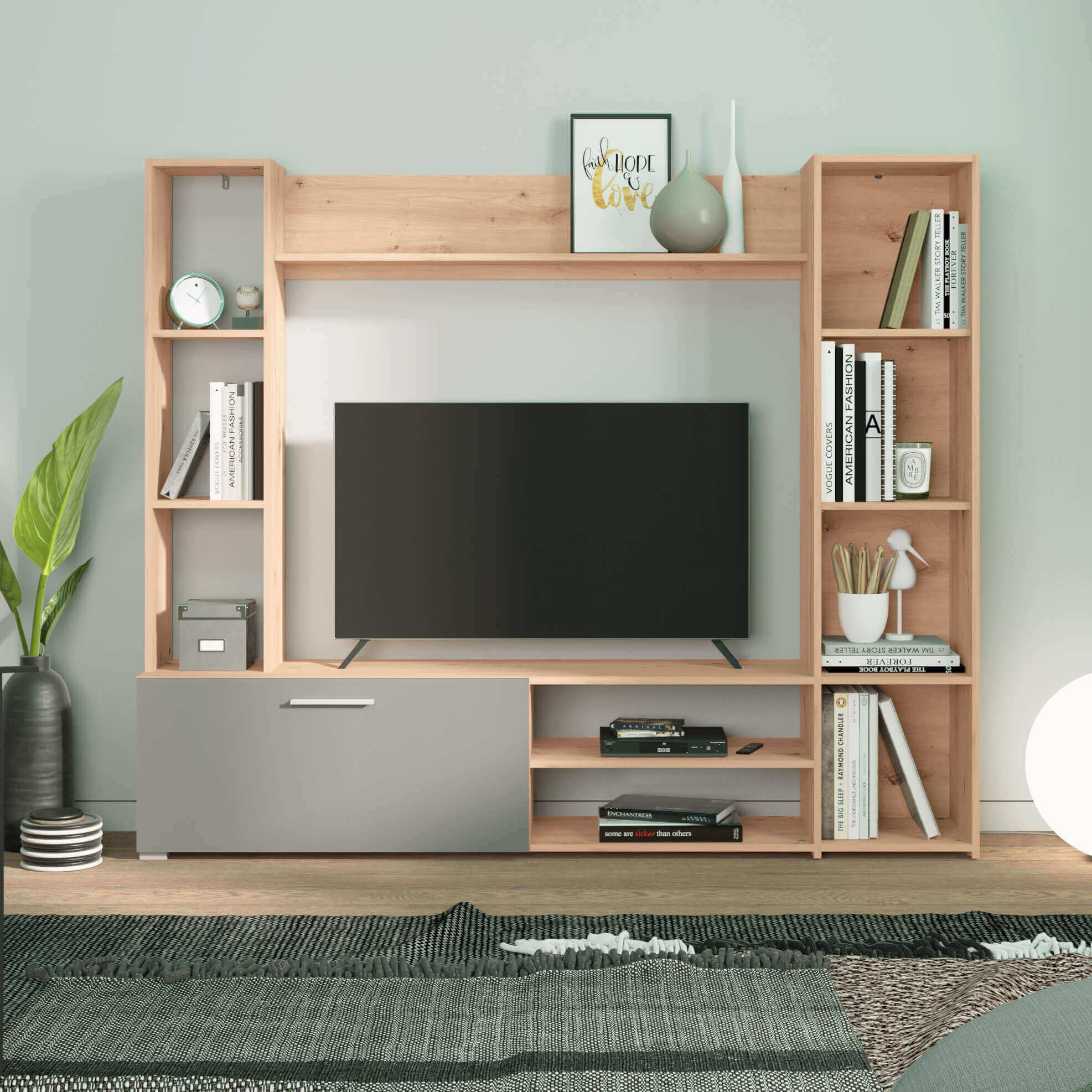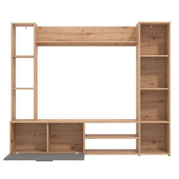 Sei stanco di quel vecchio e noioso stile del tuo soggiorno? Hai bisogno di un nuovo look moderno e minimalista? Allora la parete attrezzata KRISTIE potrebbe essere proprio ciò che stai cercando!Con le sue dimensioni di 185,5 x 35 x 155,5 h, questa parete attrezzata in legno di alta qualità offre uno spazio di stoccaggio ampio e versatile per la tua TV, stereo, libri e molto altro ancora. Ma non è solo la sua funzionalità che la rende speciale. Il suo design moderno ed elegante si adatta perfettamente a qualsiasi stile di arredamento, da quello classico al contemporaneo.