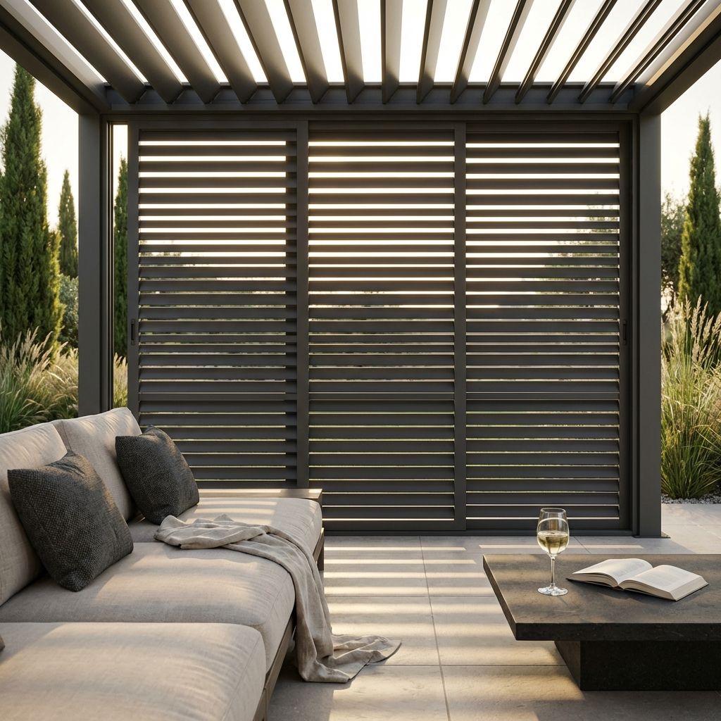 Il laterale scorrevole con lamelle LAMM trasforma la vostra pergola bioclimatica in un'opera di arte funzionale. Regolate facilmente luce e aria per un comfort ambientale personalizzato, con un design raffinato e resistente.