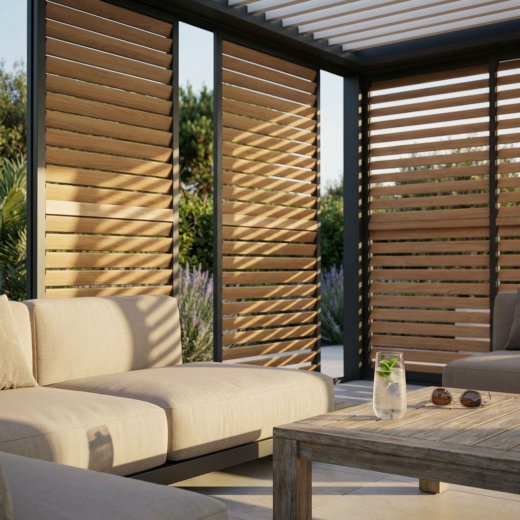 Il laterale scorrevole con lamelle LAMM trasforma la vostra pergola bioclimatica in un'opera di arte funzionale. Regolate facilmente luce e aria per un comfort ambientale personalizzato, con un design raffinato e resistente.