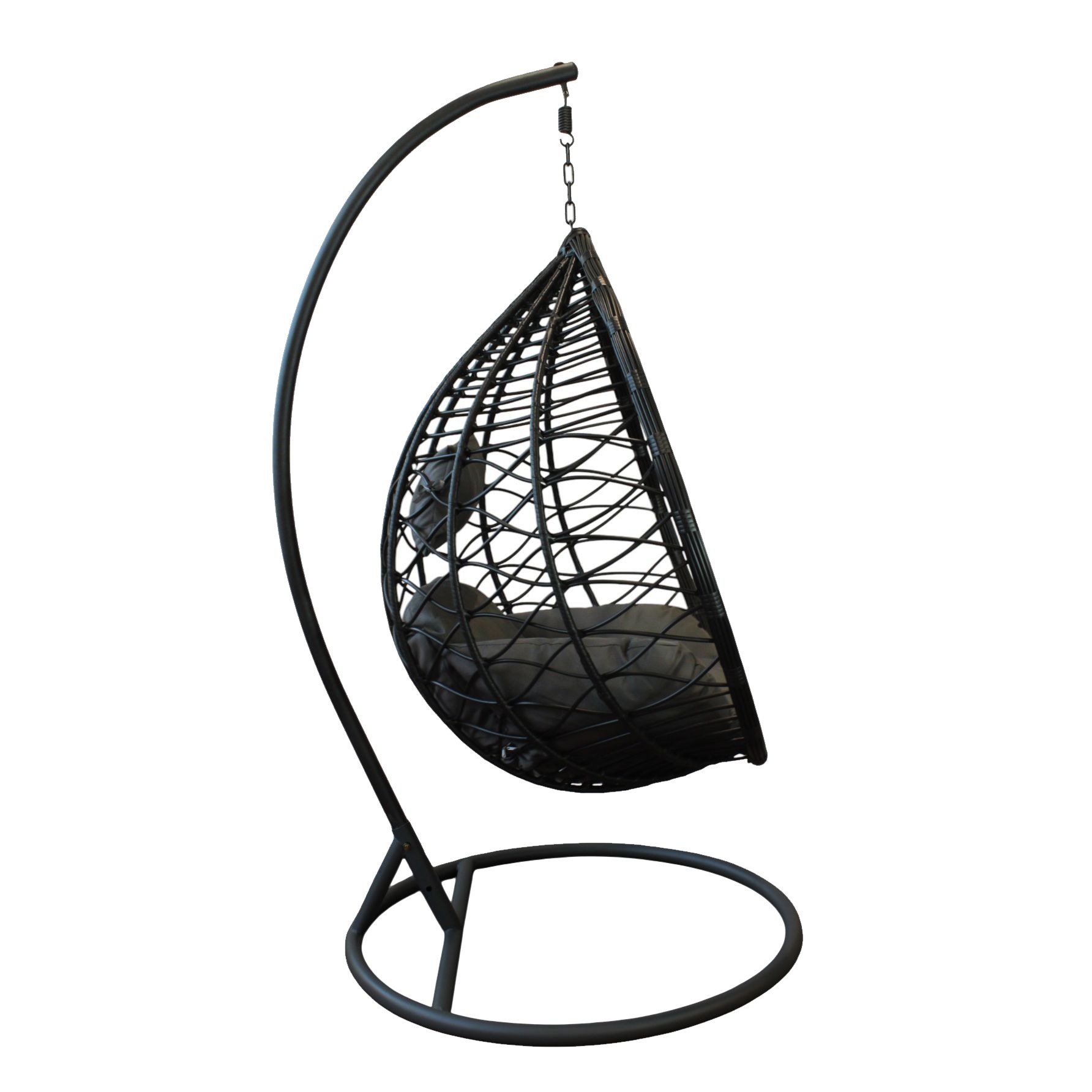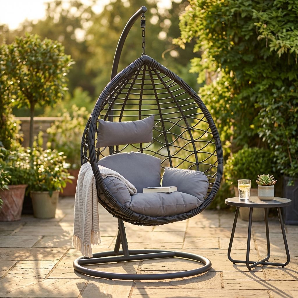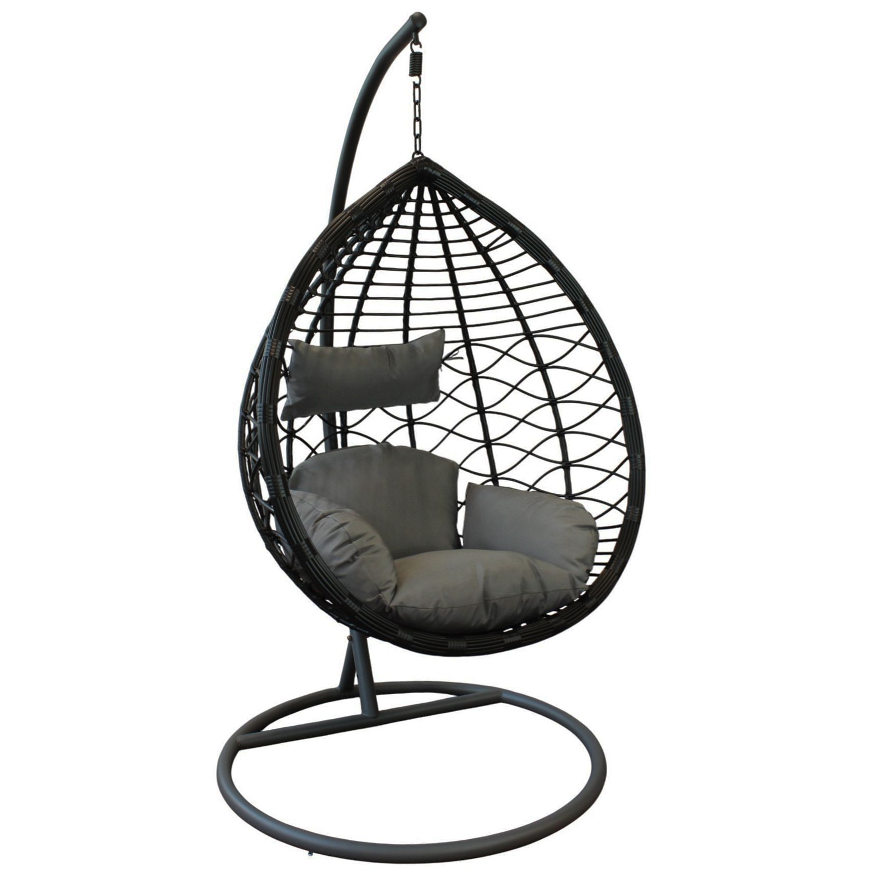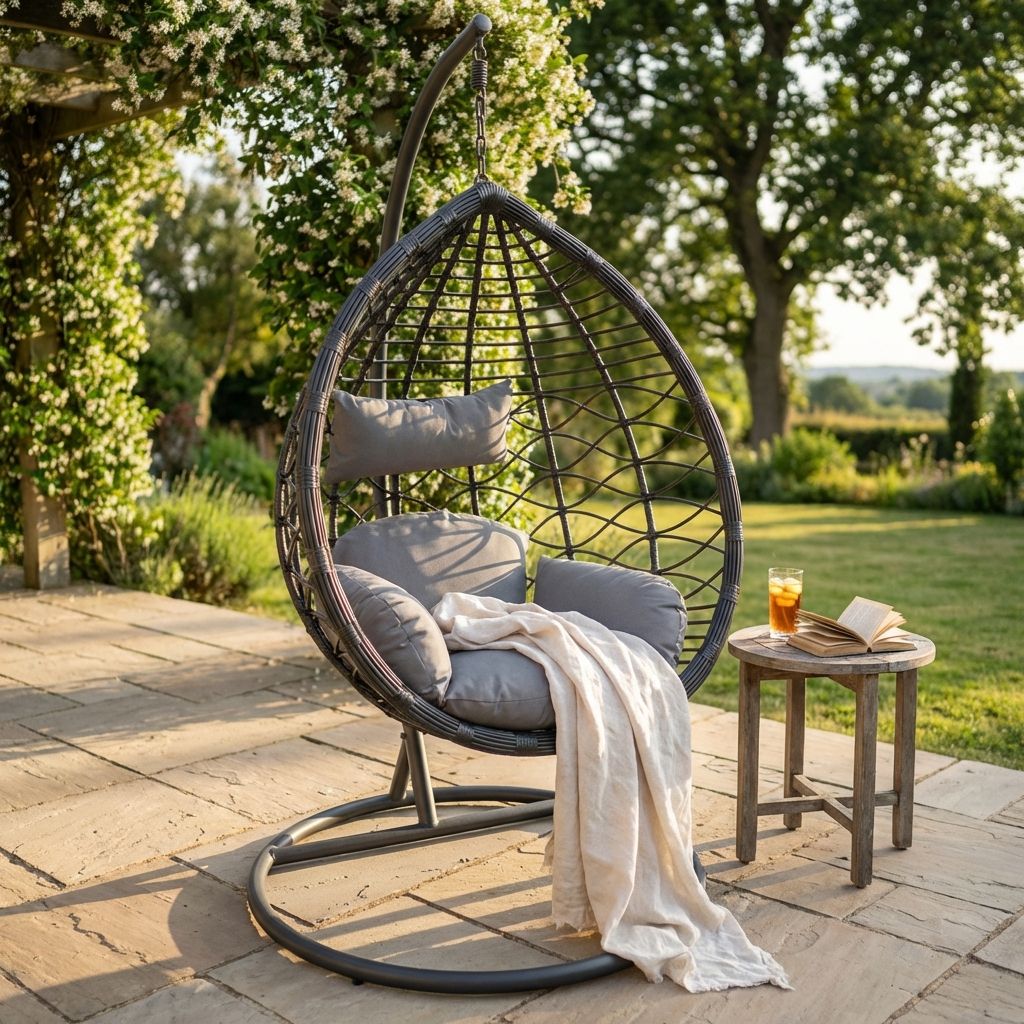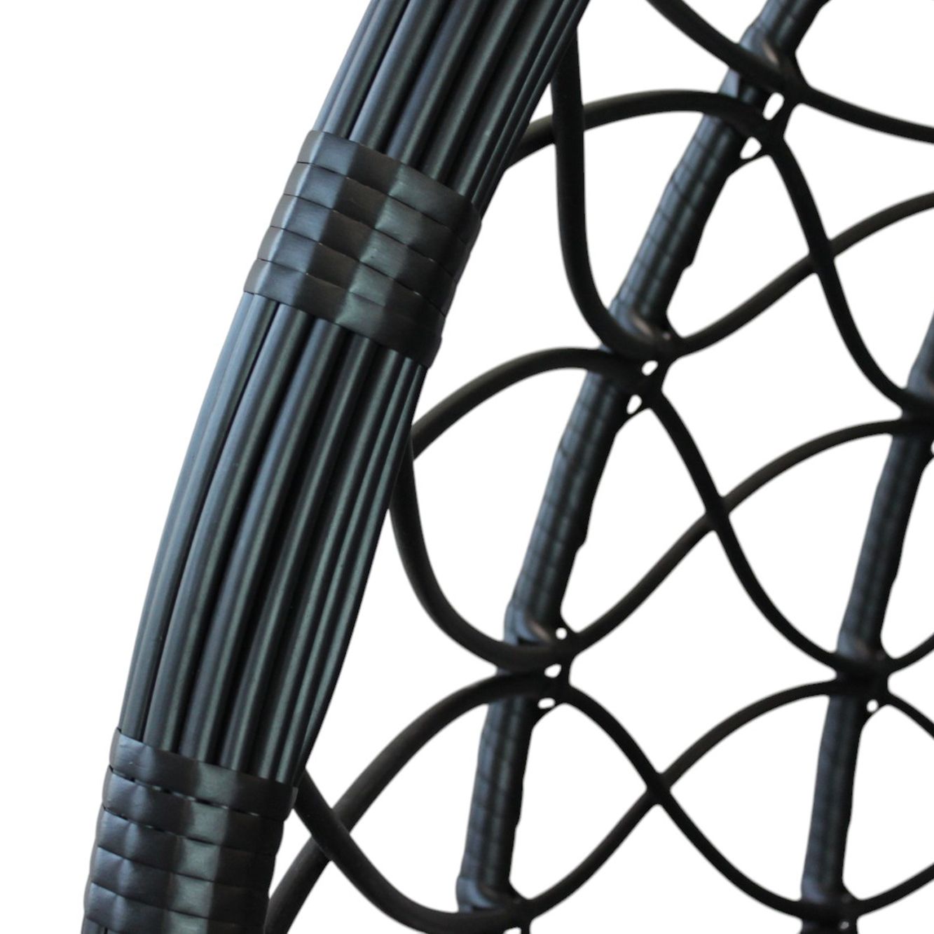Elegante dondolo sospeso con solida struttura in metallo e raffinato intreccio in wicker. La seduta avvolgente, impreziosita da cuscini in poliestere coordinati, offre massimo comfort e un dolce dondolio rilassante. Perfetto per giardini, terrazze o verande, unisce stile e funzionalità, trasformando ogni spazio outdoor in un’oasi di benessere.