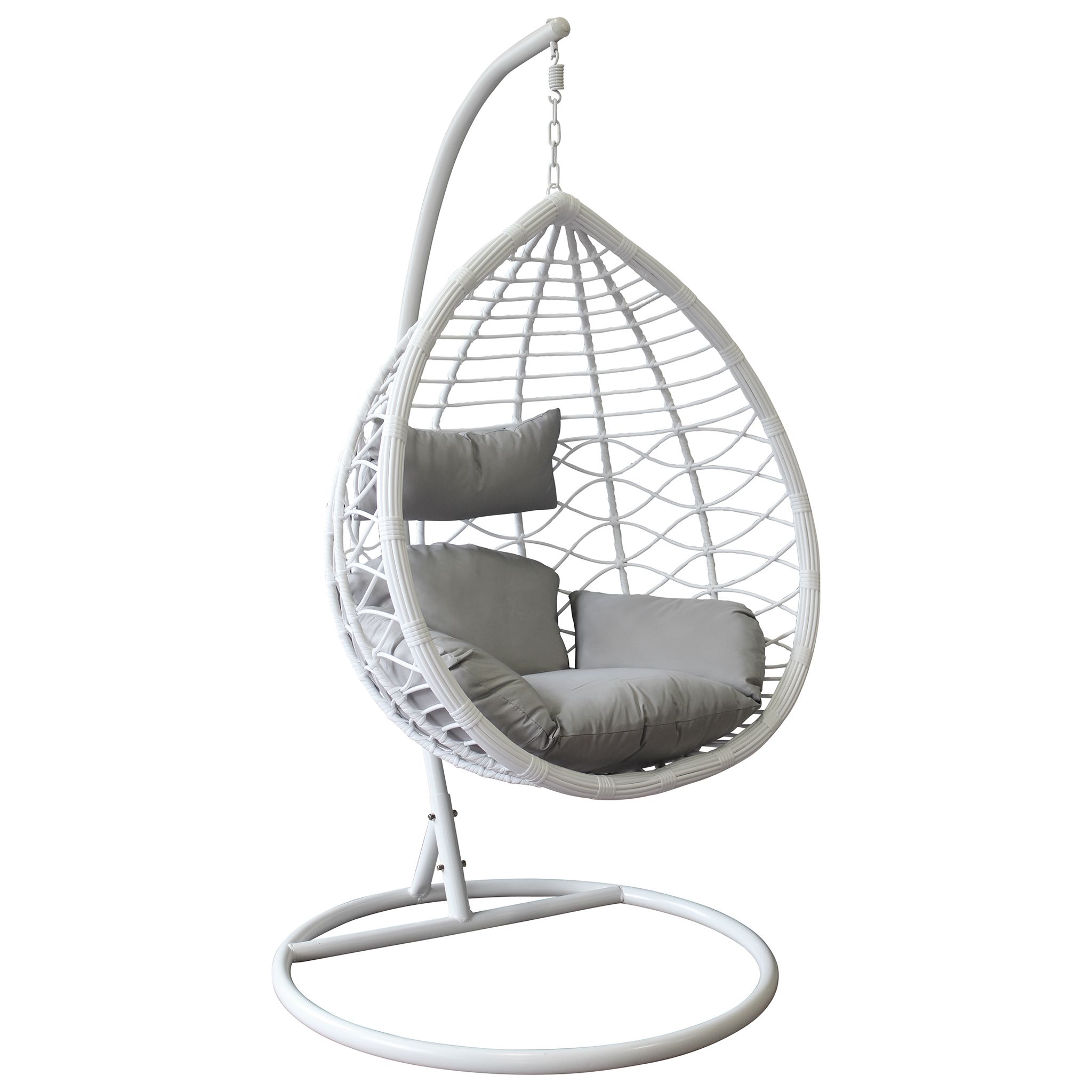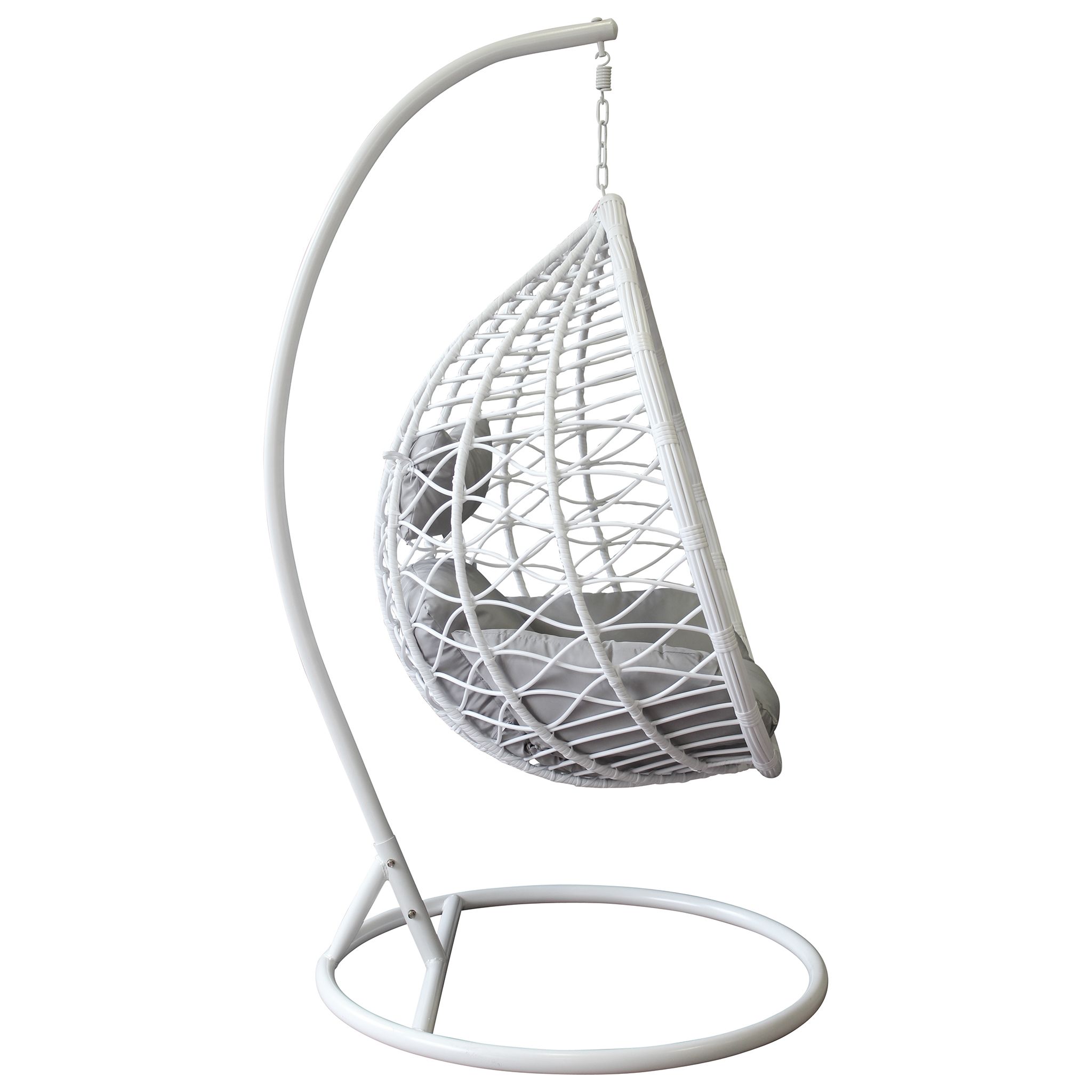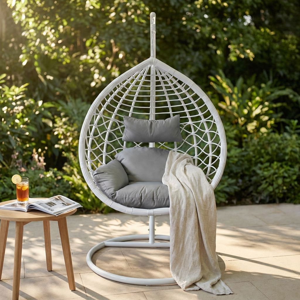 La sedia sospesa LANEY, con la sua struttura aerea e design moderno, è disponibile in bianco, grigio e marrone naturale. Perfetta per aggiungere un angolo di relax unico e stiloso all'esterno come all'interno della tua casa.