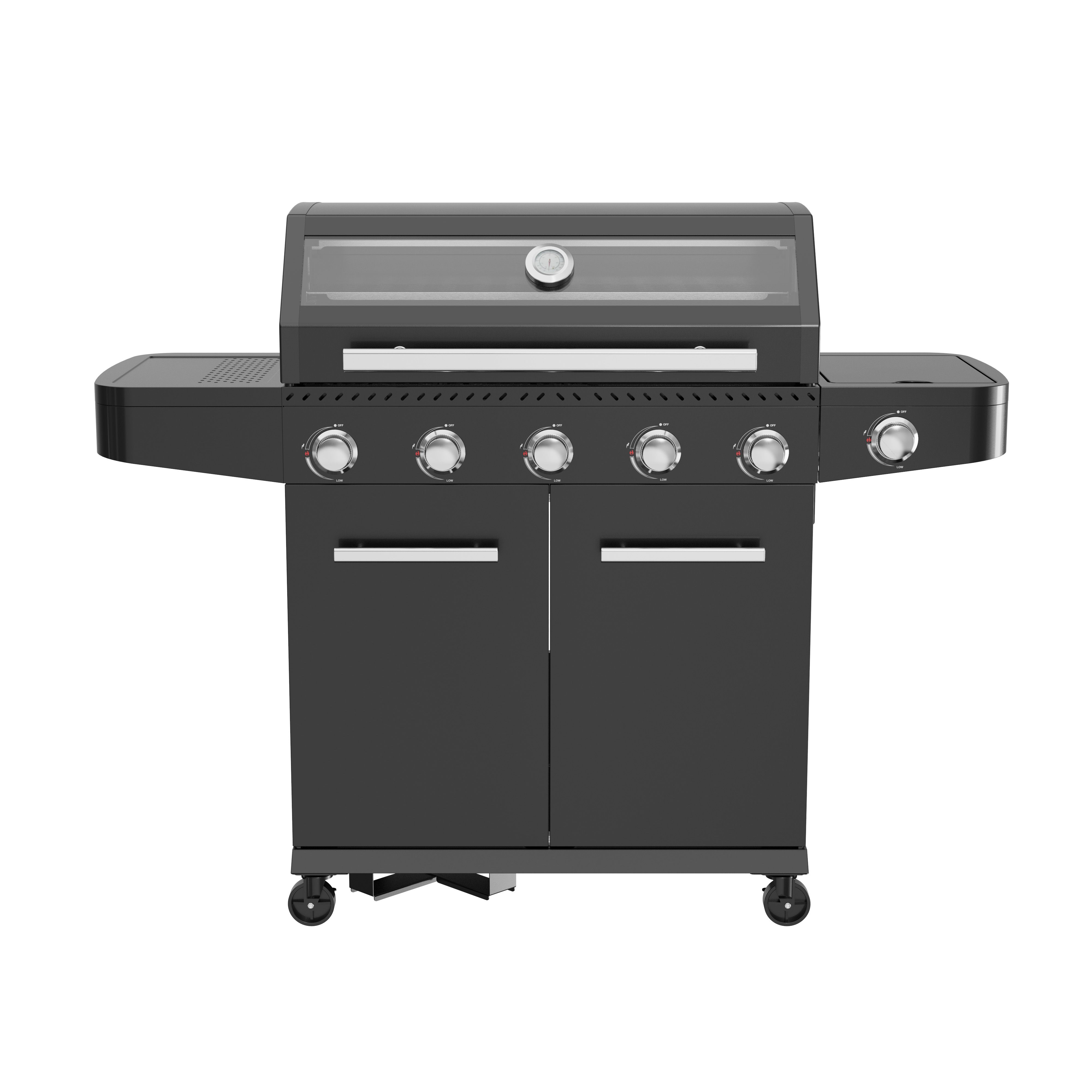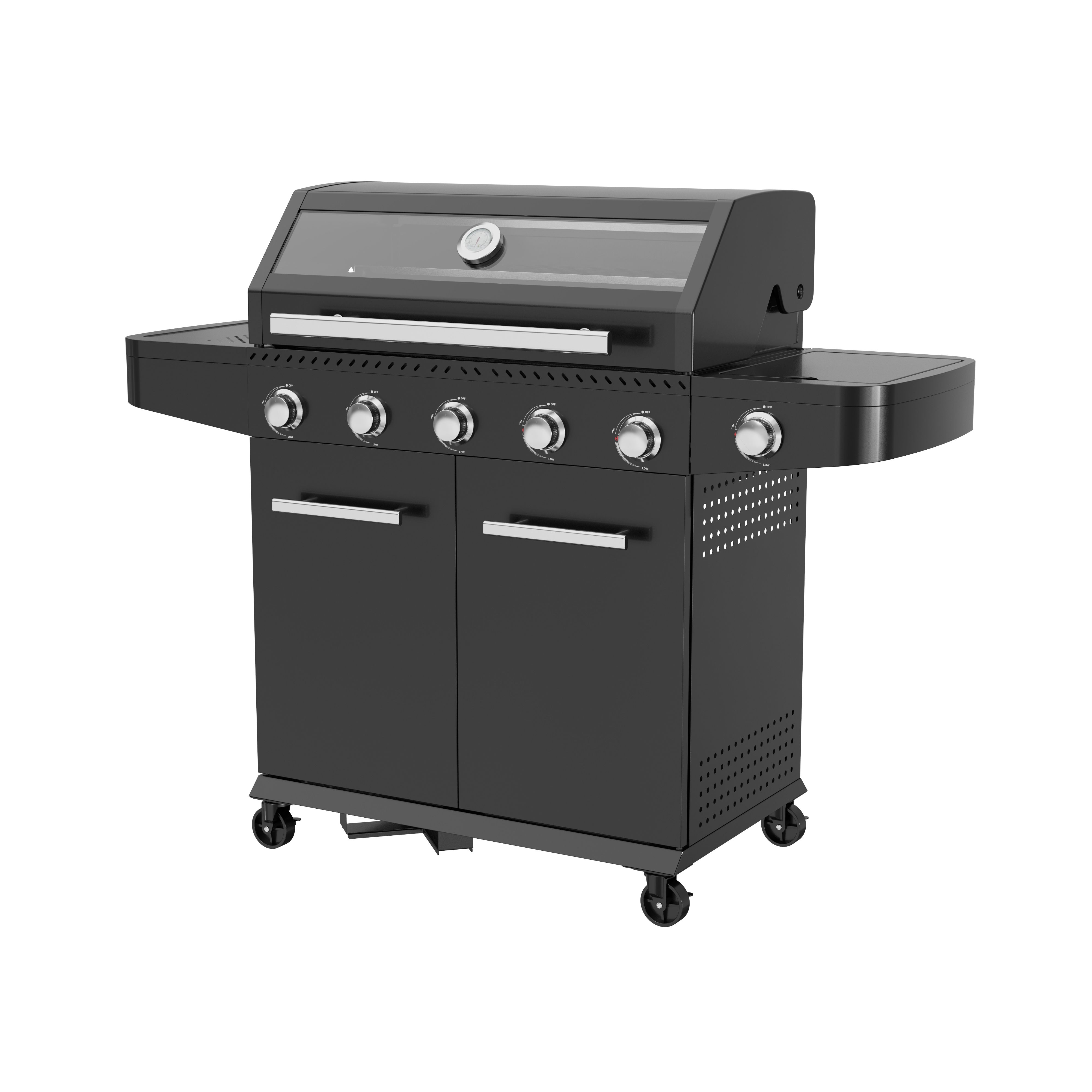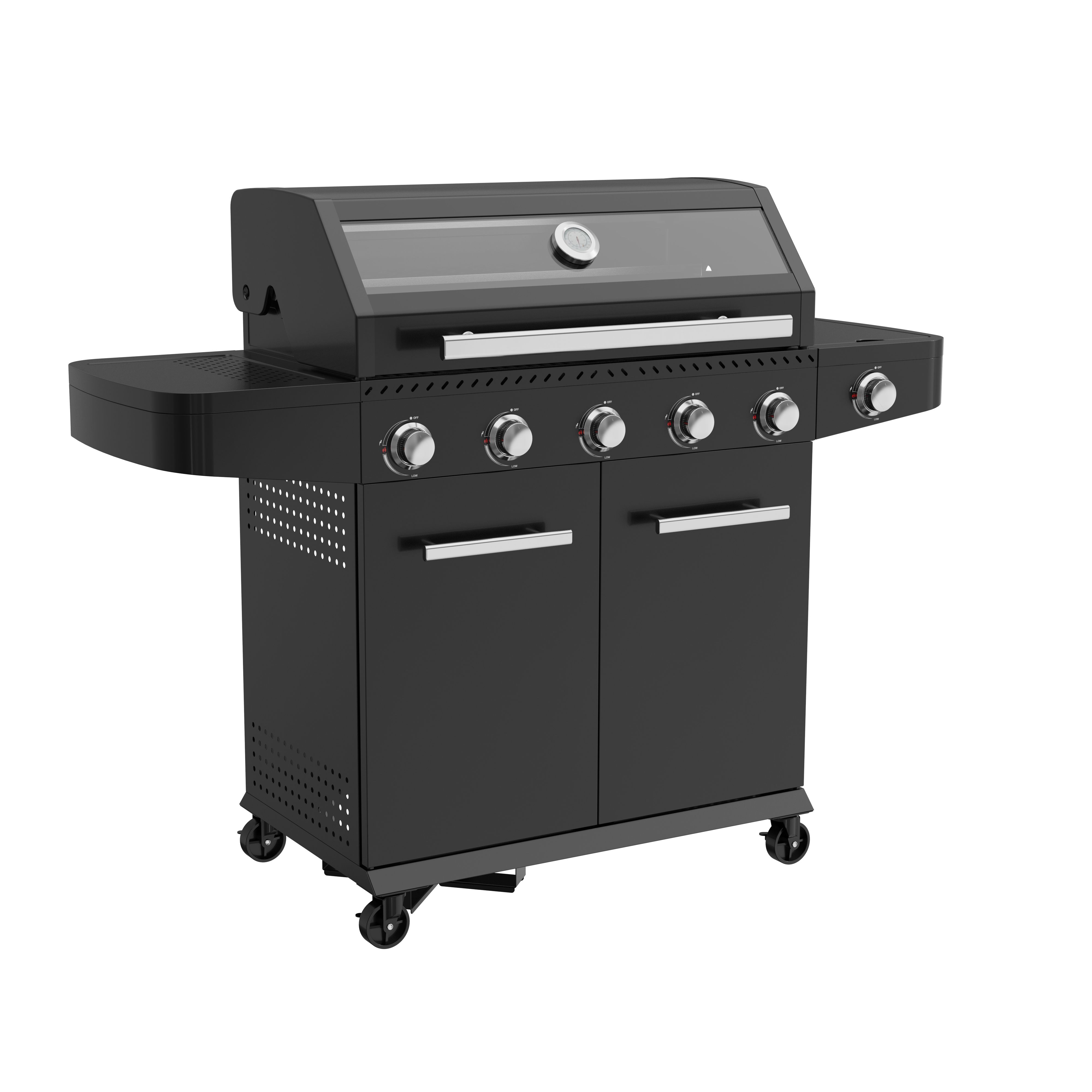 Barbecue a gas con 5 bruciatori principali + 1 laterale, coperchio con vetro e termometro integrato. Struttura in metallo verniciato nero, ripiani laterali funzionali e vano inferiore con ante. Dotato di ruote per un facile spostamento, è ideale per grigliate complete in giardino o terrazzo.