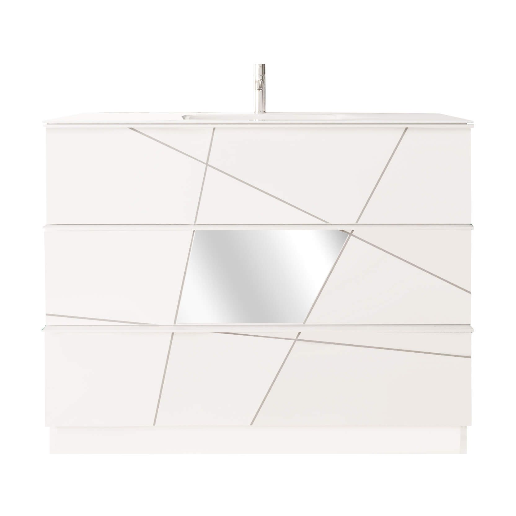 La collezione LIA si distingue per il suo mobile lavabo a terra dal design distintivo e moderno. Il pezzo è caratterizzato da un'intelligente composizione geometrica sulla facciata, che crea un piacevole gioco di linee incrociate, aggiungendo un forte impatto visivo e stilistico al mobile.Il mobile lavabo LIA si adatta con grazia sia a spazi essenziali e minimalisti sia a contesti più audaci e colorati, evidenziando la sua capacità di inserirsi in ambienti diversificati. Con una superficie accogliente per il lavandino e la rubinetteria, il mobile combina in modo efficace estetica e utilità. I cassetti sottostanti offrono soluzioni pratiche di stoccaggio, ideali per organizzare vari oggetti di uso quotidiano nel bagno.La finitura bianca opaca del mobile garantisce una grande versatilità, permettendogli di integrarsi con facilità in una vasta gamma di schemi cromatici e design d'interni. La texture presente su parte del cassetto inferiore introduce un elemento di contrasto sottile, aggiungendo interesse visivo senza compromettere la pulizia delle linee del design.Ideale per chi ricerca una combinazione di funzionalità e stile, il mobile lavabo a terra della collezione LIA è una scelta eccellente per elevare l'estetica di un bagno moderno, creando un'atmosfera raffinata e invitante.