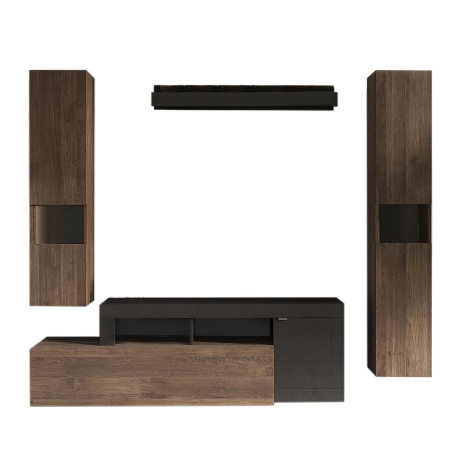 La parete attrezzata "LIBERTY" rappresenta un elegante equilibrio tra stile contemporaneo e funzionalità. Ogni componente di questo set è stato progettato con una particolare attenzione ai dettagli, per garantire non solo un aspetto estetico accattivante, ma anche una funzionalità pratica.Le due colonne verticali in legno sul lato, con finiture in legno chiaro, offrono ampi spazi per l'esposizione, permettendoti di mostrare i tuoi oggetti decorativi preferiti o libri. Queste colonne fungono da elemento verticale dominante, contribuendo a dare una sensazione di altezza alla stanza.Al centro, il supporto TV in nero opaco si fonde perfettamente con l'ambiente circostante, offrendo spazio sufficiente per una grande televisione e ulteriori spazi al di sotto per dispositivi elettronici o altri piccoli oggetti. Accanto, il mobile basso in legno chiaro offre ulteriore spazio di stoccaggio, mantenendo una sensazione di leggerezza nell'intero design.Sopra il supporto TV, una mensola nera lunga ed elegante offre ulteriore spazio per esporre oggetti d'arte o piccoli elementi decorativi, completando l'aspetto contemporaneo della parete attrezzata.Con il suo design pulito e le sue linee semplici, la parete attrezzata "LIBERTY" si integra perfettamente in ambienti moderni, portando un tocco di classe e raffinatezza. È la scelta ideale per chi desidera unire stile, qualità e funzionalità in un unico pezzo d'arredamento.
