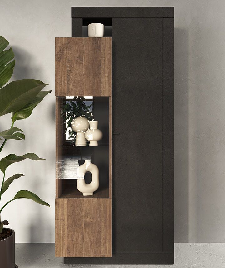 La vetrina "LIBERTY" rappresenta un incontro armonioso tra stile e funzionalità, diventando un complemento d'arredo indispensabile per chi desidera unire praticità e design moderno. Con il suo elegante mix di legno naturale e finiture in nero, questa vetrina si distingue per la sua presenza sofisticata e distintiva.La parte superiore della vetrina, con il suo vetro trasparente, offre un'anteprima degli oggetti d'arte e delle decorazioni al suo interno, consentendo di esporre con orgoglio le tue collezioni o oggetti di valore. La luce interna illumina delicatamente gli oggetti esposti, creando un'atmosfera accogliente e mettendoli in risalto.Nella parte inferiore, l'anta in legno offre uno spazio nascosto, ideale per riporre oggetti meno esposti o per conservare utensili e accessori. La finitura in legno chiaro contrasta magnificamente con l'anta in nero opaco, dando vita a un equilibrio visivo che cattura l'attenzione.Il design sottile e raffinato della vetrina "LIBERTY" si integra perfettamente in qualsiasi ambiente, sia che tu stia cercando di aggiungere un tocco di modernità al tuo spazio o di creare un punto focale in una stanza. La sua struttura robusta e i materiali di alta qualità assicurano che questa vetrina non solo apparirà splendida, ma durerà anche nel tempo.Scegliendo la vetrina "LIBERTY", stai optando per un pezzo di arredamento che combina bellezza, funzionalità e durata, rendendolo un investimento prezioso per la tua casa.