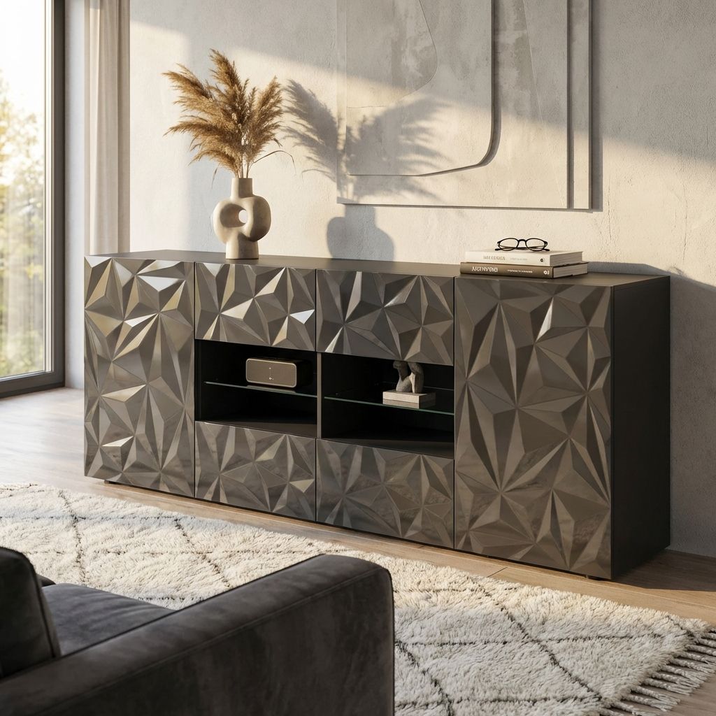 Rivisita lo spazio con la madia LION: il massimo della modernità incontra l'eleganza funzionale. Questo pezzo di design, disponibile in bianco e grigio, offre un gioco di luci con il suo design geometrico, garantendo allo stesso tempo ampio spazio di archiviazione. Perfetta per ogni stile d'arredo, la madia LION è la scelta ideale per chi cerca un elemento d'arredo distintivo e pratico.