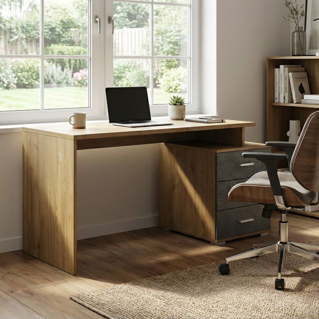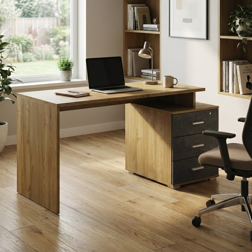 La scrivania GARE, con la sua cassettiera elegante e pratica, è l'ideale per chi cerca un'atmosfera di lavoro ordinata e stimolante. Il design moderno e la finitura in legno chiaro si adattano a ogni spazio lavorativo.