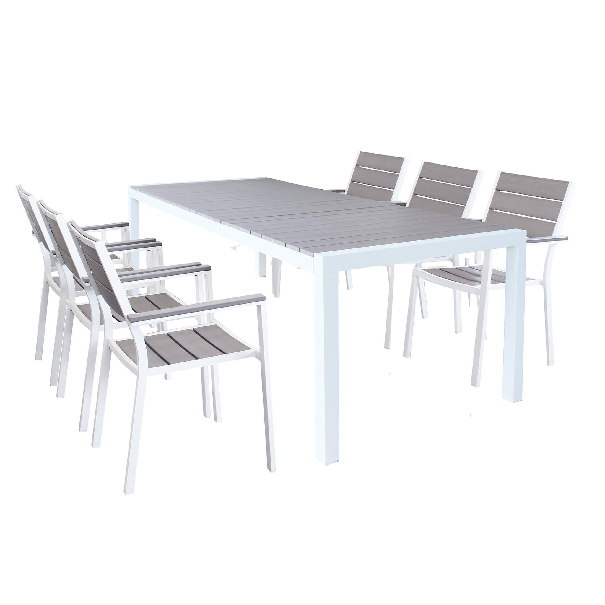 Sedute: La poltrona da giardino Xanthus, è realizzata in alluminio verniciato di bianco, la seduta lo schienale e i braccioli sono composti da doghe di polywood di colore grigio con venature che ricordano il legno.