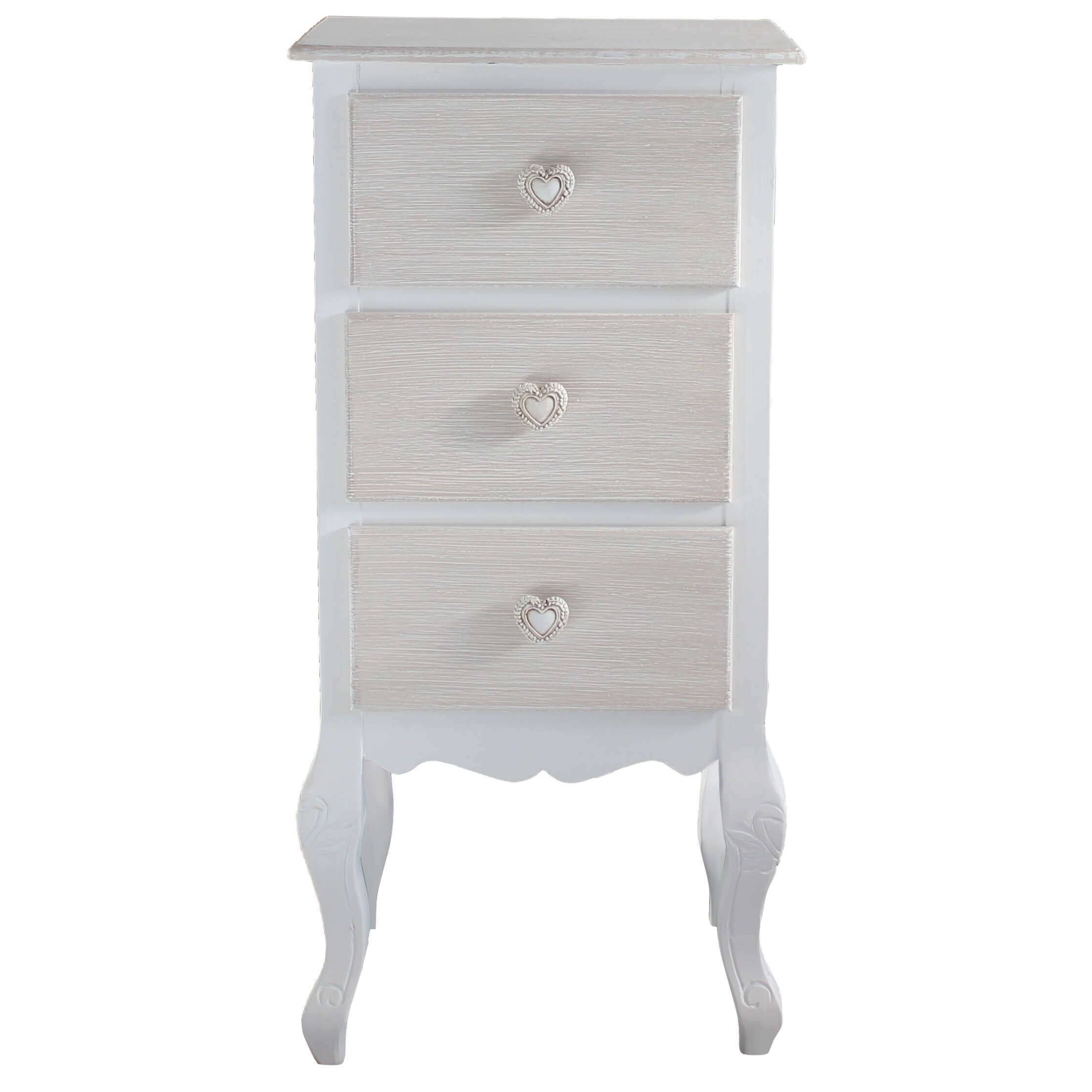 Mobiletto shabby chic a 3 cassetti, con eleganti pomelli a cuore e finiture anticate. Un complemento d’arredo ideale per dare alla casa un tocco romantico e vintage.