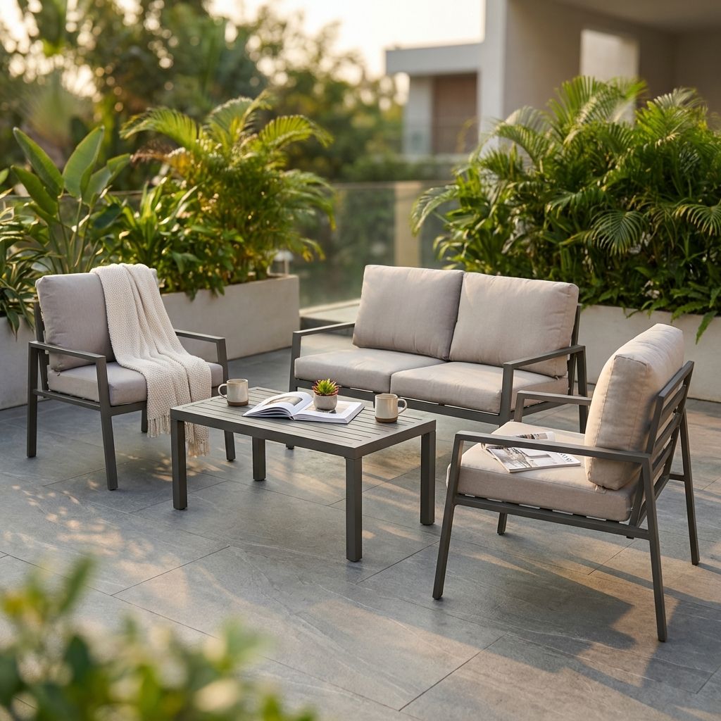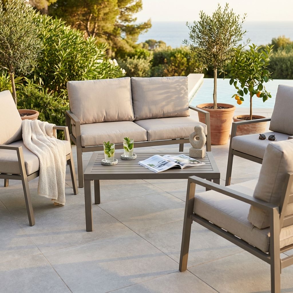 LUCIUS è un salotto comodo e pratico da 4 posti, realizzato in alluminio con cuscini sfoderabili e lavabili disponibile in 4 varianti colori antracite,bianco, tortora e taupe