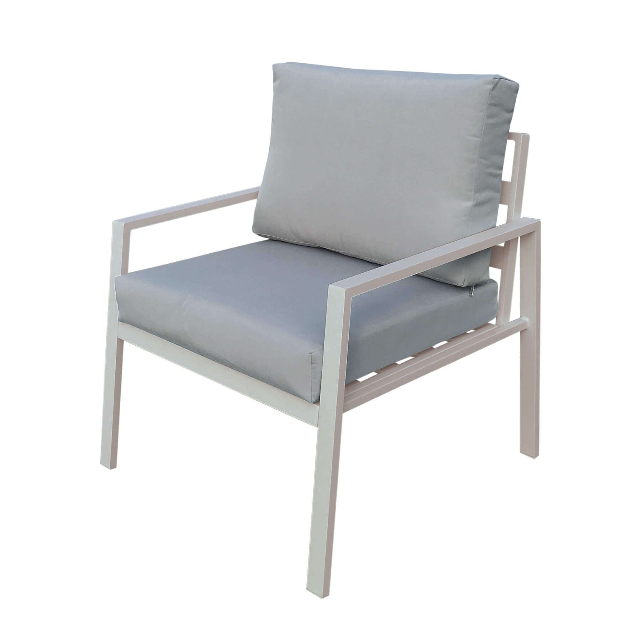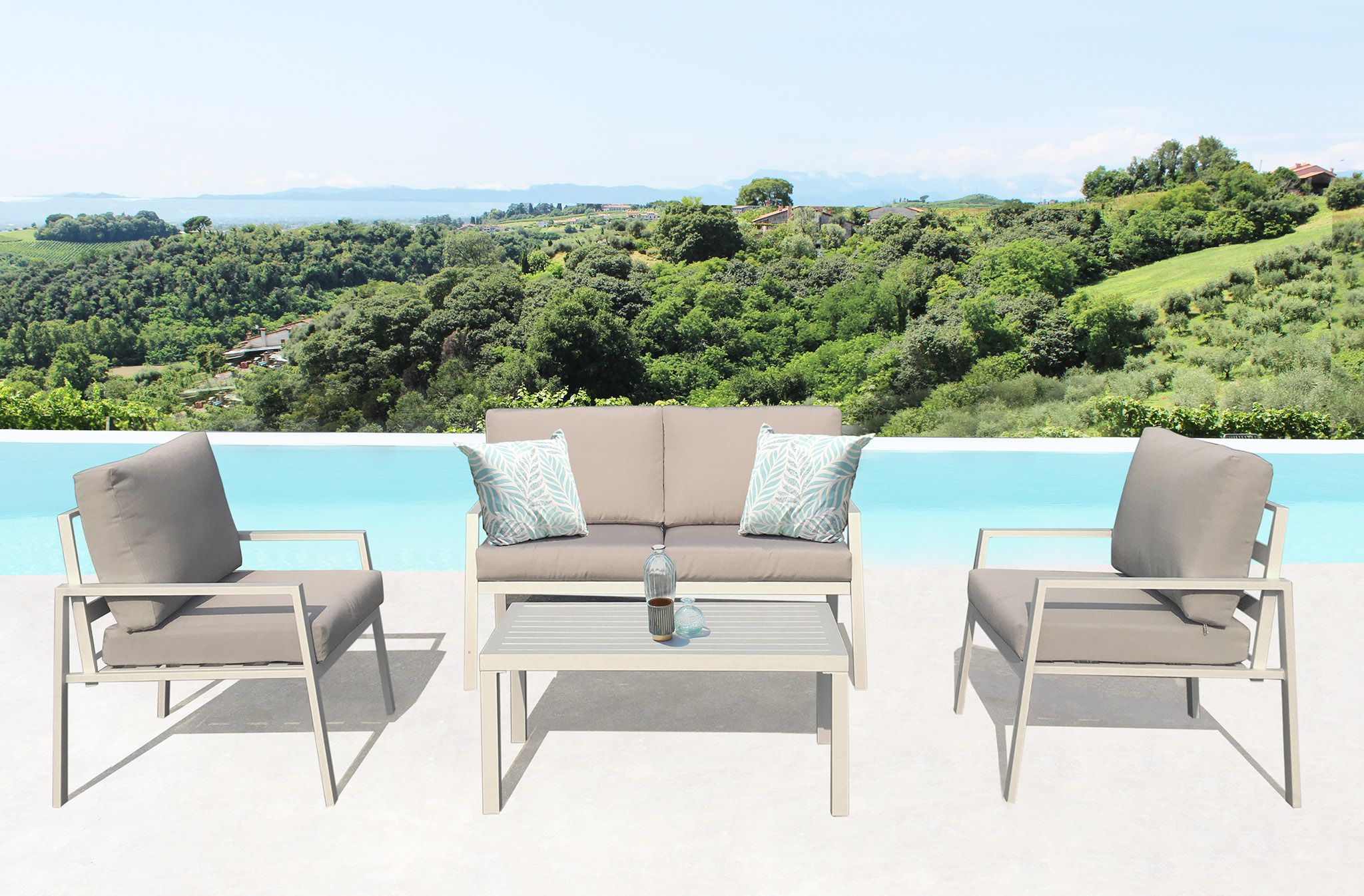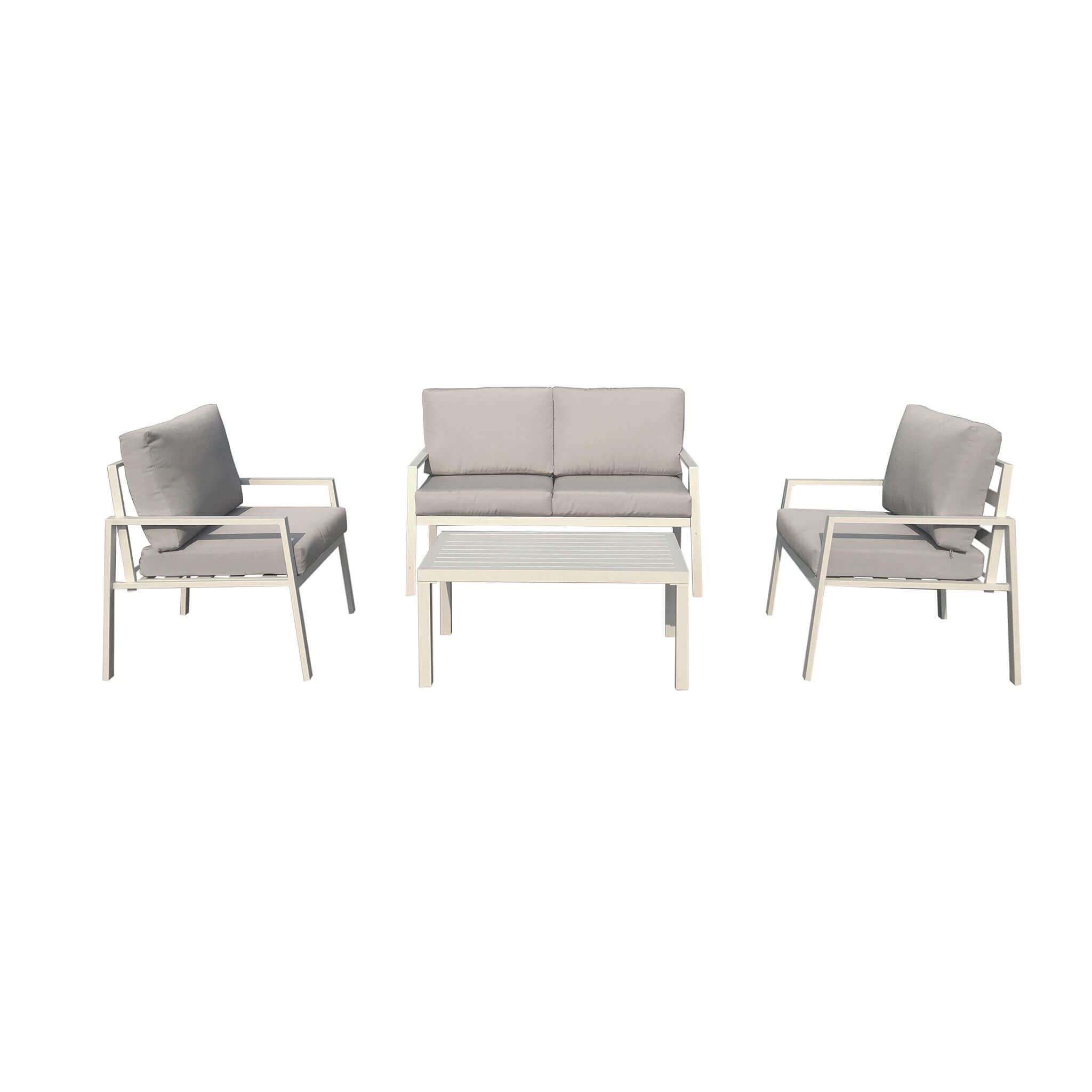 LUCIUS è un salotto comodo e pratico da 4 posti, realizzato in alluminio con cuscini sfoderabili e lavabili disponibile in 4 varianti colori antracite,bianco, tortora e taupe