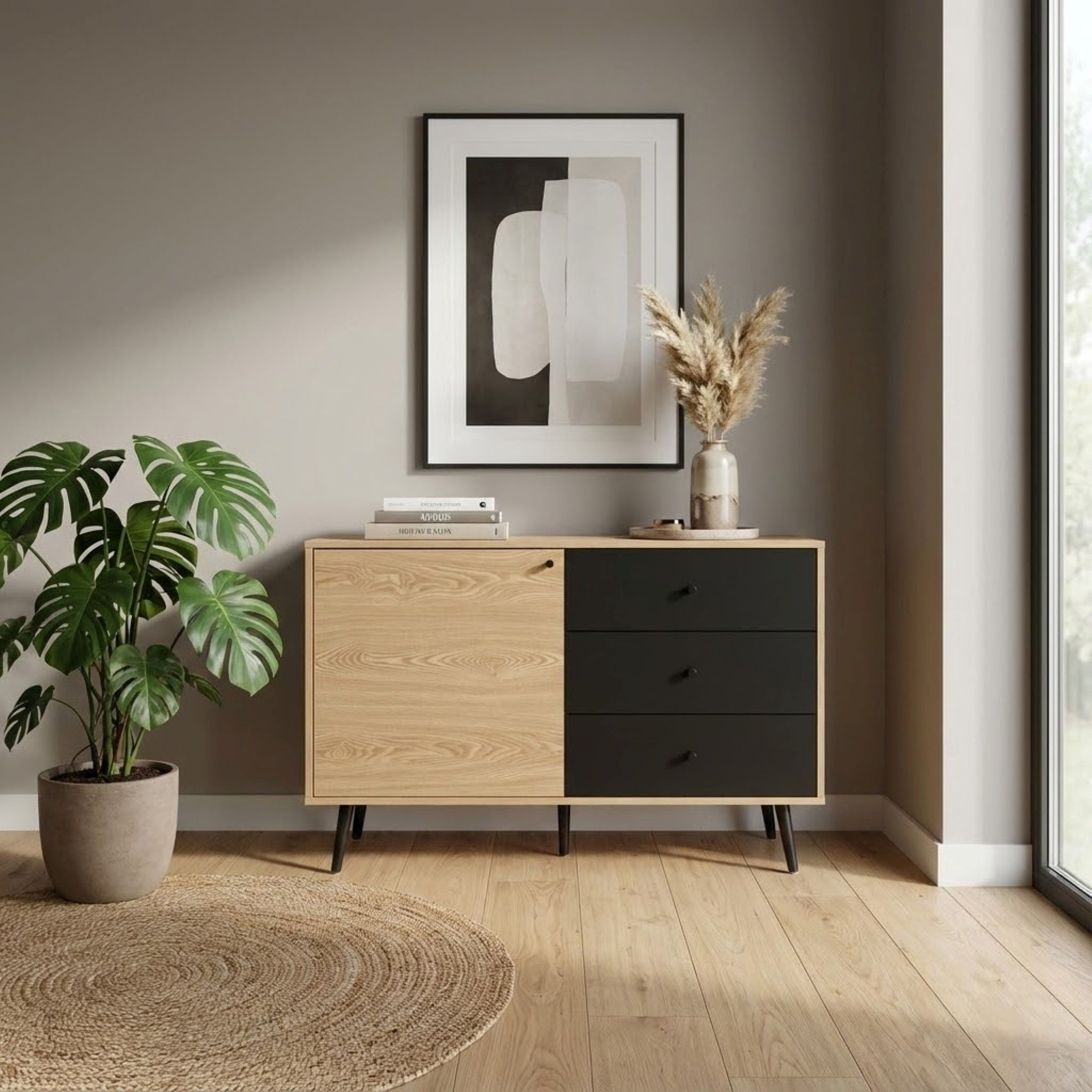 La madia LYNN è un mobile per il living, fondamentale averla nella costra casa se state cercando soluzioni estetiche e/o funzionali. Potrai riporci oggetti d'uso quotidiano oaccessori tipicamente decorativi. La madia LYNN in melamminico unisce le doti di funzionalità e stile dell'ambiente dando vita a un concept d’arredo moderno. Si presenta in una sapiente combinazione di grafite per i frontali dei 3 cassetti e sfumature di legno caldo per la struttura. Molto spaziosa internamente, essa è munita di 3 cassetti e 1 anta divisa con una mensola. E' semplice e funzionale e si adatta a qualsiasi stanza per qualiasi utilizzo, che sia mobile da ufficio o per la casa.