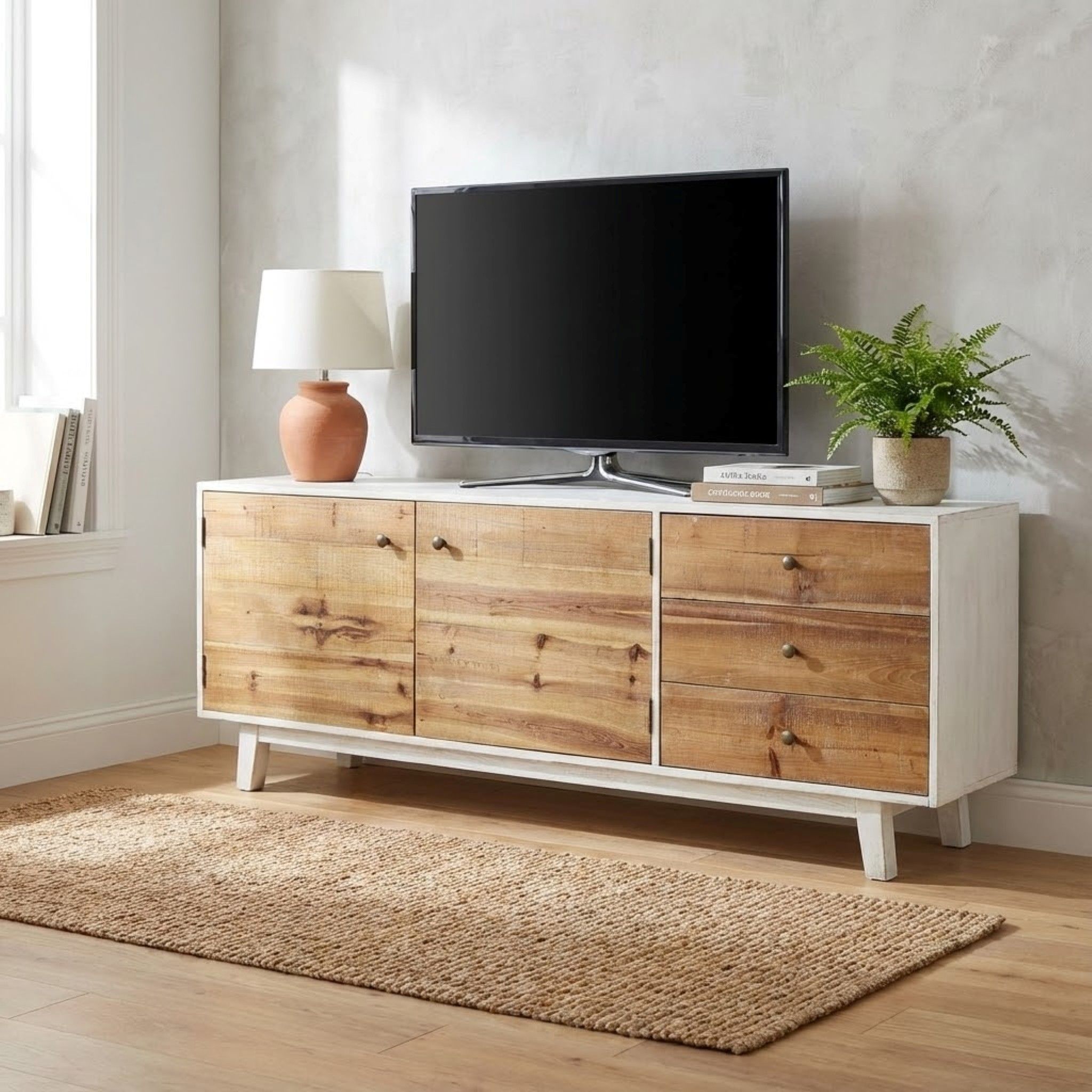 Il mobile TV MATRIX è perfetto per coloro che cercano uno stile classico e caldo nella propria casa. Con le sue 2 ante, 3 cassetti e una splendida finitura bianca, questo mobile aggiungerà un tocco di eleganza alla tua TV. I cassetti in legno naturale e i pomelli vintage in metallo mostrano l'attenzione ai dettagli. Non dovrai preoccuparti della mancanza di spazio, poiché i cassetti offrono ampio spazio per i tuoi dispositivi multimediali e altri oggetti essenziali. Porta il comfort nel tuo salotto con questo mobile TV di qualità.