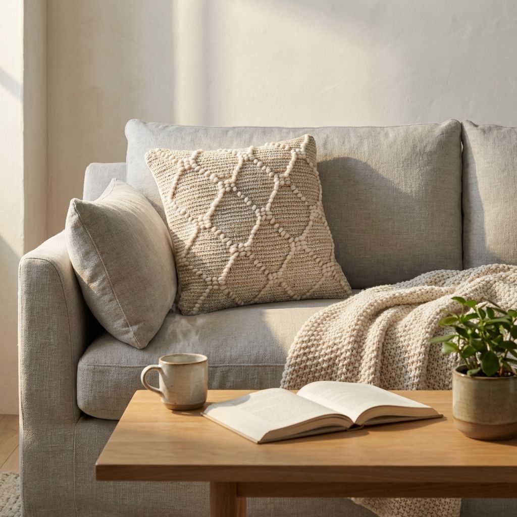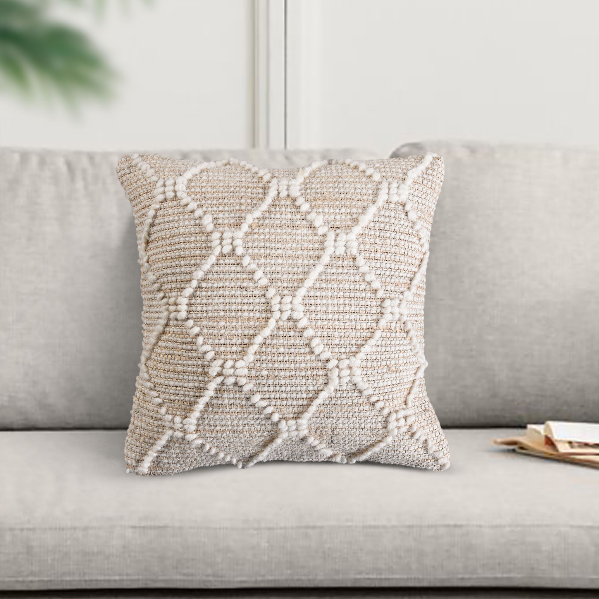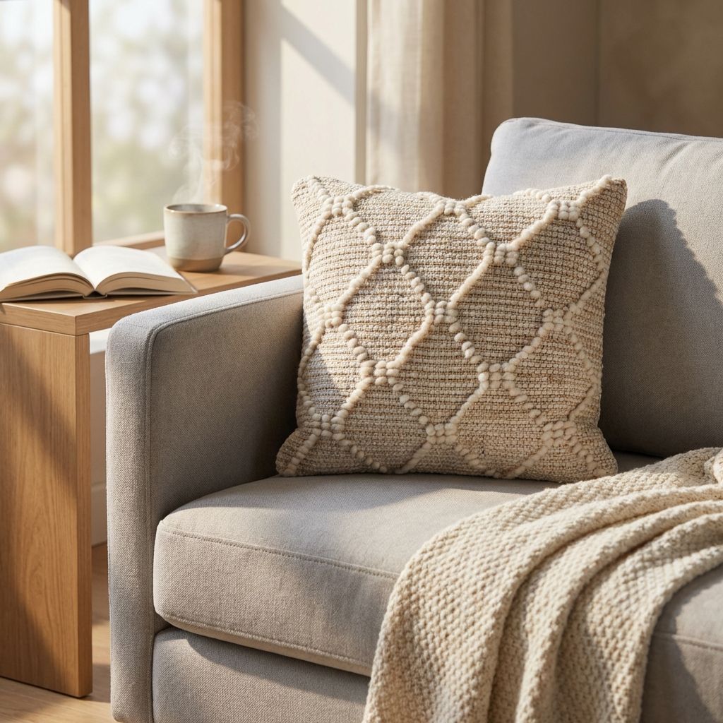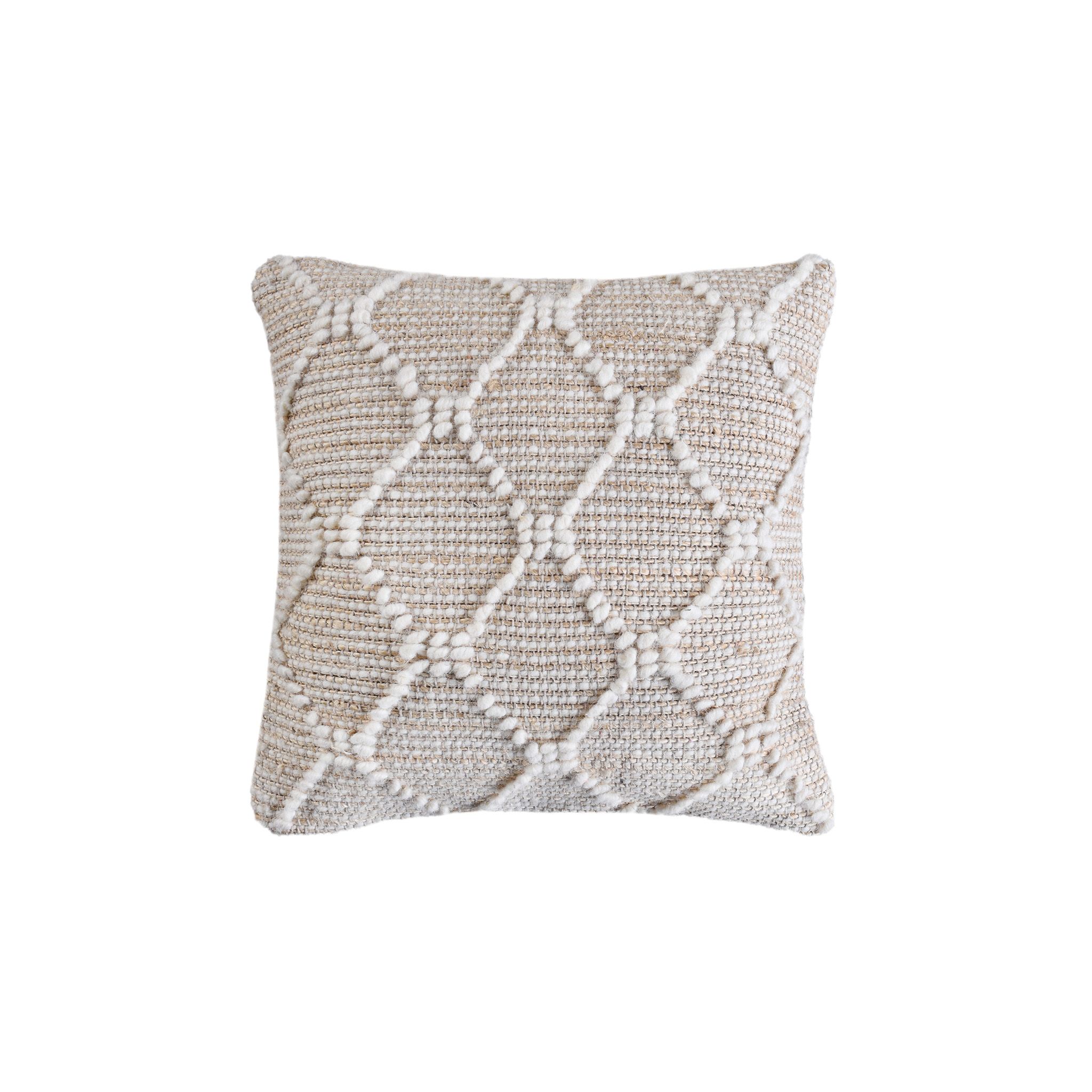Cuscino decorativo con federa in lana, caratterizzato da texture materiche e lavorazioni in rilievo. Aggiunge un tocco di calore e personalità a divani, poltrone e letti. Il design naturale e neutro lo rende ideale per ogni ambiente.