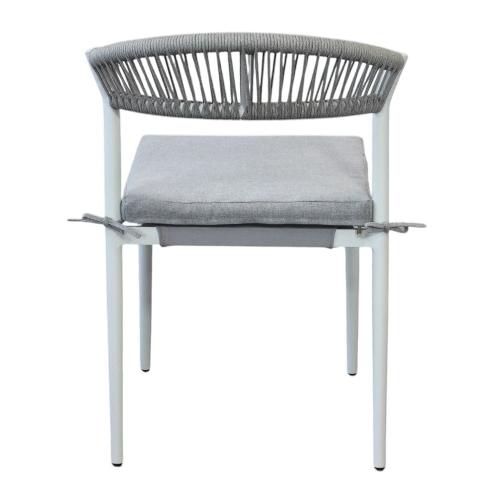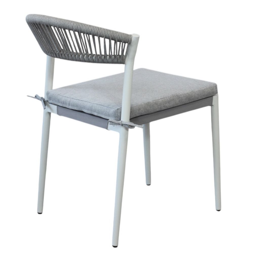 Sedia da esterno con struttura in alluminio, schienale in corda e seduta in textilene. Comoda e resistente, con cuscini sfoderabili per una facile manutenzione. Disponibile nei colori bianco e antracite, si adatta a qualsiasi ambiente esterno, offrendo comfort e stile.